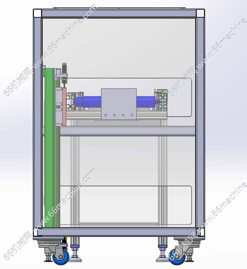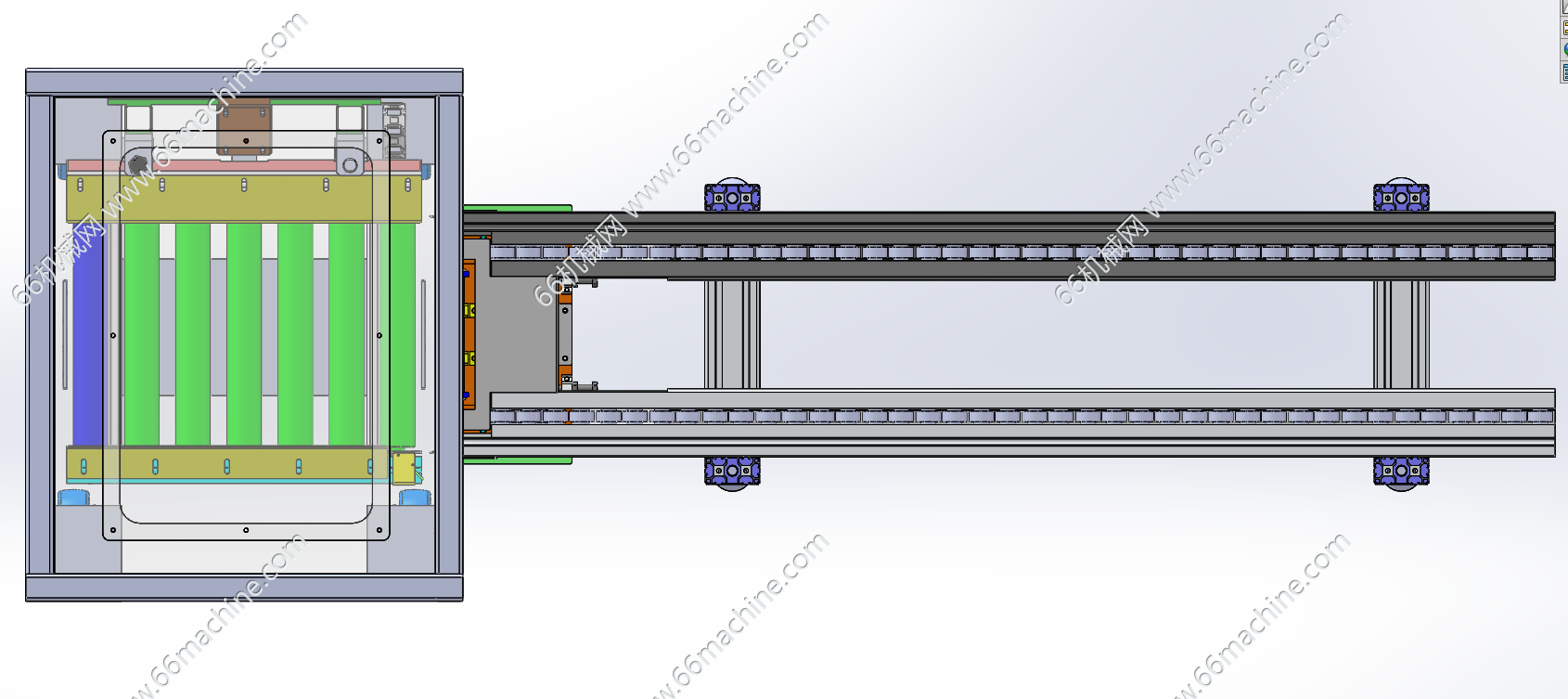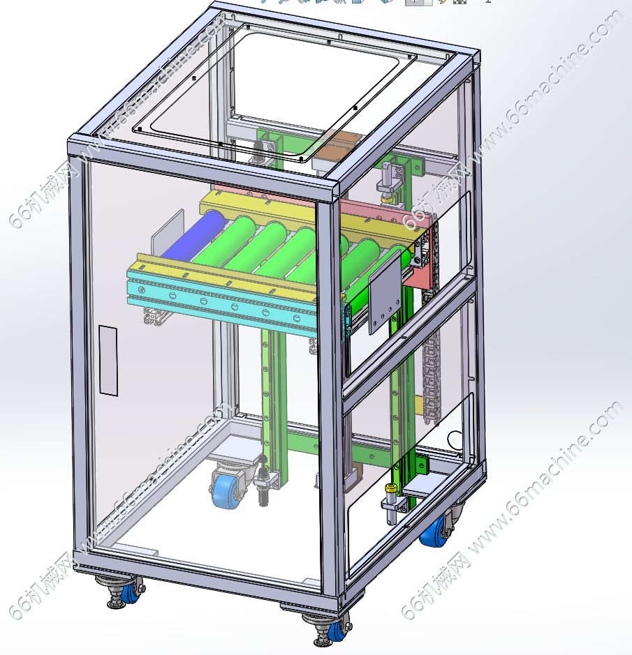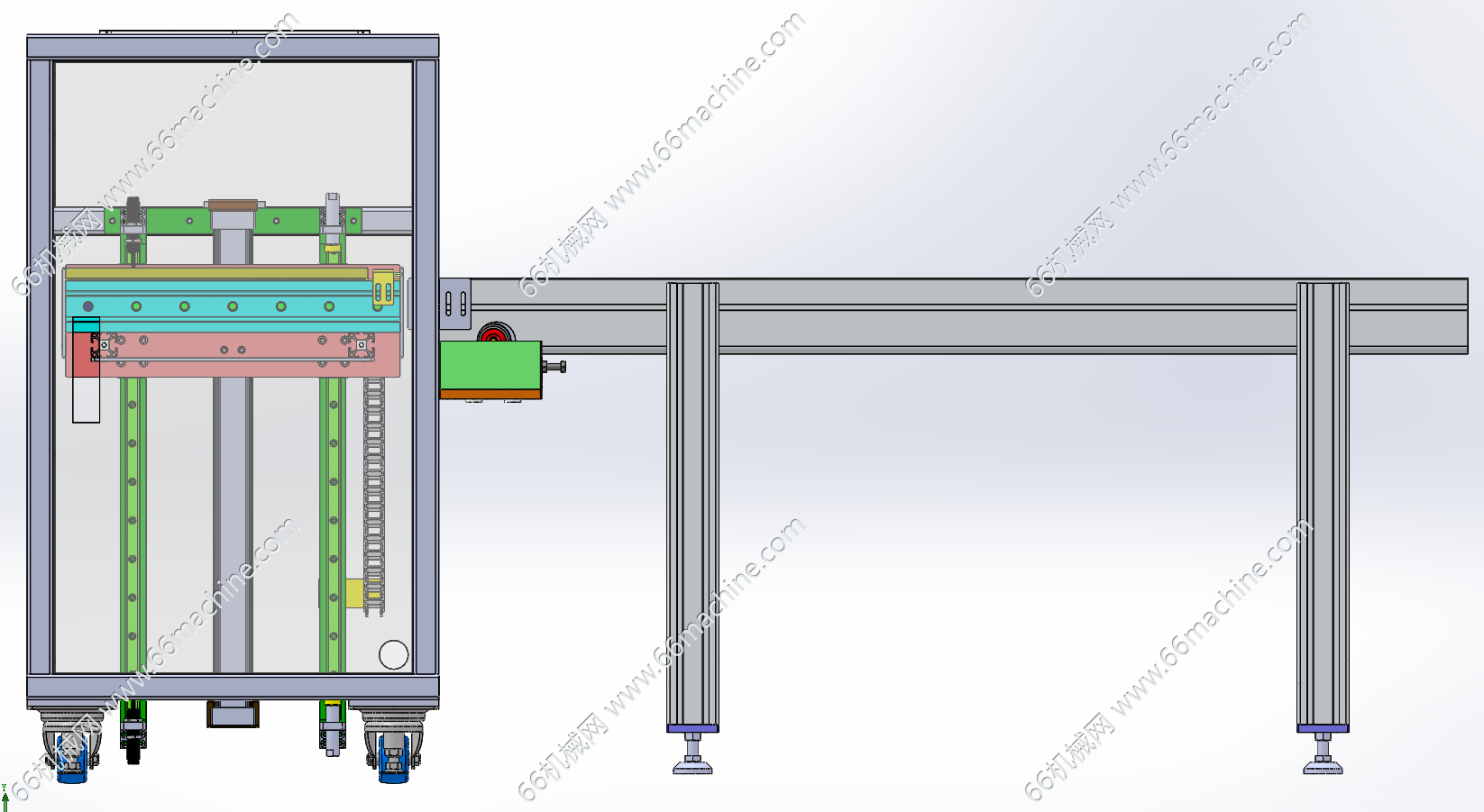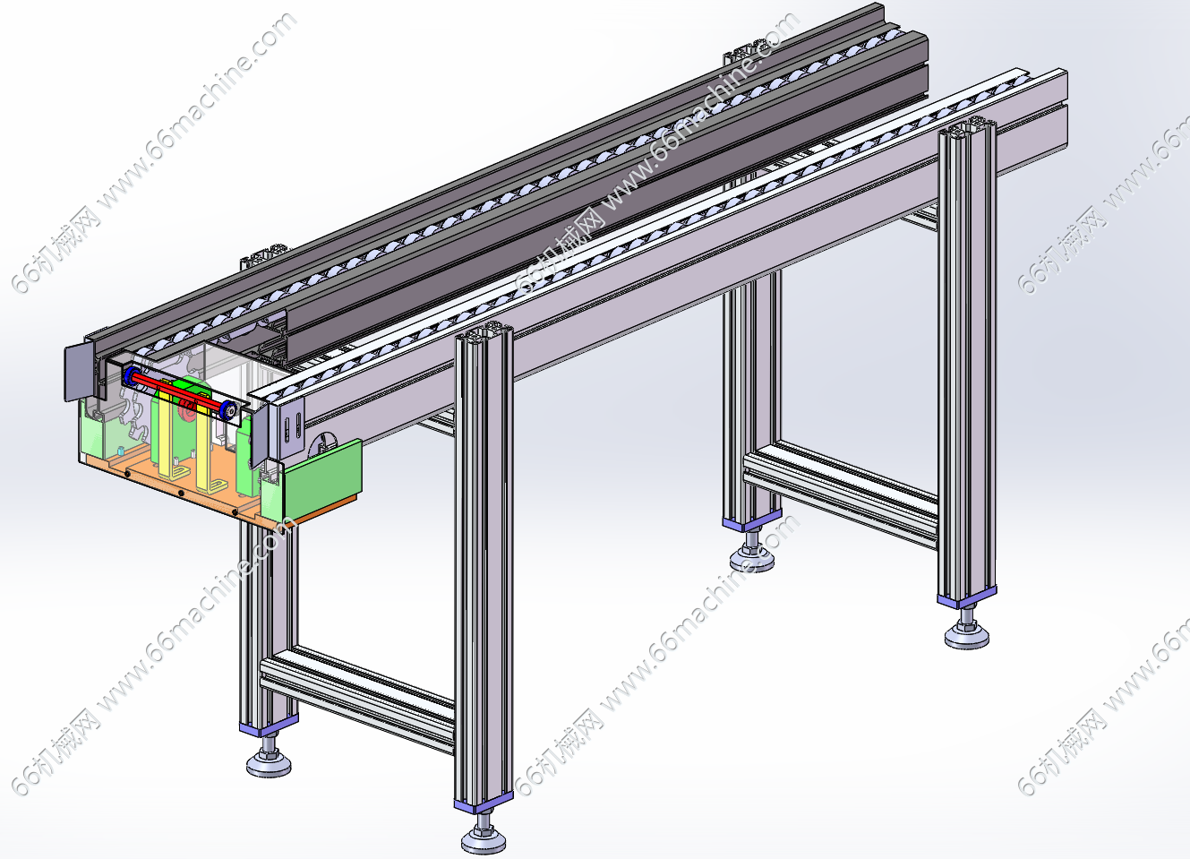 本模型为带升降机的倍速链,升降机采用无杆气缸搭配双导轨结构实现上下动作,升降台为滚筒线,便于工件/载具的流入/流出,升降机底部设有滚轮便于转移!