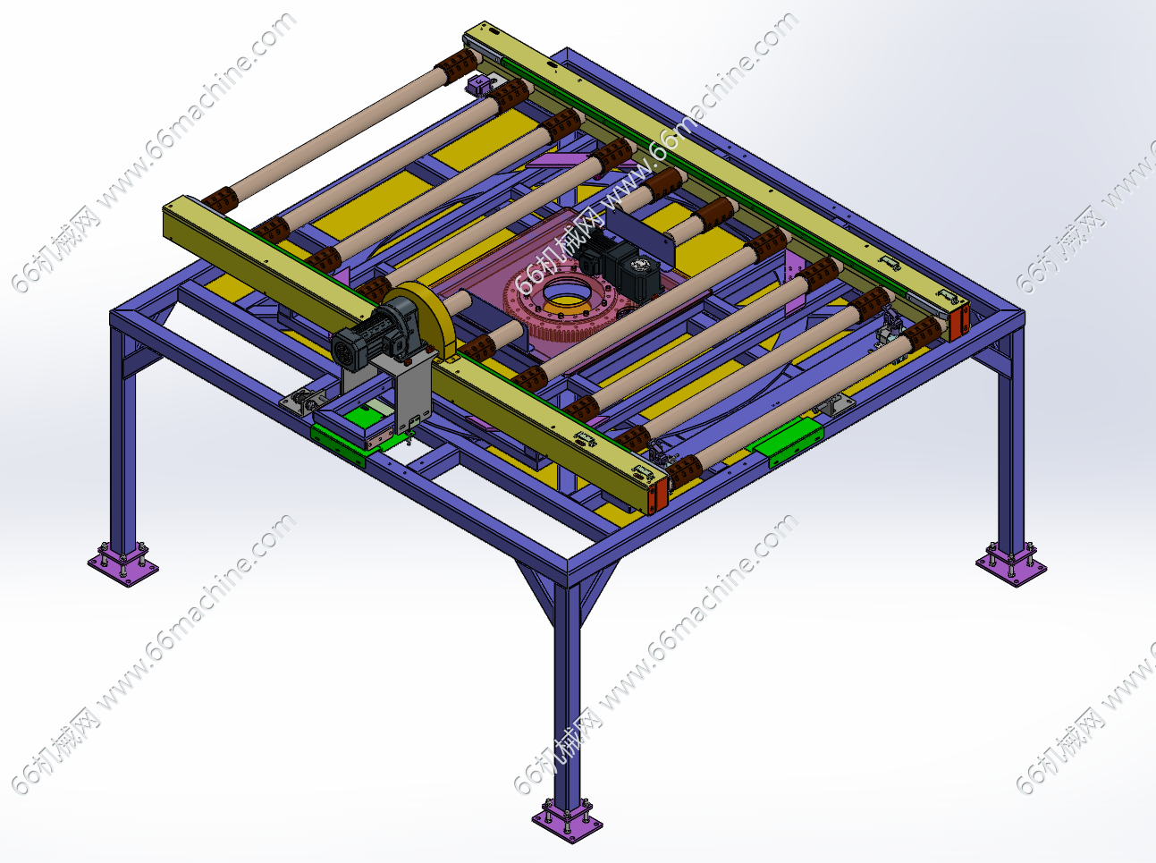 本模型为基于齿轮齿盘的旋转滚筒输送线,采用伺服电机驱动小齿轮进而驱动齿盘旋转实现滚筒线的360度旋转,广泛用于物流、工厂流水线上物料的转向,欢迎参考!