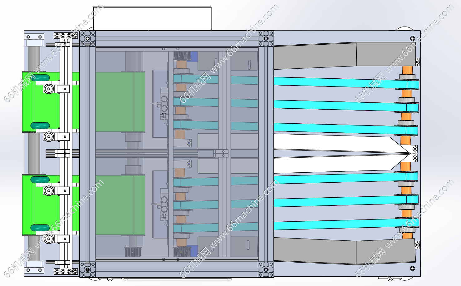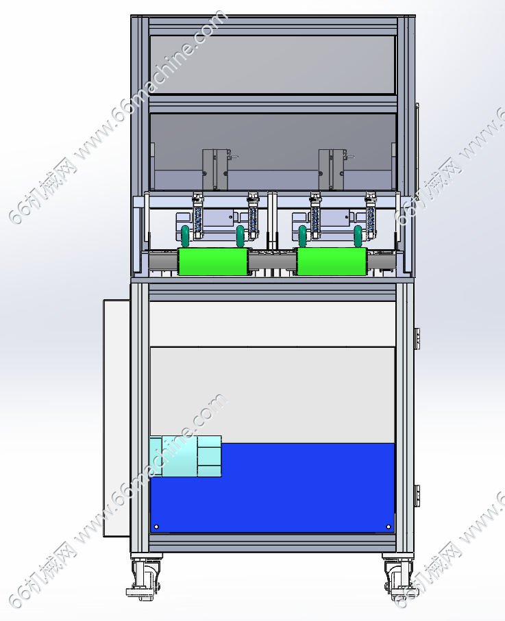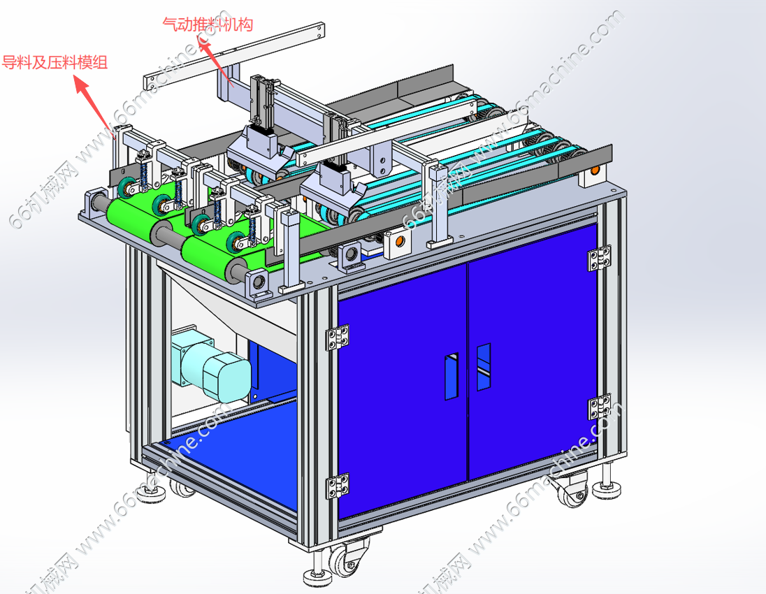 本模型为带气动剔除的输送机,主要由下机架、机罩、2组同步带输送线、组成,主要用于产品的在线式挑选剔除作业,常与视觉相机搭配使用,欢迎下载参考!