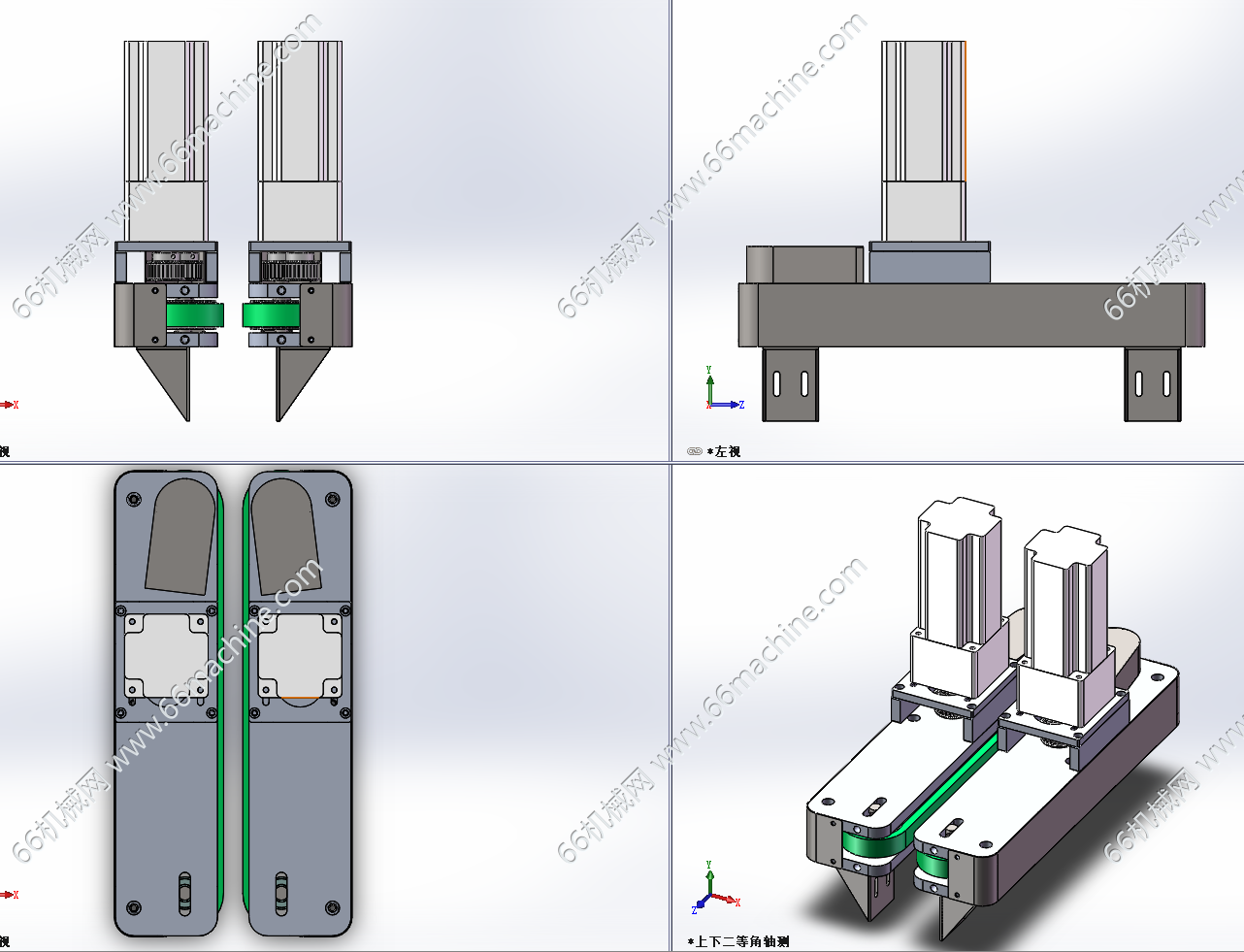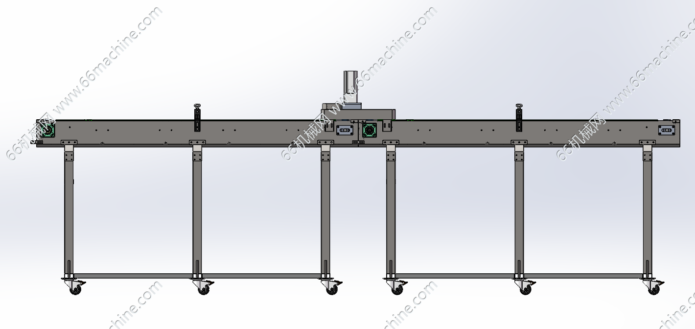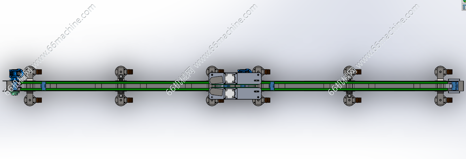 这是一台夹瓶输送带的对接方案图,对于尺寸小的瓶子,普通输送带的对接方式可能会导致瓶子摔倒从而使整条生产线停止运行,所以在两条输送带对接的地方,使用这种夹瓶方式辅助瓶子通过,使得生产线的运行更加稳定。
