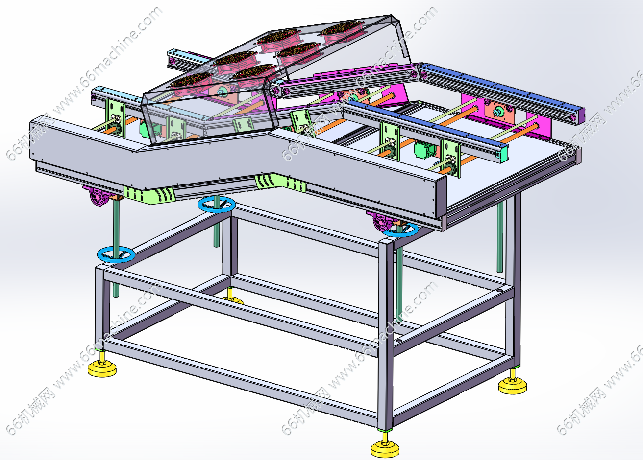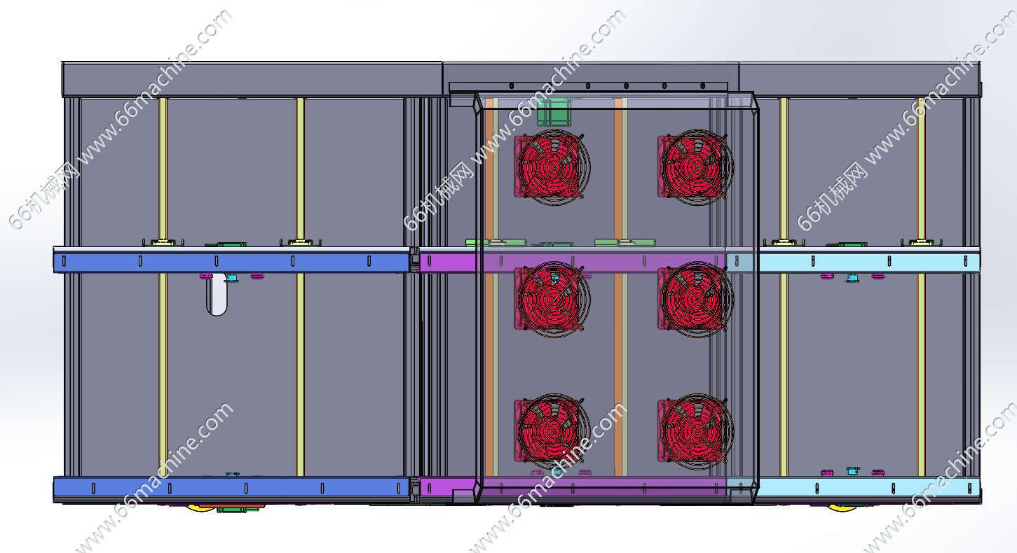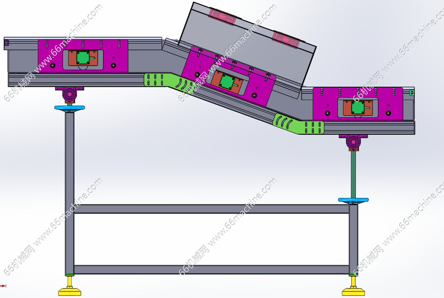 本模型为间距可调式升降爬坡线,丝杠进行间距调节,升降采用手轮丝杠结构,可将皮带线调为倾斜式或水平式,带有散热风扇,为流动托盘上的物品进行散热,欢迎参考!