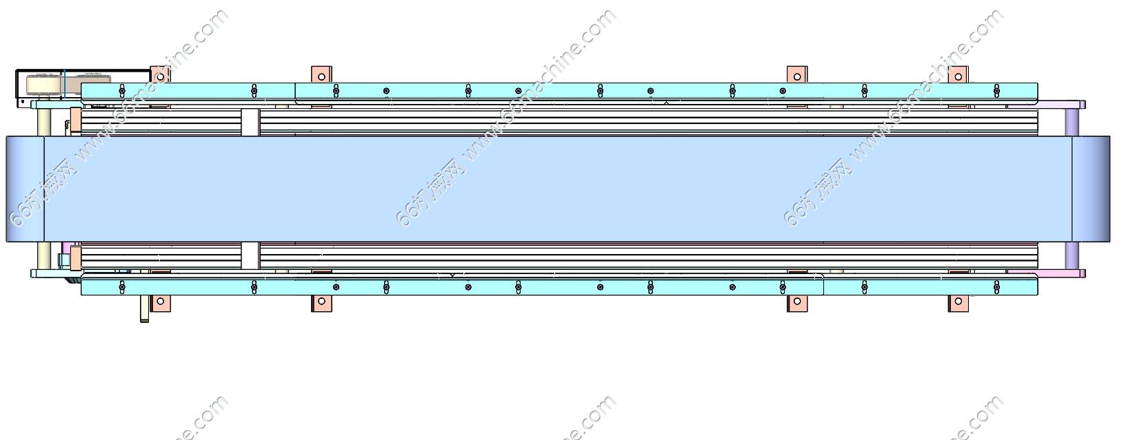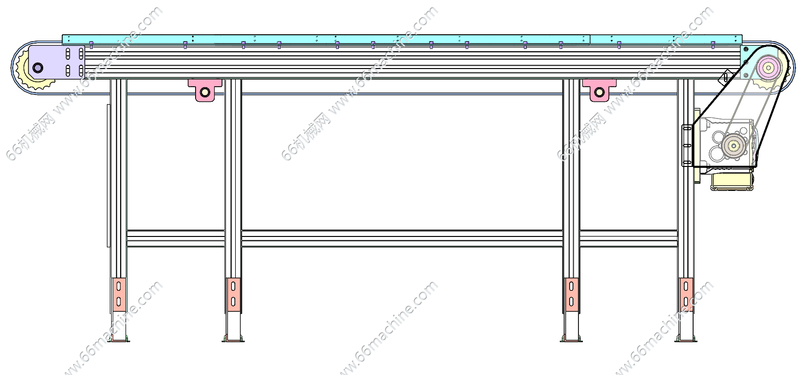 本模型为皮带输送机(皮带线),又叫皮带式流水线,带式输送机或胶带输送机,是组成有节奏的流水作业线所不可缺少的经济型物流输送设备。皮带机按其输送能力可分为重型皮带机如矿用皮带输送机,轻型皮带机如用在电子塑料,食品轻工,化工医药等行业。皮带输送机具有输送能力强,输送距离远,结构简单易于维护,能方便地实行程序化控制和自动化操作。