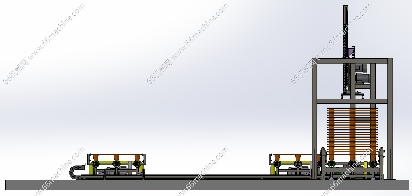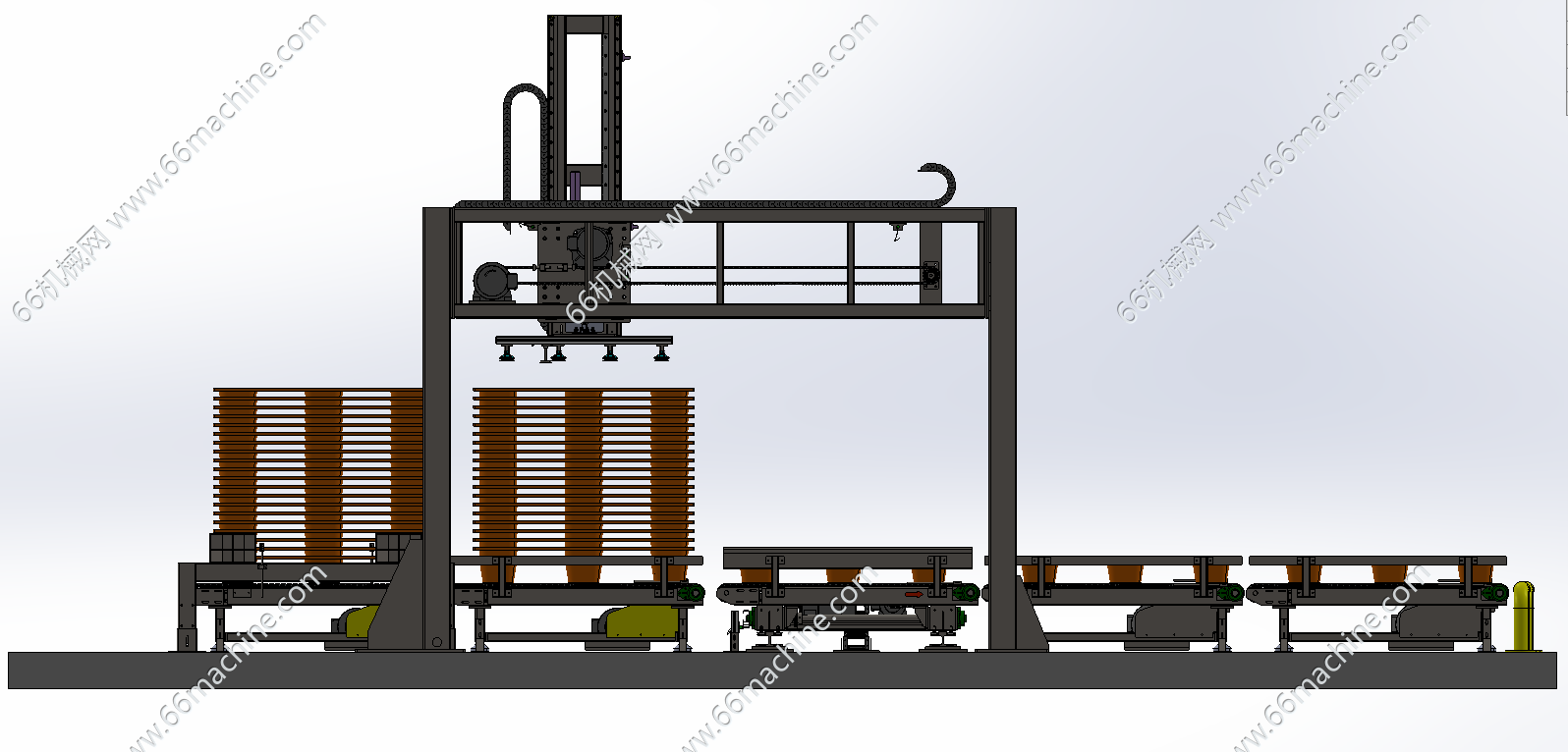 本模型为下线码垛输送线,是由轨道横移输送机、链条输送机、胶栈板平移机(吸取搬运机)等组成的集成化输送系统。用于完成包装的成品(包装件、袋装产品、砖块等)自动输送、整理、堆叠至托盘上,形成整齐垛形后输出至仓储或物流环节,是连接“生产完成”与“仓储物流”的关键衔接环节。