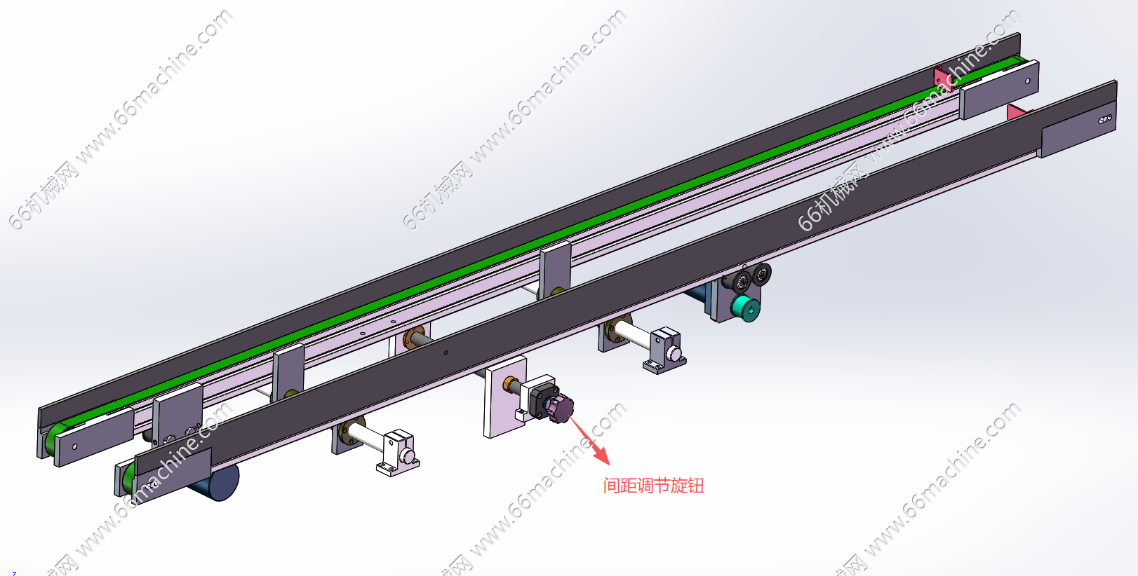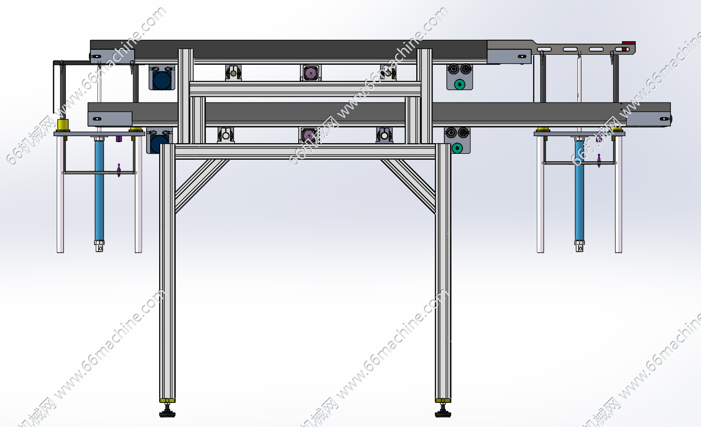 本模型为带顶升的间距可调式双层输送线,主要由间距可调式上层输送线、间距可调式下层输送线及顶升机构组成,顶升机构设在输送线两端,适用于载具(托盘)的上下循环输送,欢迎参考!