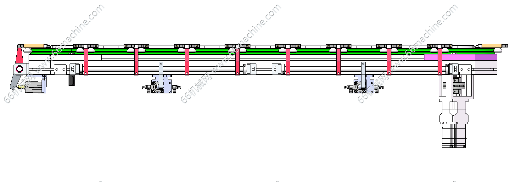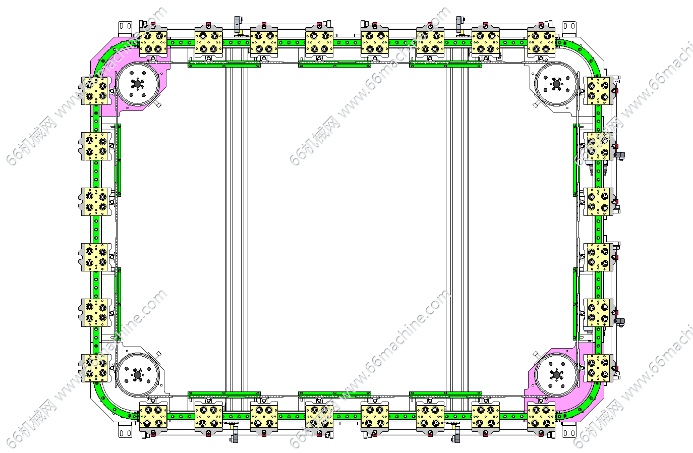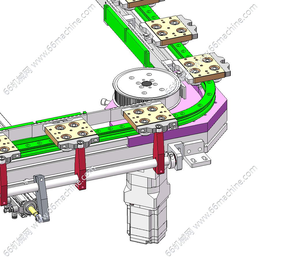 本模型为28工位矩形环形轨道,是通过一个电机带动用同步带和同步轮固定的矩形轨道,优点是4个角都可以随机装电机,根据位置不同装配 。外侧面有气缸带动连杆驱动治具校准限位机构。