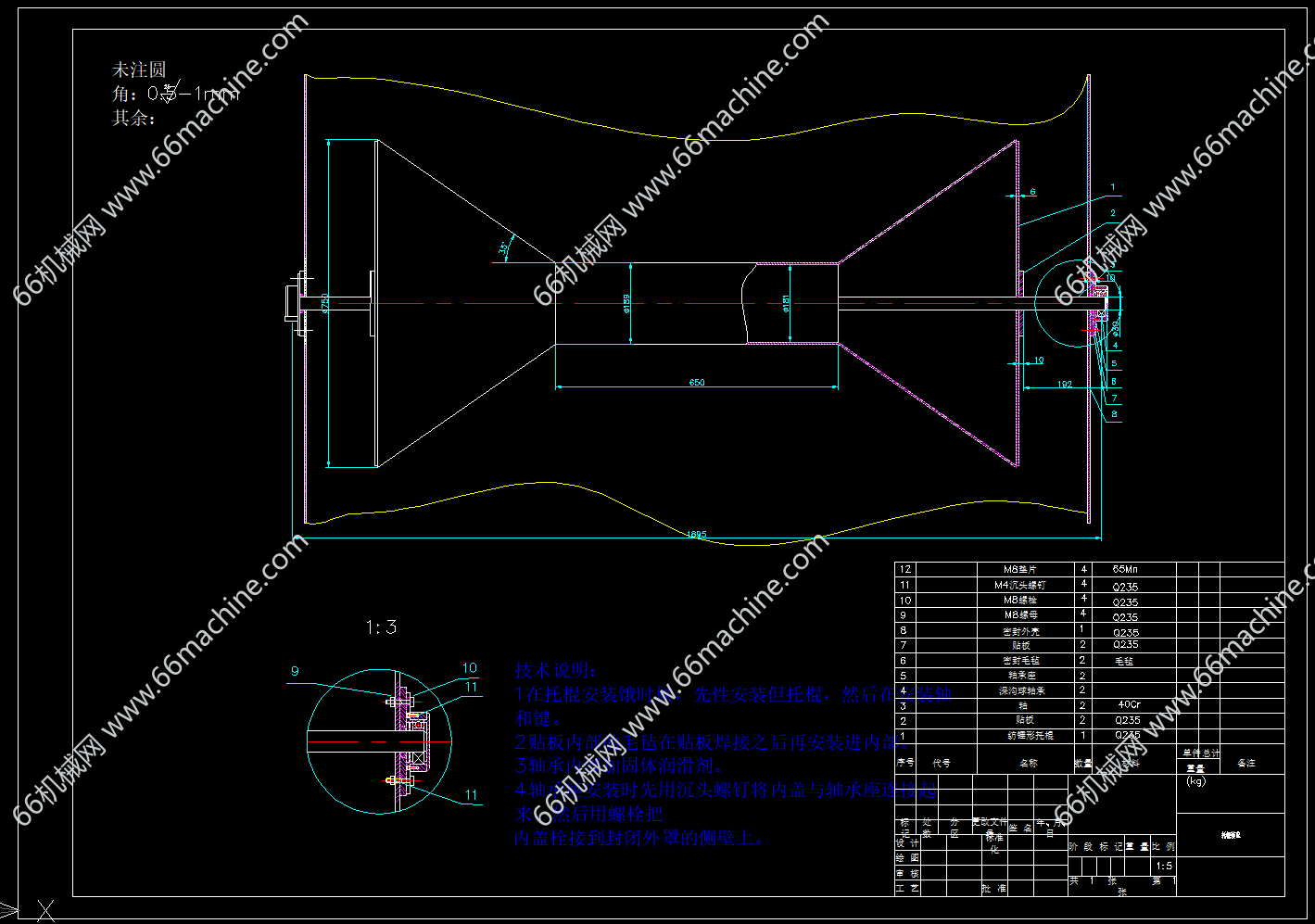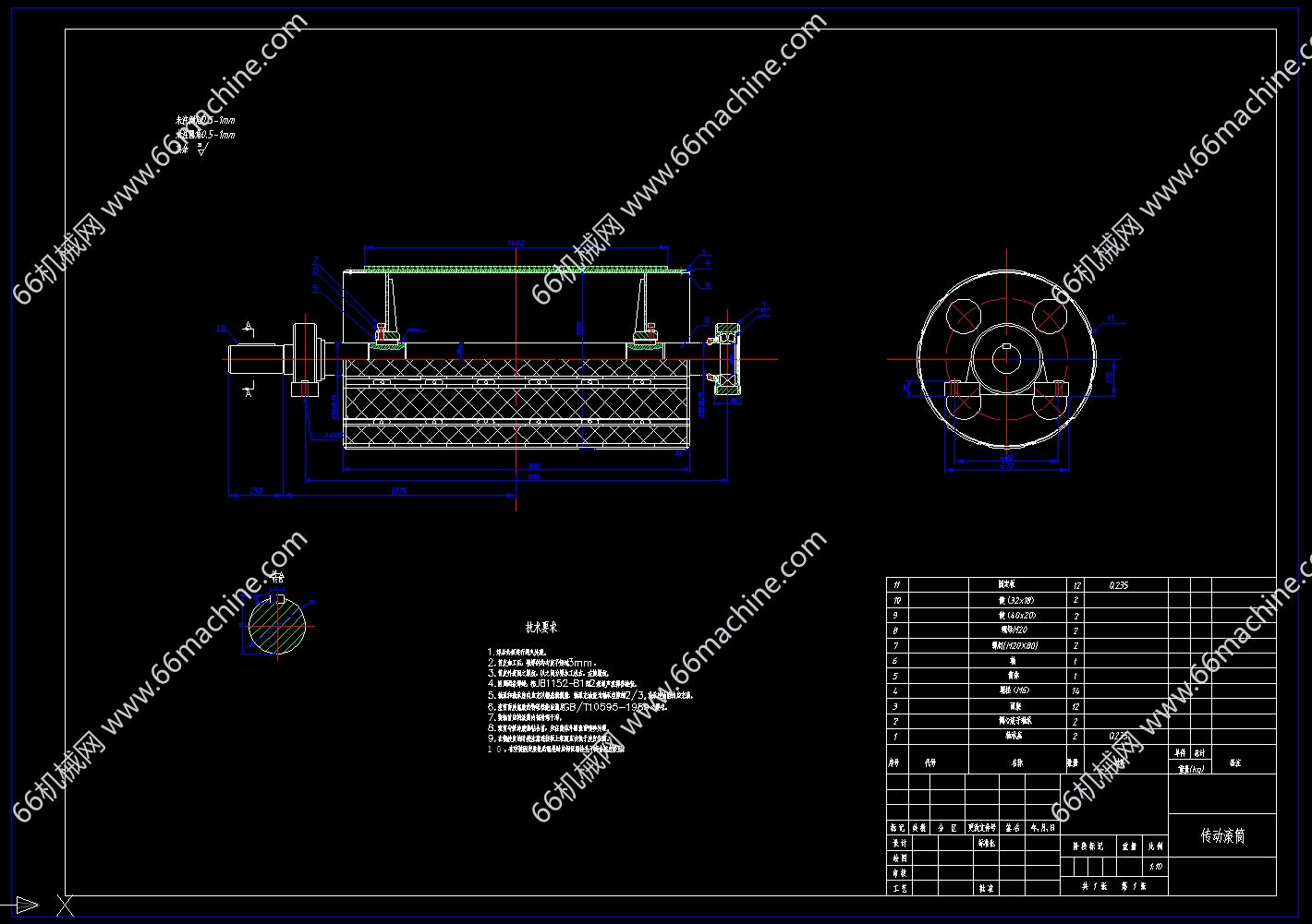 本图纸为带式输送机,主要传输机构是输送带,主要由以下部件组成:传送带、滚筒、中间接头、减速机、张紧装置、换向滚筒等。含有详细的CAD装配图和零件图。