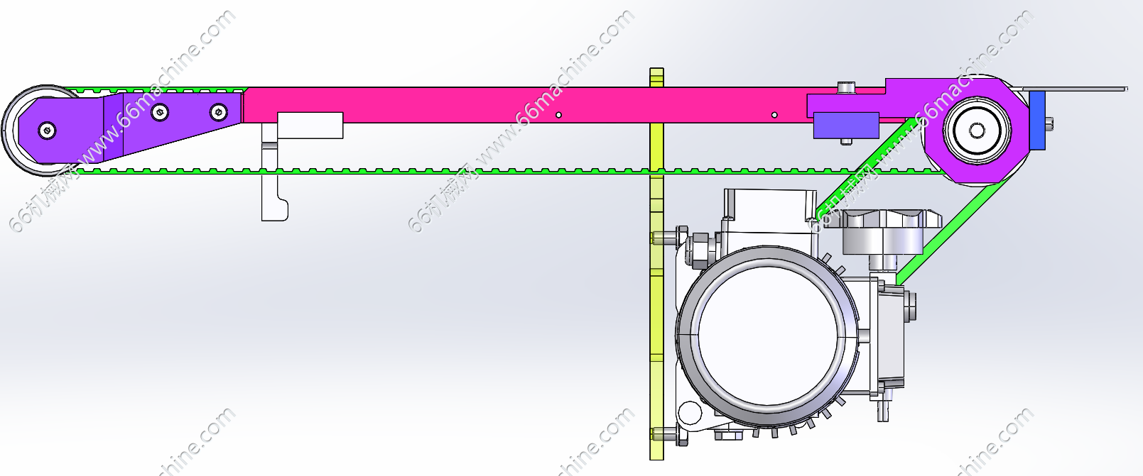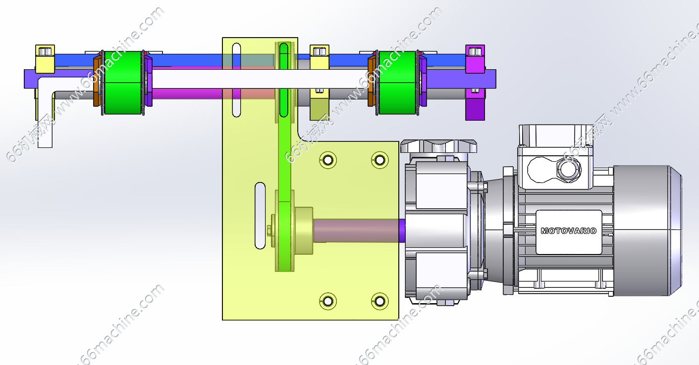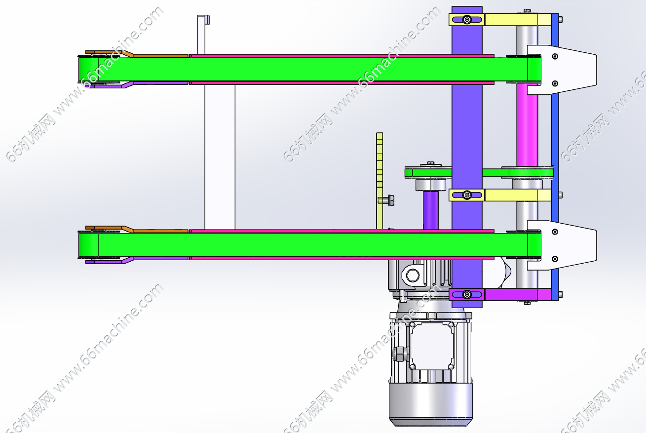本模型为双列皮带输送机,两侧有固定支架支撑同步带,两头固定同步轮,同步轮通过转轴连接,电机经过皮带条驱动轴旋转。适用于托盘、规则箱体的输送,欢迎参考!