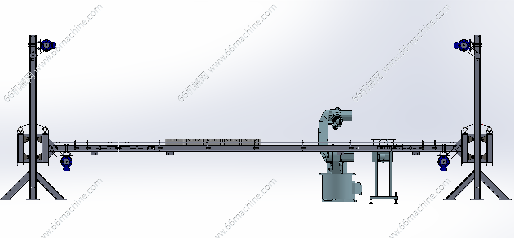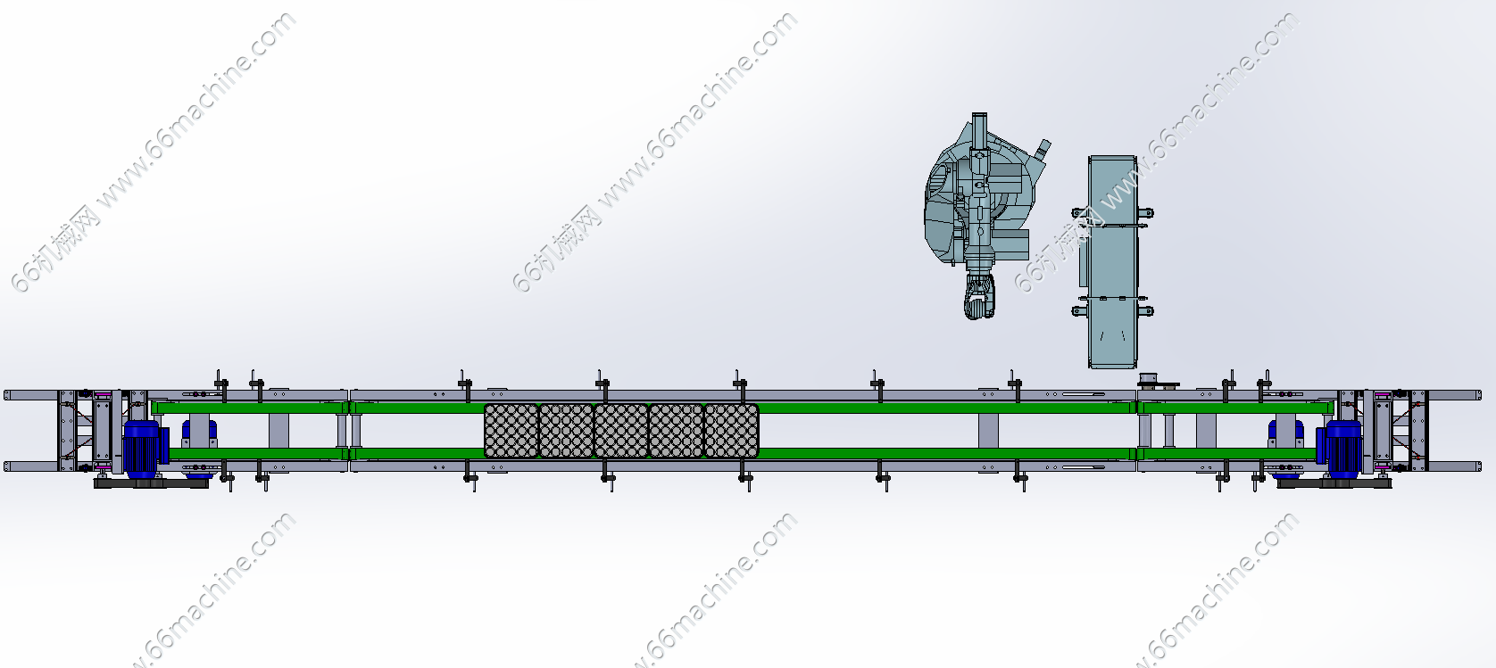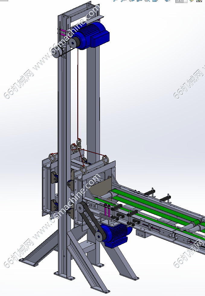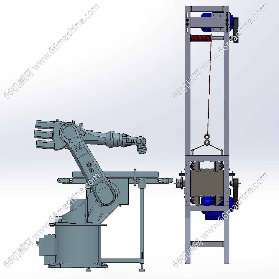 本模型为基于机器人的分选输送线,包含可升降的皮带输送线、机器人、出料皮带线,升降采用电机驱动卷线模组,机器人从载盘分选良品送至出料皮带线流出。