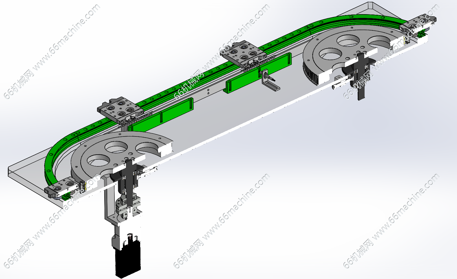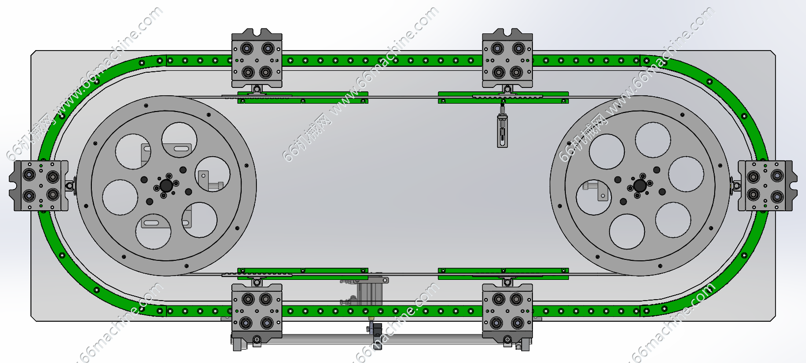 本模型为6工位椭圆同步带环形导轨,采用伺服电机驱动带轮旋转进而带动滑座旋转,采用V23导轨,圆弧直径500mm,该环形导轨结构简洁,重复定位精度高,欢迎下载参考!