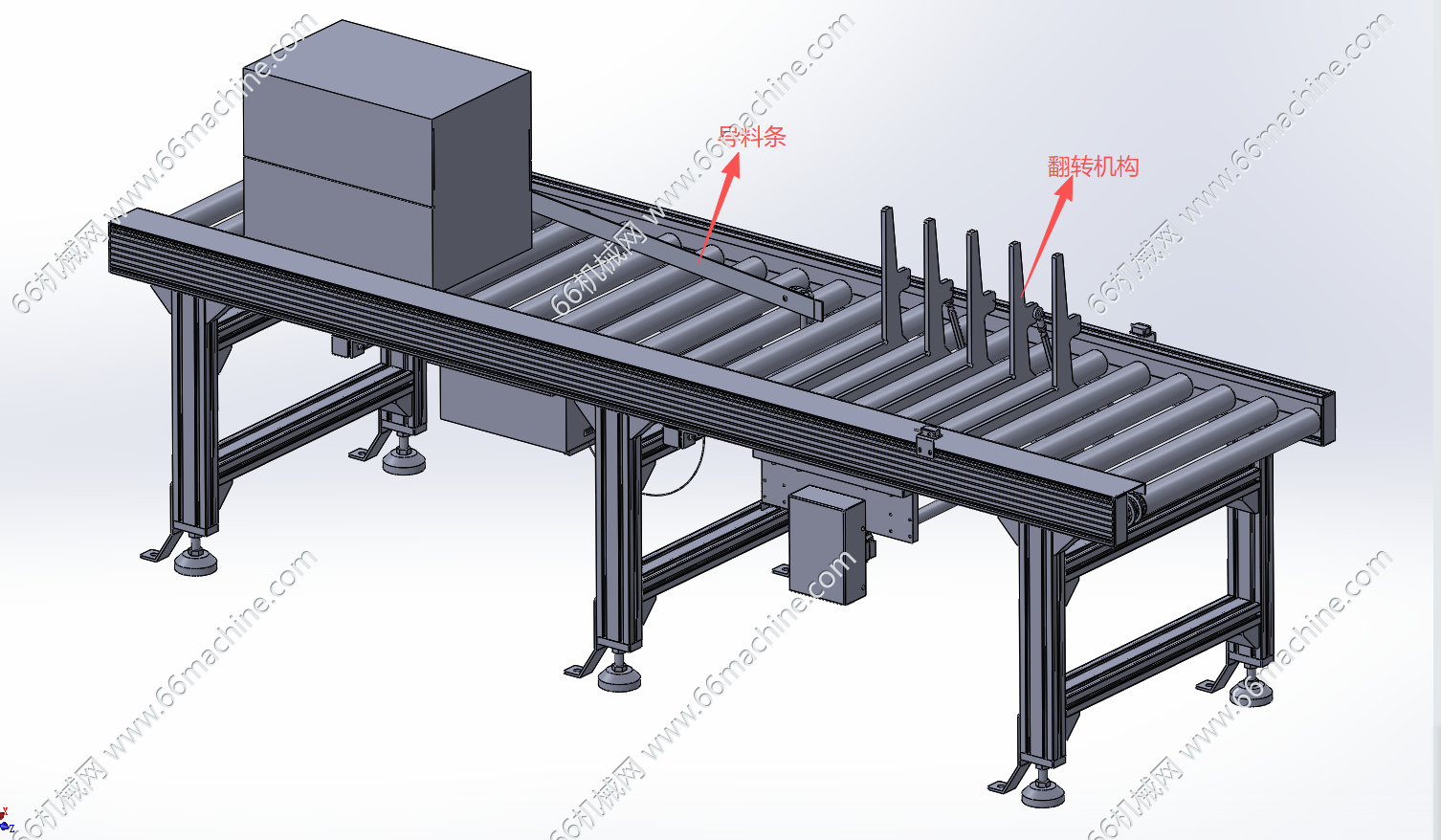 本模型为90度翻箱机构,通常被称为翻箱机或箱体翻转机。其核心功能是接收一个处于某种姿态(如开口朝上)的满载或空载箱体,通过机械臂或翻转框架,将其稳定、可靠地绕水平轴旋转90度,变换为另一种所需姿态(如侧面朝下、开口朝向侧面等),以便进行后续的装箱、倒料、码垛、检查或输送等工序。它以动作平稳、定位精确、承载能力强、安全互锁为核心特点。