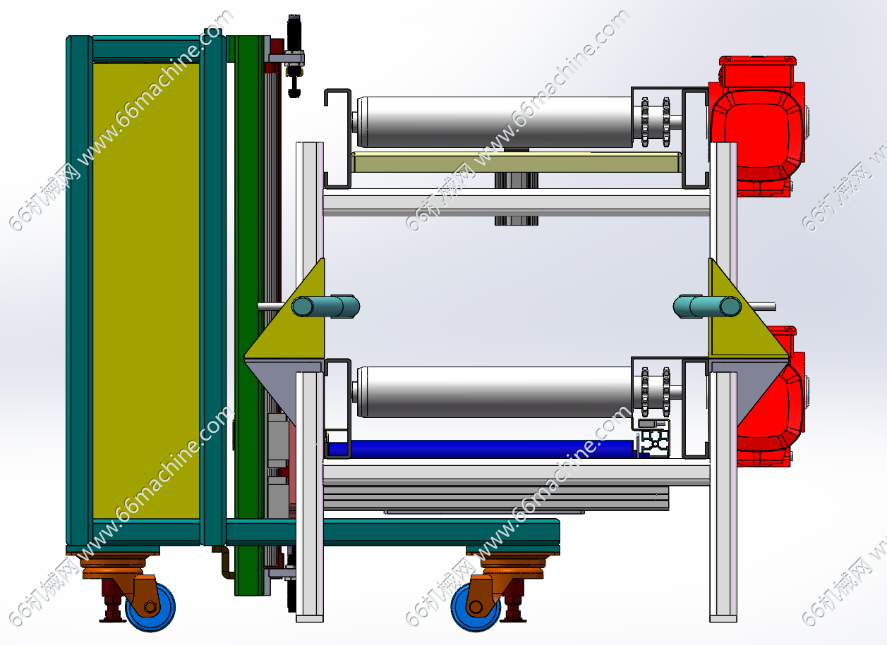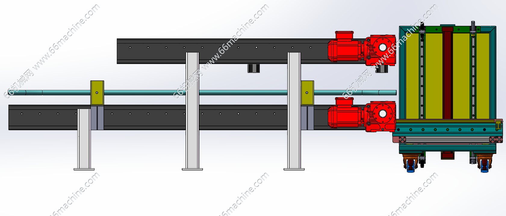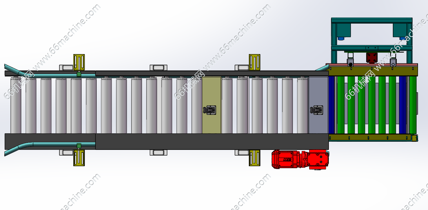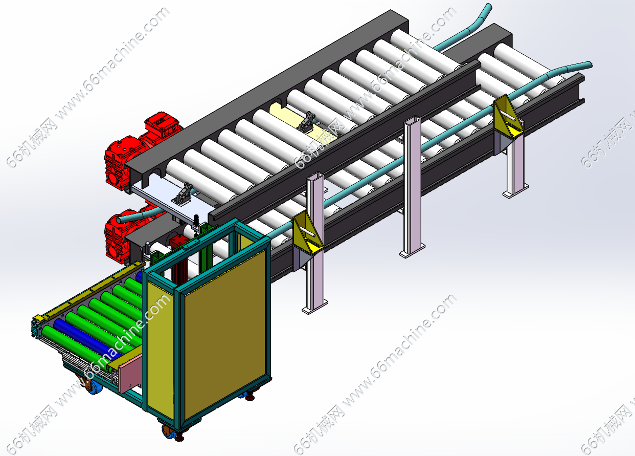 本模型为带升降机的双层滚筒线,升降采用无杆气缸搭配双导轨结构实现上下动作,升降台为滚筒线,便于工件的流入/流出,该输送线适用于托盘的上下循环!