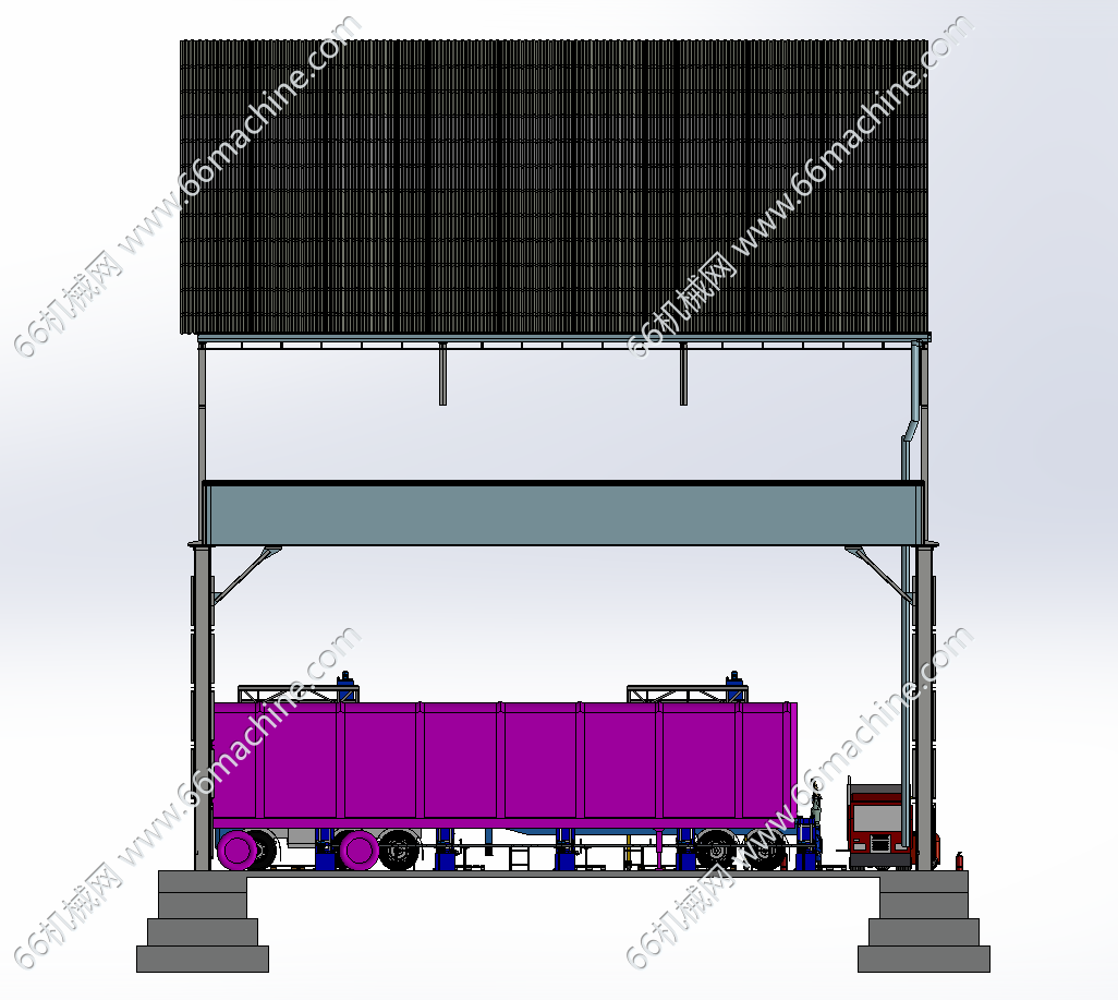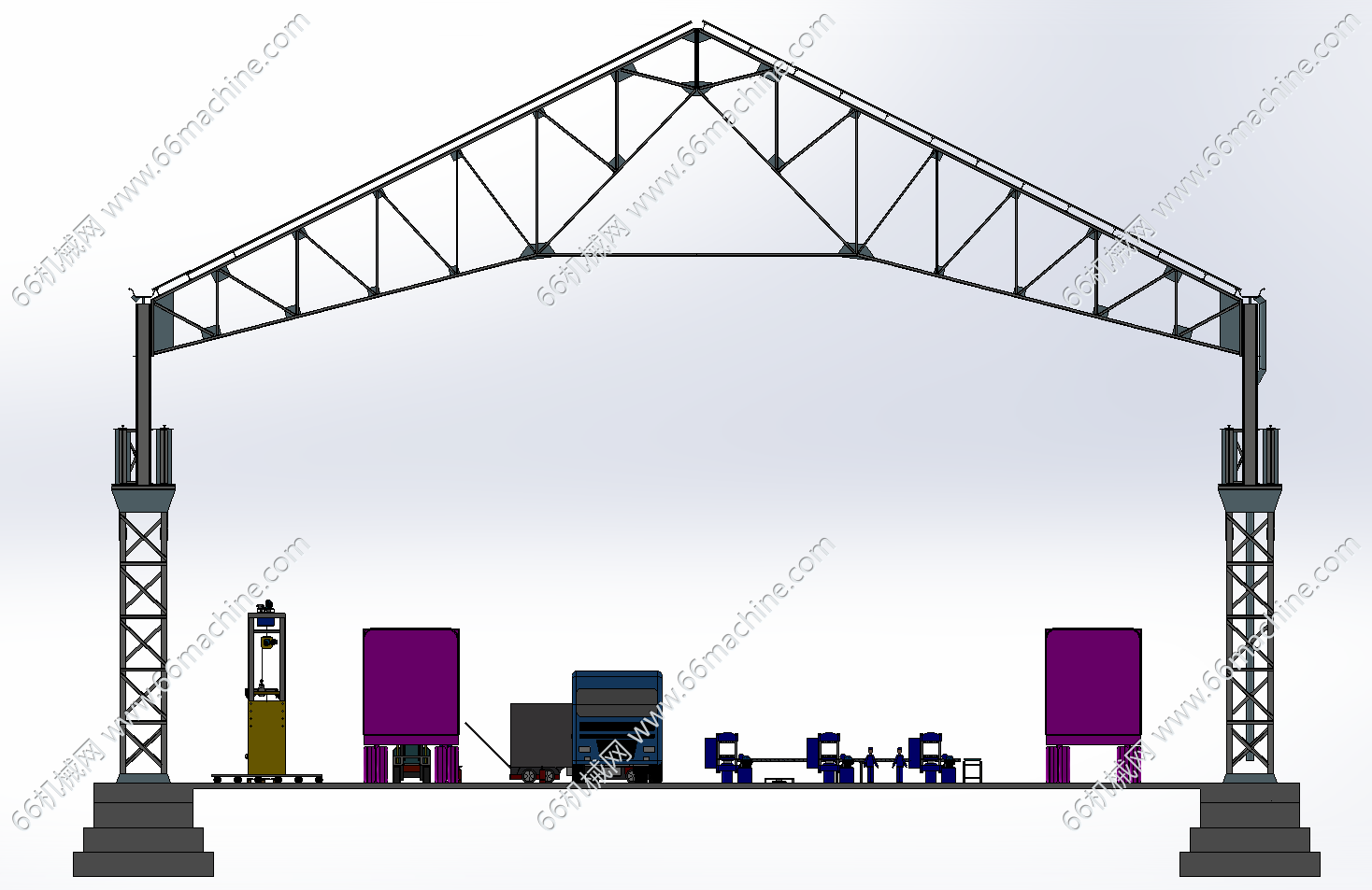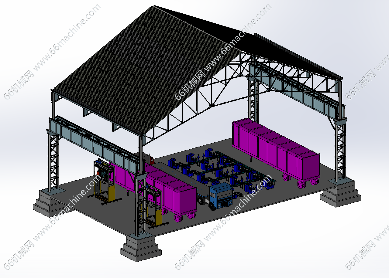 本模型为铁路及公路联运的物流中转站,用于集装箱的自动化装卸与转运。大型钢结构棚下,叉车与输送装置配合,实现集装箱在铁路货车、公路卡车之间的快速装卸与转运,提升物流中转的效率,减少货物装卸的时间成本。