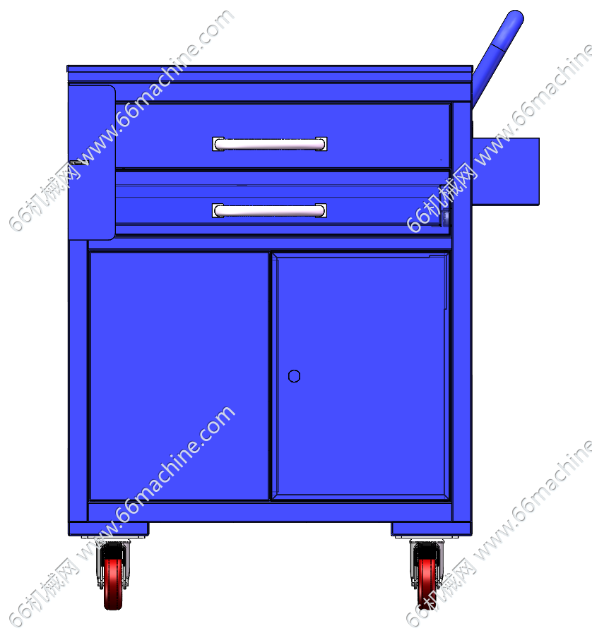 本模型为工具小推车,尺寸W600*D450mm*H810mm,配2个抽屉、下配对开门小柜,底部配四个万向脚轮带刹车。顶部可放一些大件、重件及油污件,中部可放测量工具、小的零件等,下部可放大型工具,如电钻、角磨机等。广泛用于各种生产车间。