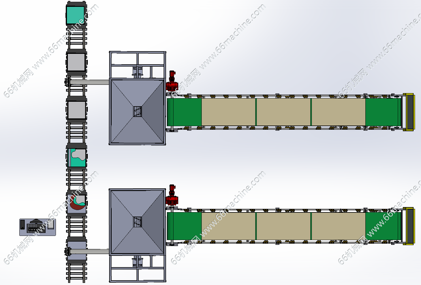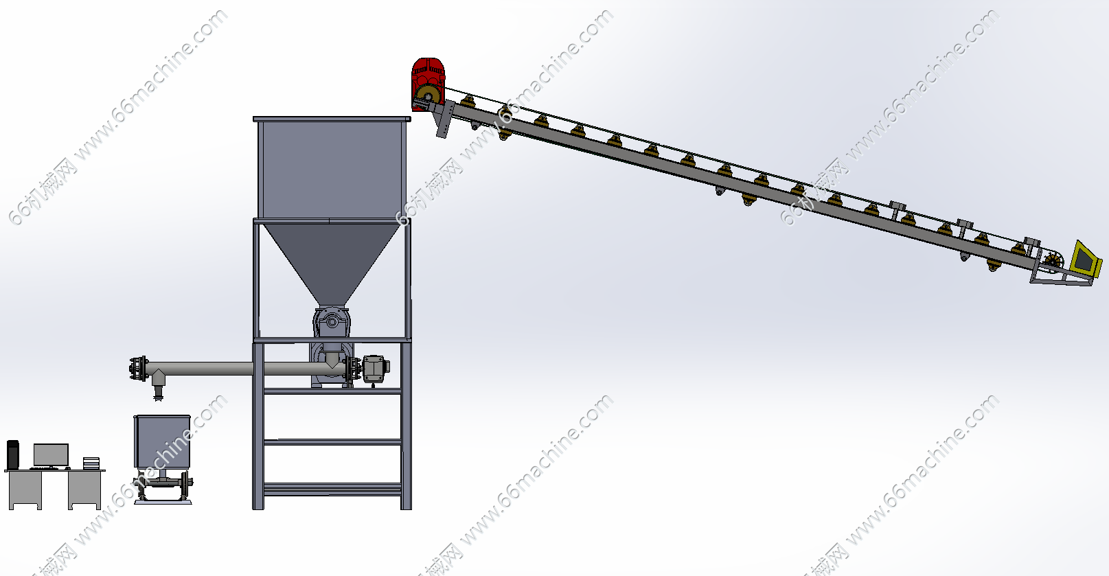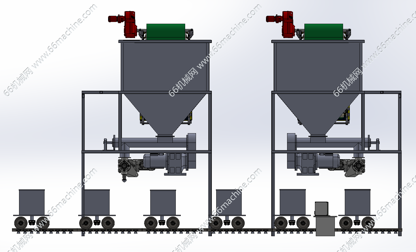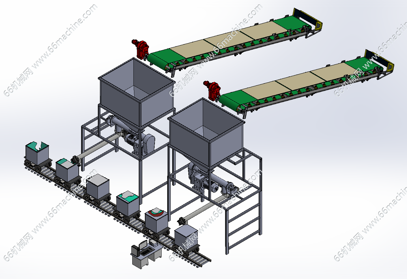 该系统用于粮食(稻谷、小麦)的自动化输送与分装,通过输送装置将粮食输送至不同的分装区域,轨道上的料车则负责将分装后的粮食转运至后续加工或存储环节。