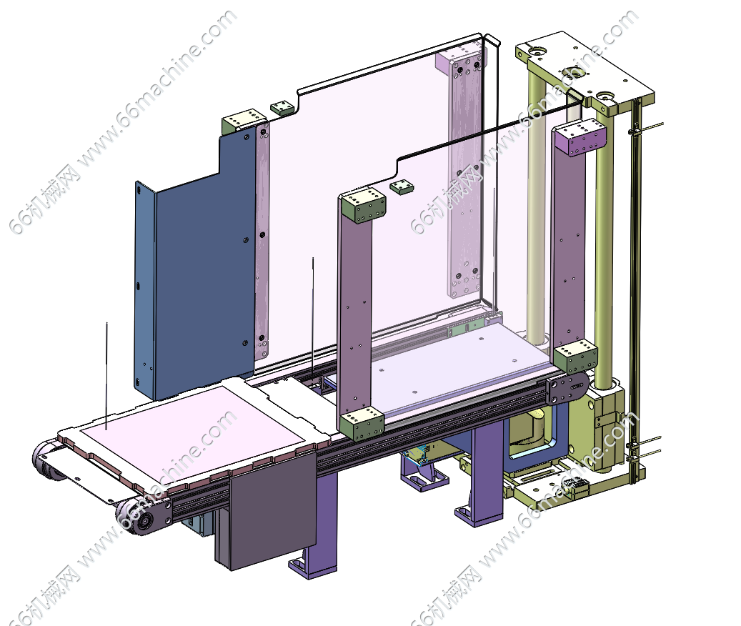 本模型为托盘输送线及升降机构,输送线用于托盘的输送,输送线末端设有升降机构,升降采用伺服电机经过带传动驱动丝杠旋转实现升降,实现托盘在线收料,欢迎参考!