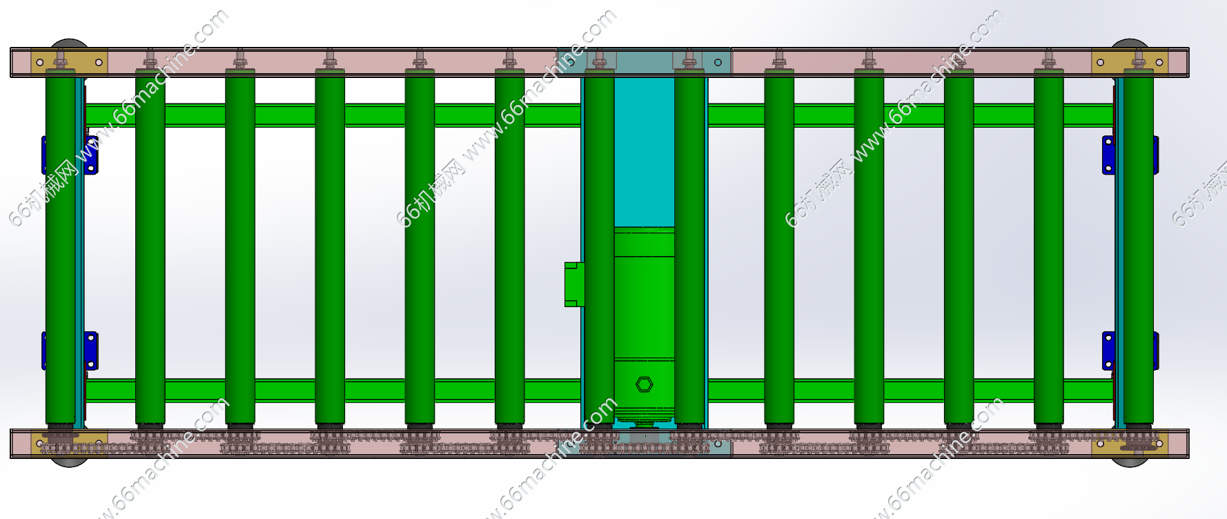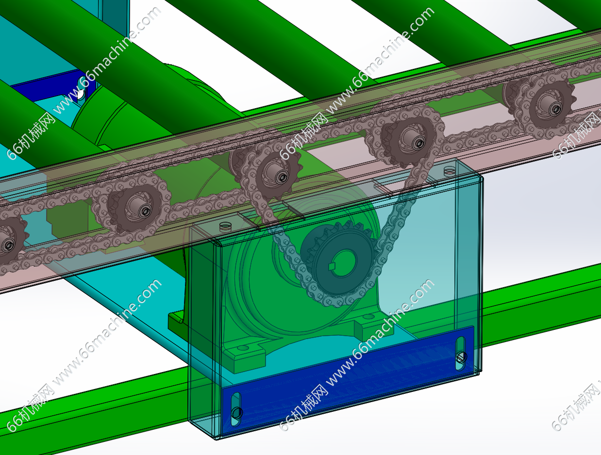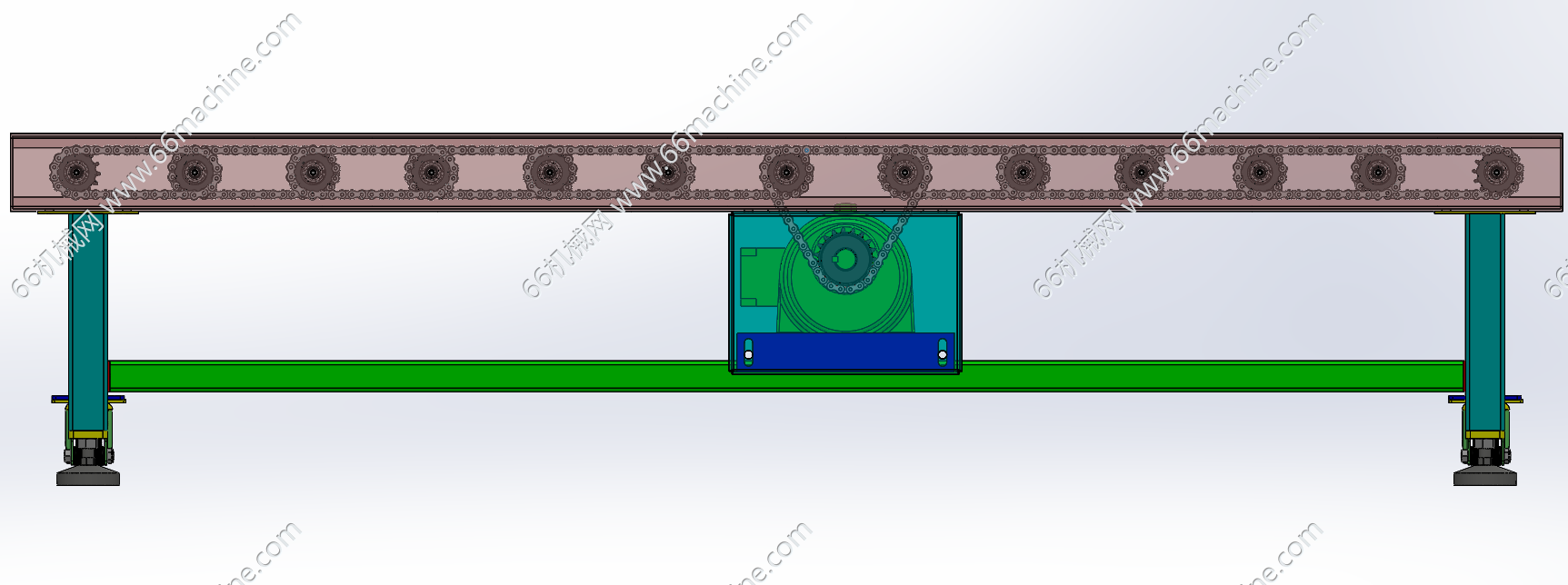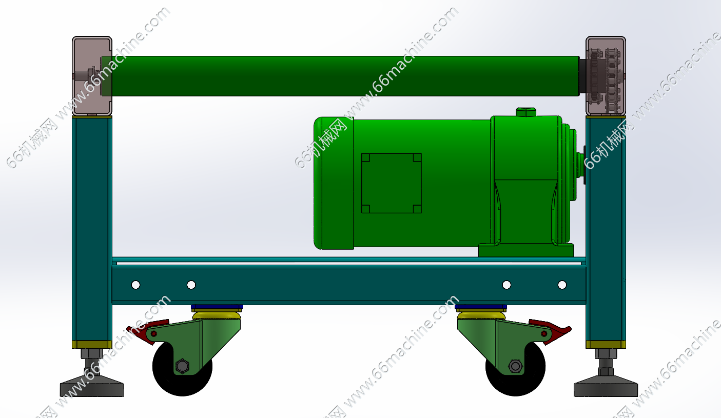 本模型为可移动型动力辊道输送机,采用电机经过链传动驱动,能主动带动所有辊筒旋转,实现物料的自动输送。机架底部配有脚轮和可调节脚杯:脚轮用于设备的整体移动,方便临时部署;脚杯则在设备就位后锁死并调平,保证输送时的稳定性。