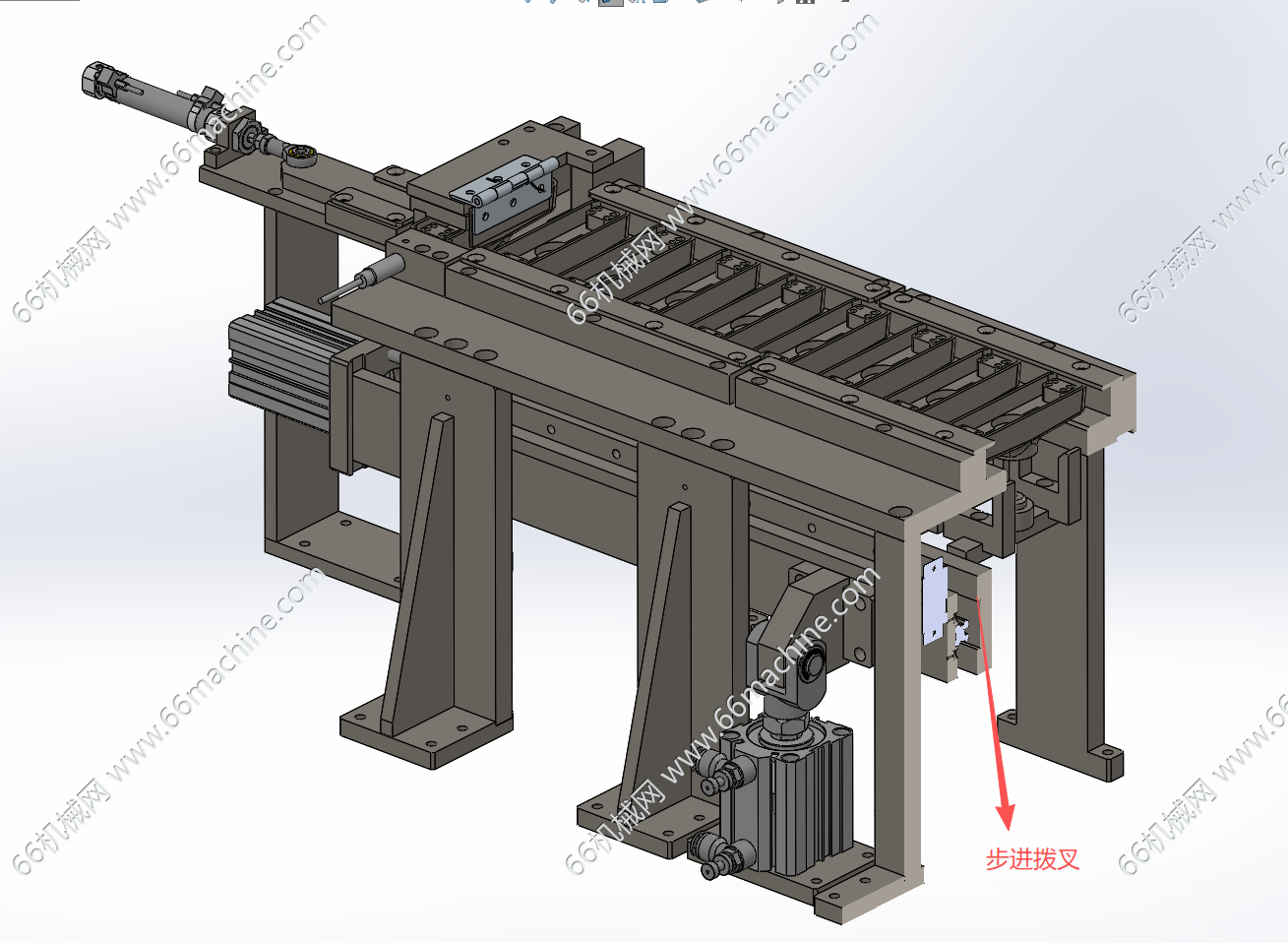 步进拨叉供料机构是指以拨叉(拨料杆)为核心执行元件,通过拨叉的升降运动与水平移动的复合动作,以固定的步进距离将物料沿输送路径间歇式向前推送,从而实现物料从一个工位到另一个工位的“跳跃式”输送的自动化执行单元。