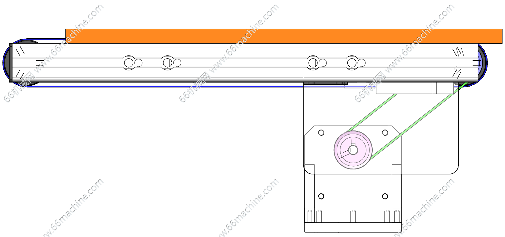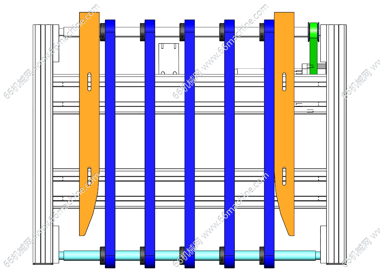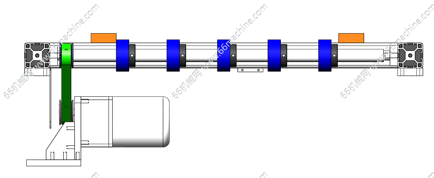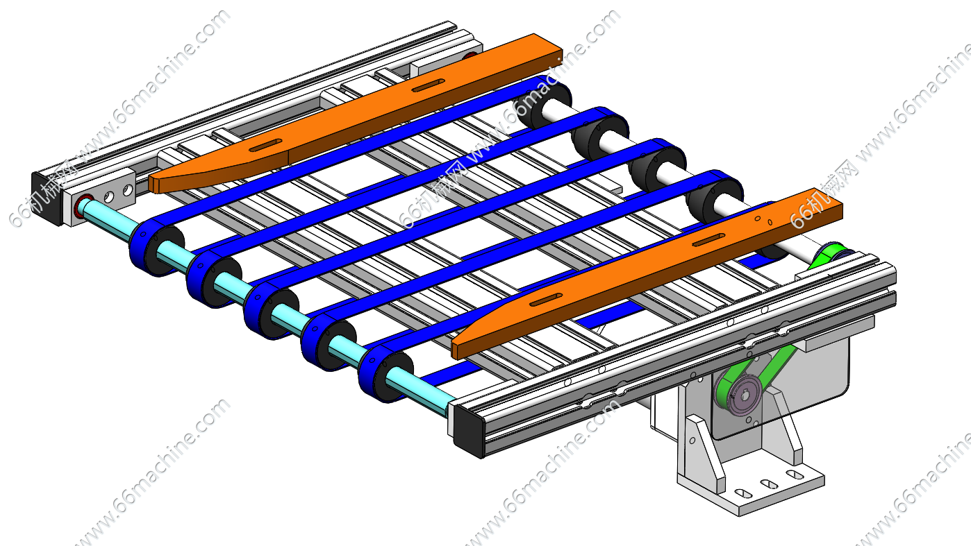 本模型为多道带式输送机,适合面积大重量轻的物品运输,所以采用五根细皮带作为传送机构来代替整面式的传送带,也大大的节约了成本。适用于中短距离、中小负荷的物料输送场景,欢迎参考!