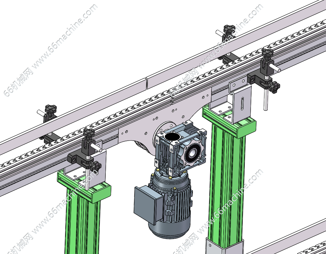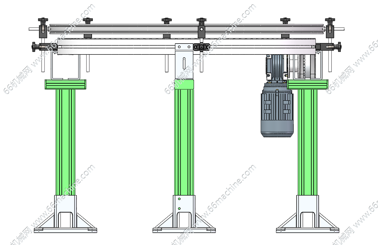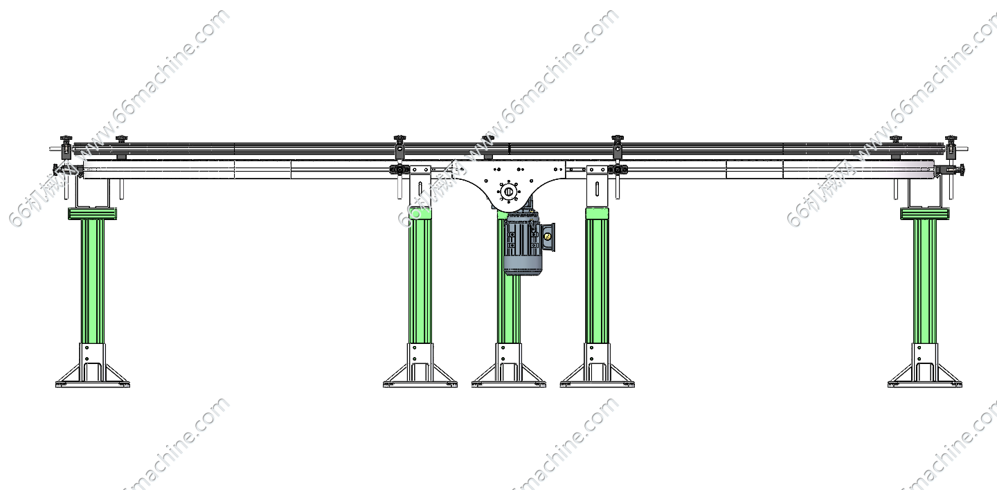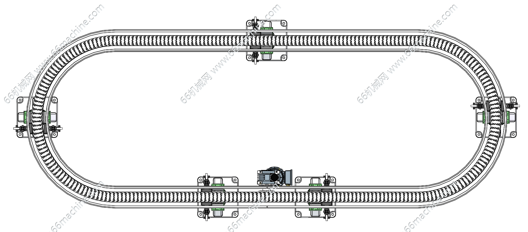 本模型为环形链板输送线,由驱动电机提供动力,带动链板实现物料的连续循环输送;输送线两侧配置可调节挡板支架,可根据物料尺寸调整挡板高度,防止物料偏移掉落,同时搭配多组带固定法兰的支撑立柱,实现稳定安装与高度微调,广泛应用于多工位连续生产场景,兼具空间利用率高、适配性强与运行稳定的特点。