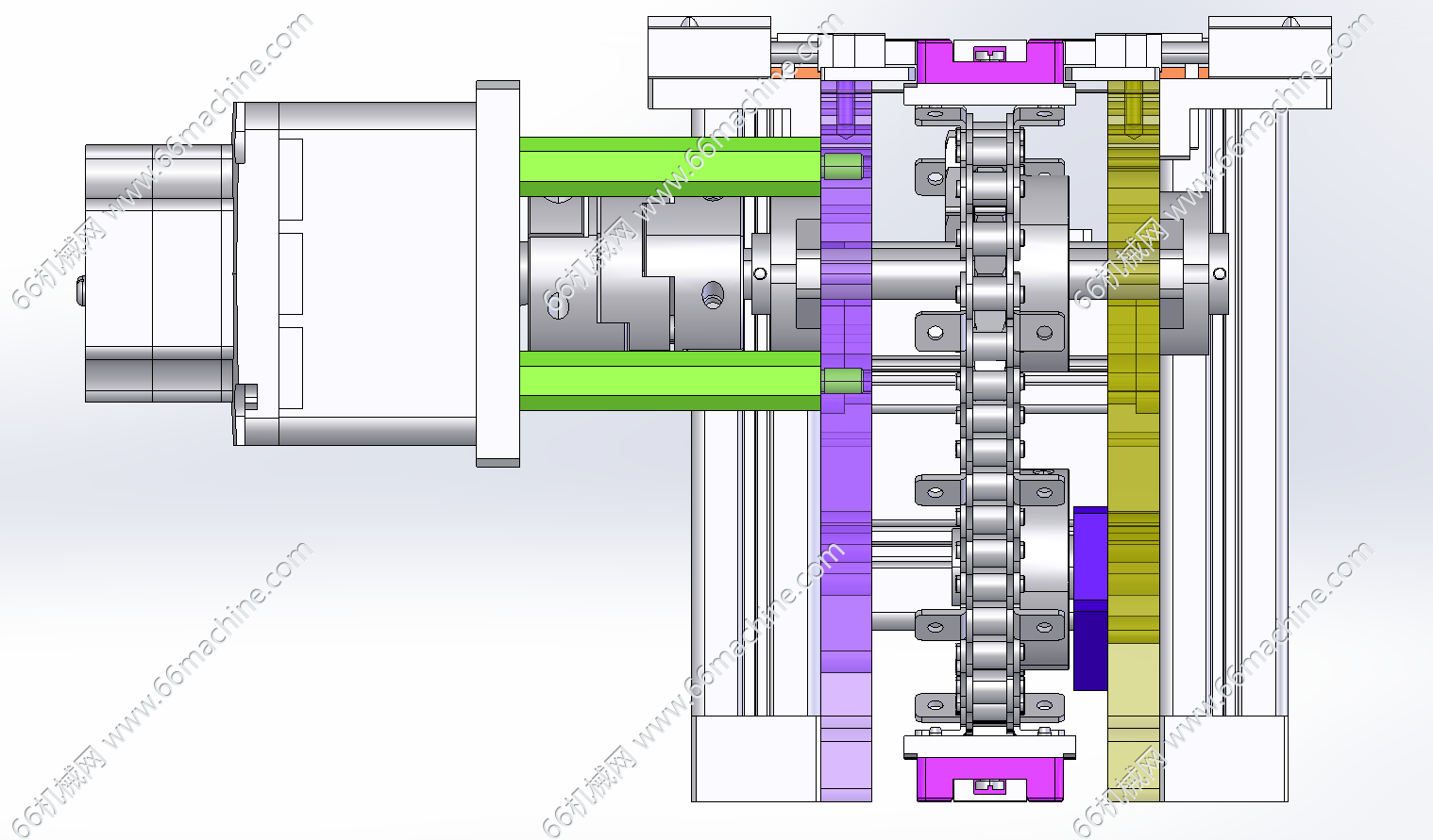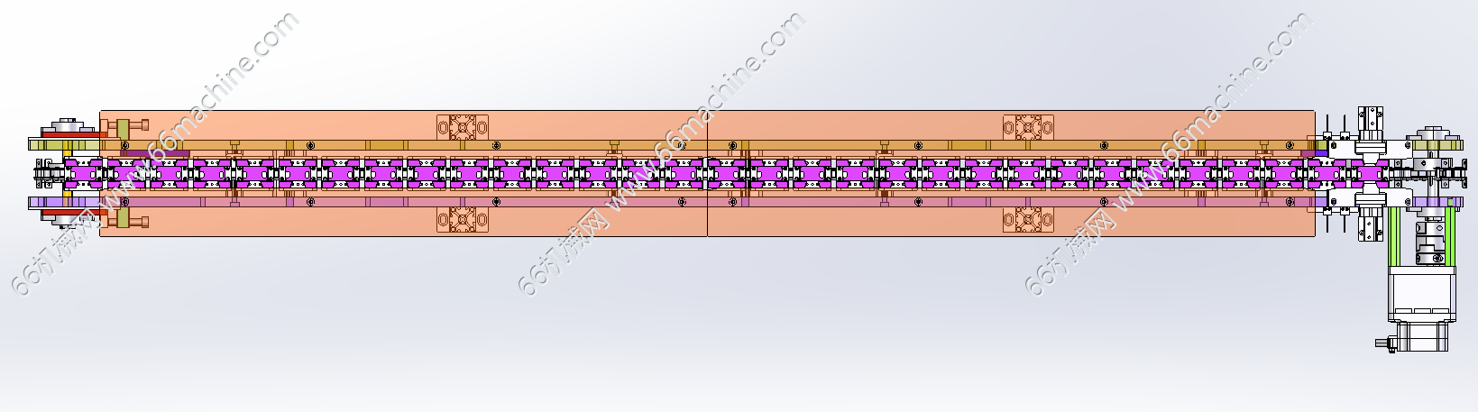本模型为载具链条输送机,是用电机驱动链条的传动机构,链条上固定限位载具,物料通过载具随着链条输送出去。链条做了侧面和底部调节张紧机构,在从动轮处有调节张紧,内底部也有机构可以调节张紧,欢迎参考!