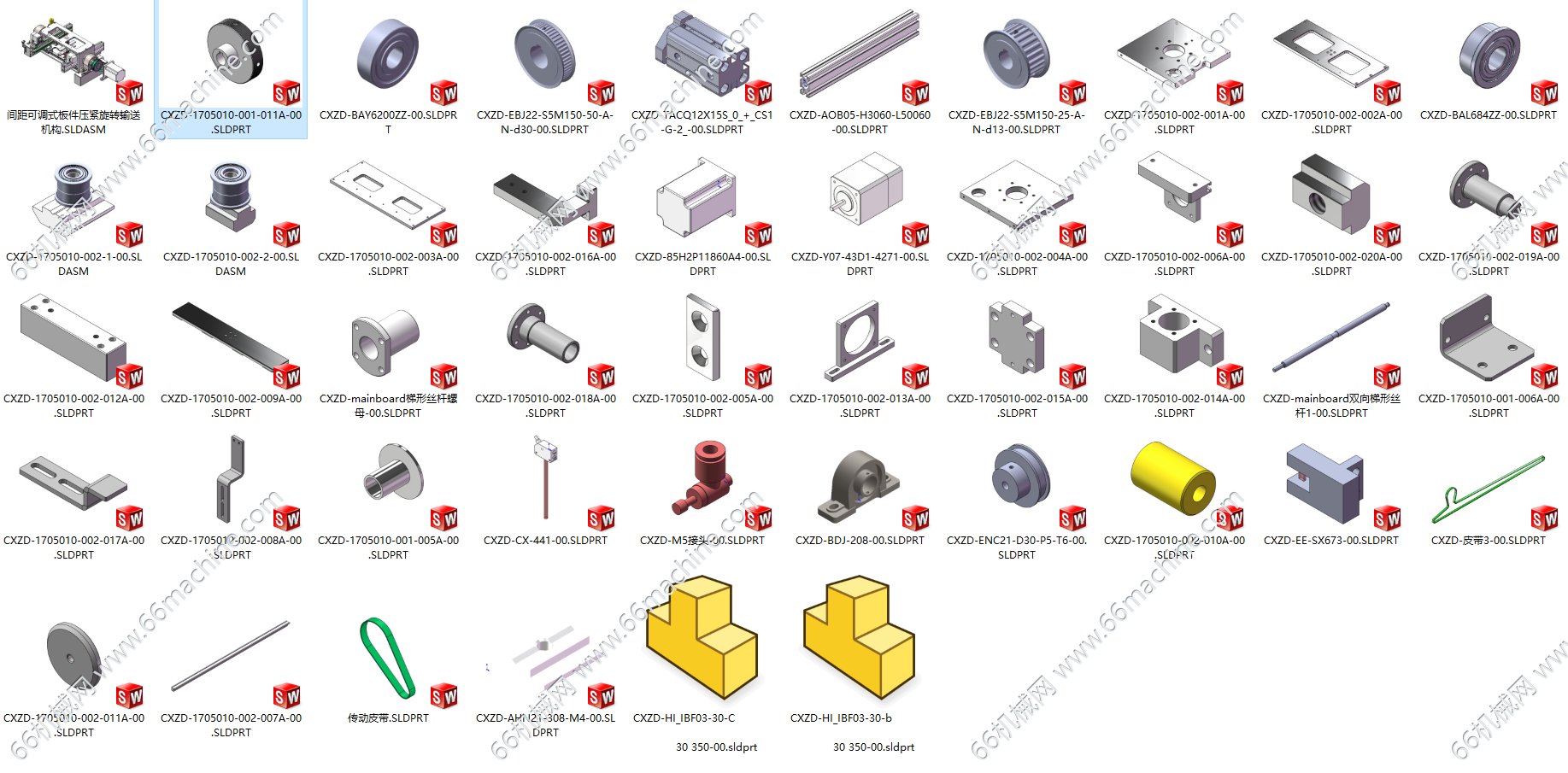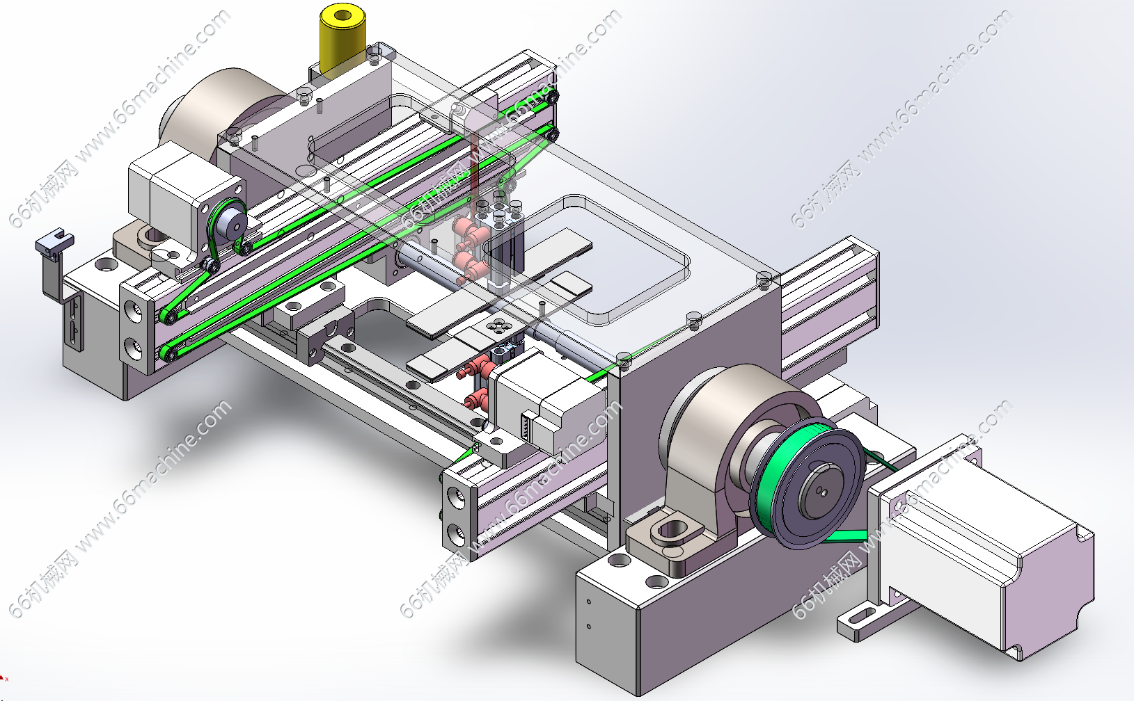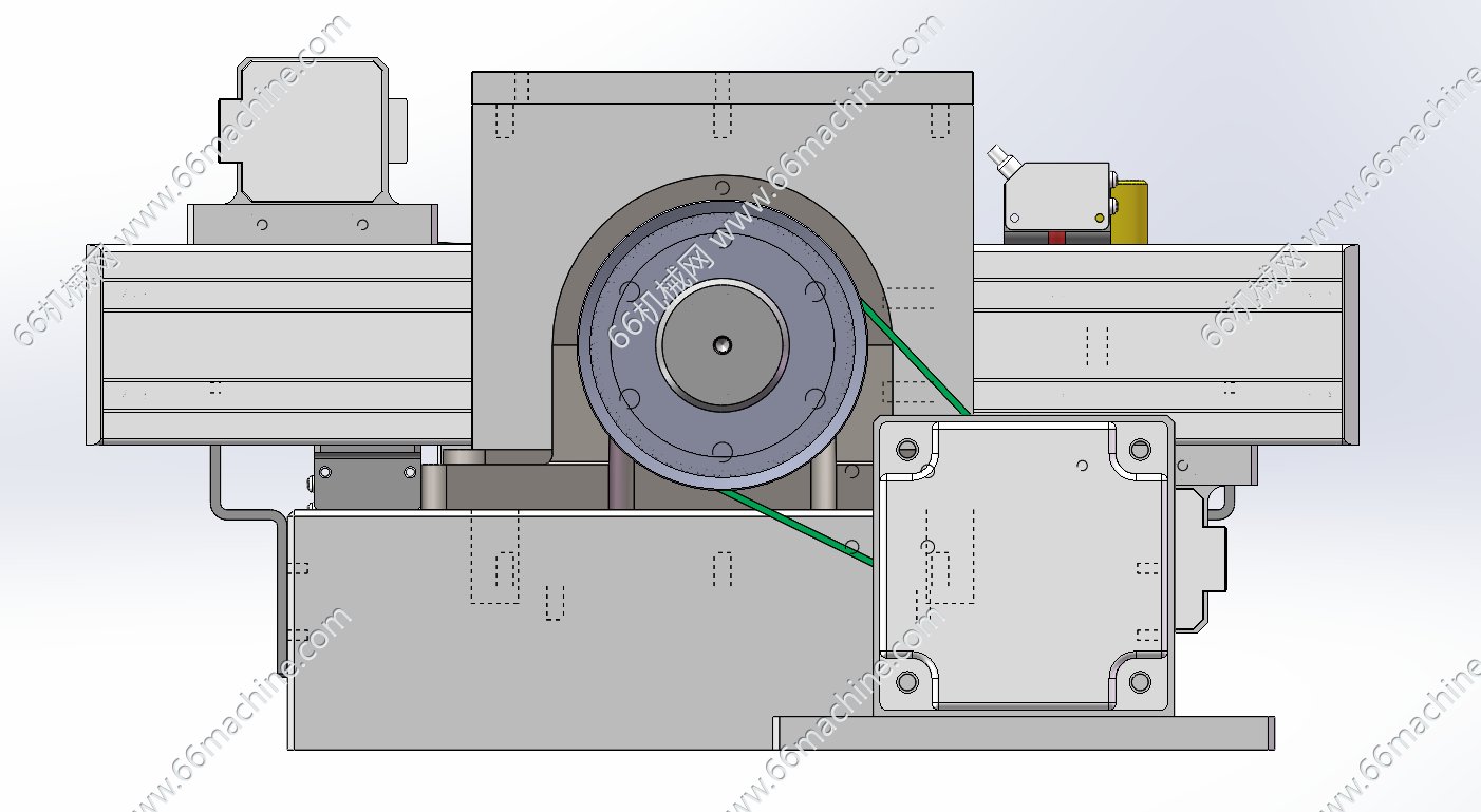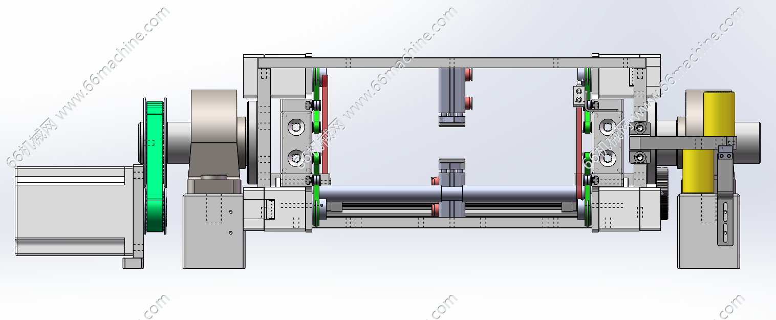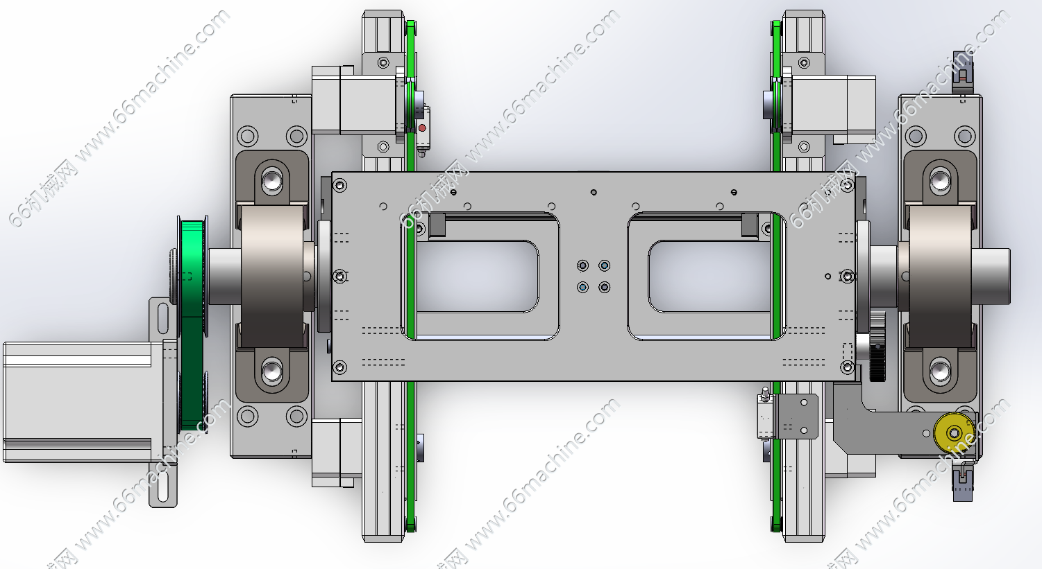 本模型为间距可调式板件压紧旋转输送机构(翻转机构),采用电机经过带传动驱动旋转,手动旋钮进行双列皮带线的间距调节,本旋转机构适用于板件、托盘的旋转,欢迎参考!