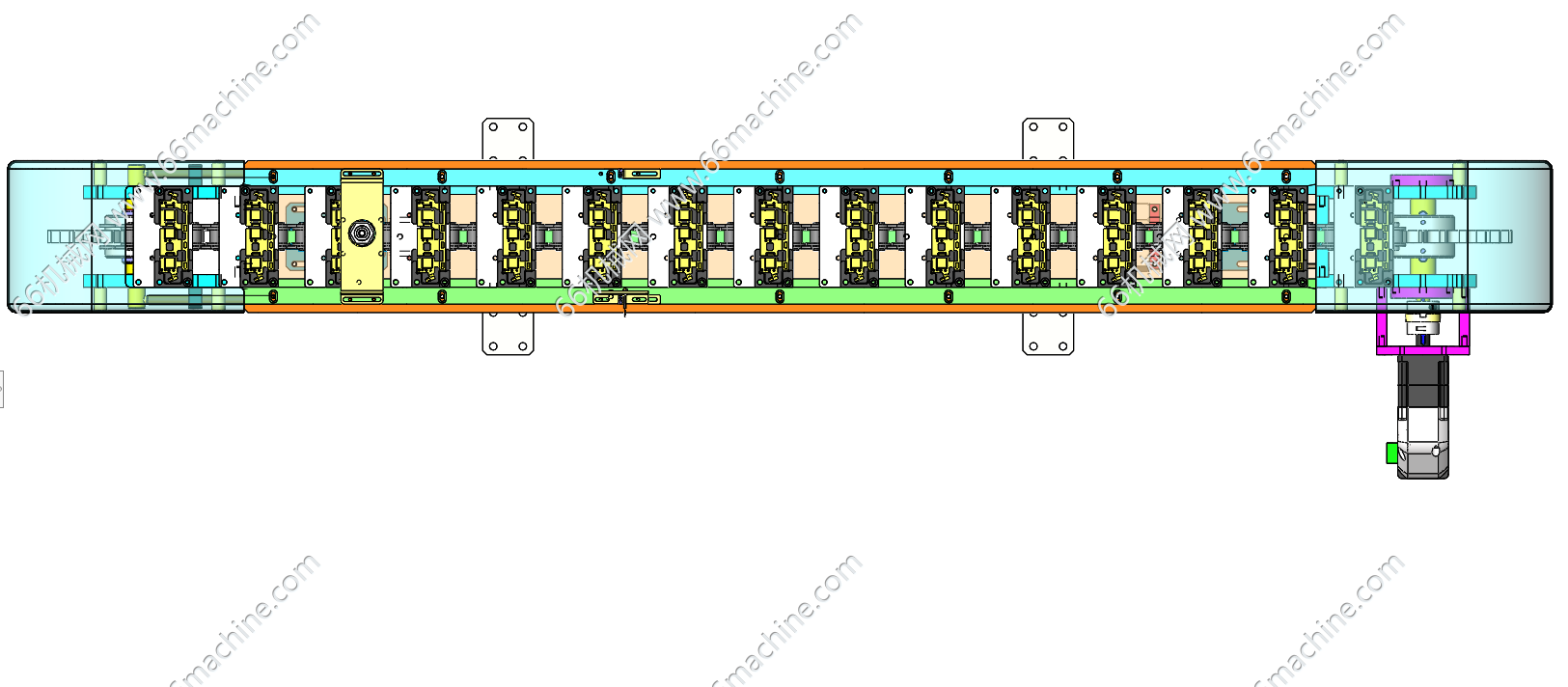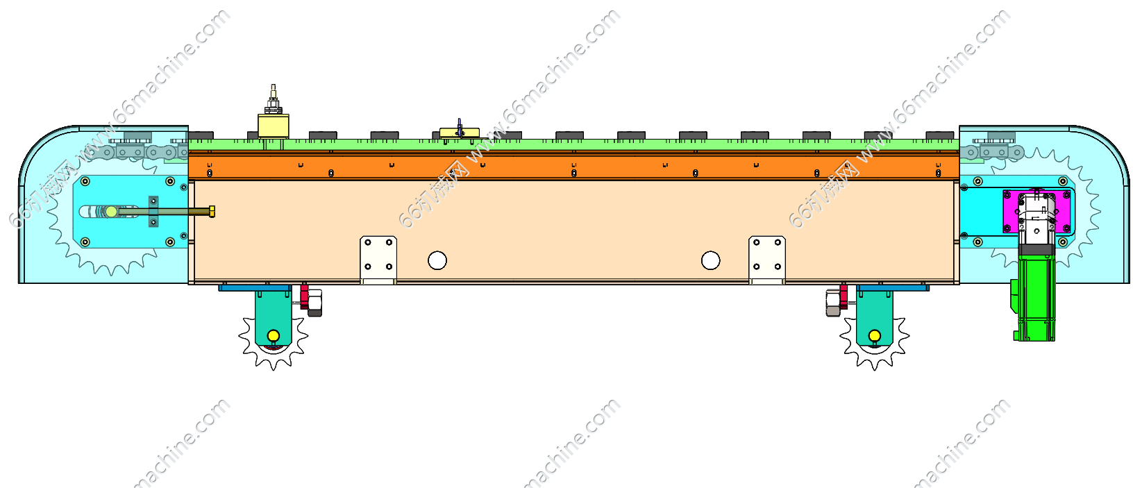 本模型为带载具的链条输送机(输送线),载具固定于链条上,随链条循环。人工将需要输送的产品放入到治具中输出或者流向下一个对接工位加工。应用广泛,欢迎参考!
