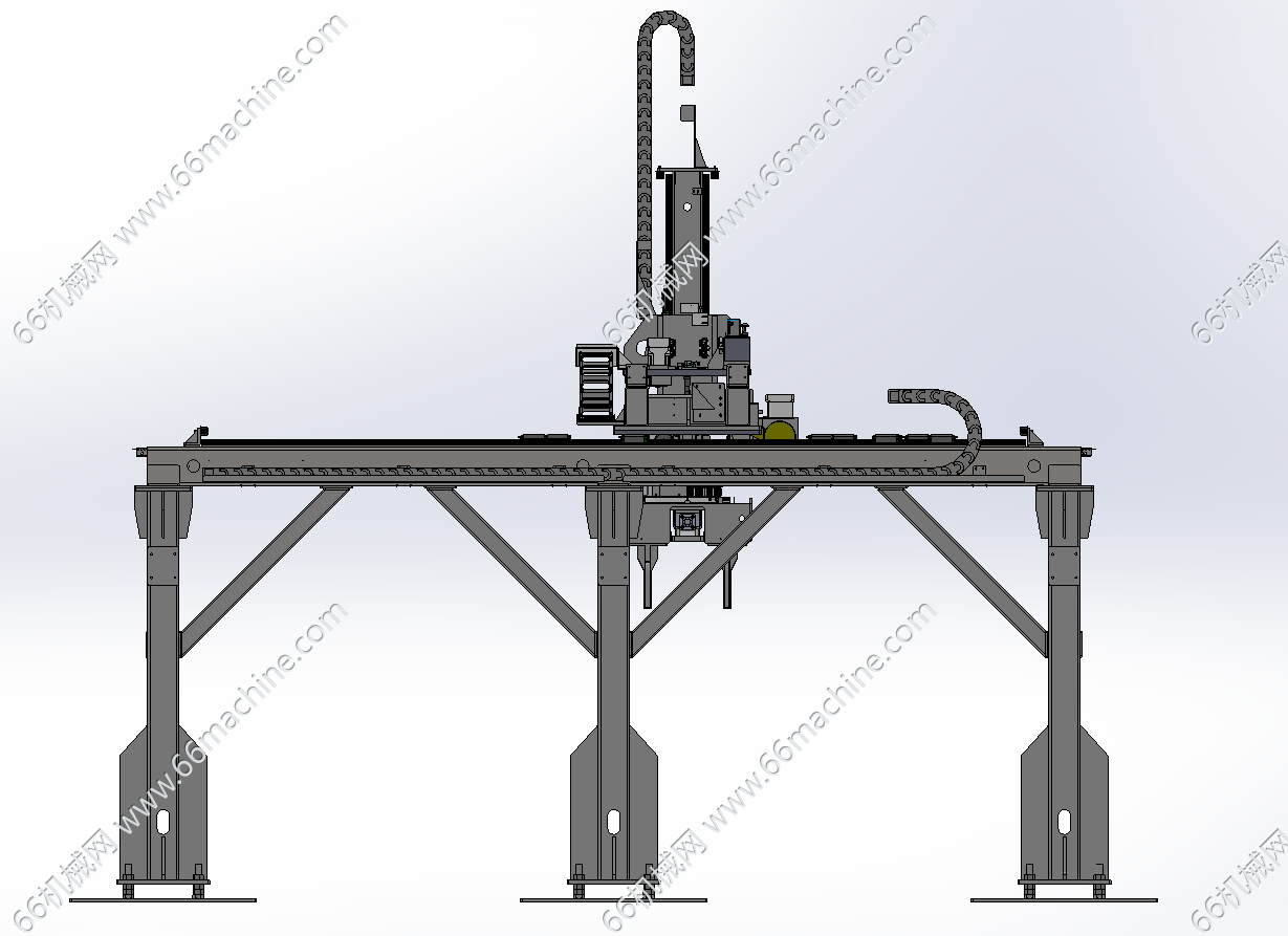 本模型为重型龙门抓取移栽机,XYZ轴均采用伺服电机+齿轮齿条结构实现直线动作,Z轴末端设有旋转夹爪,旋转采用伺服电机驱动齿盘,夹爪采用伺服电机+左右旋丝杠实现夹爪的夹紧/松开,适用于重型工件的移栽,欢迎参考!