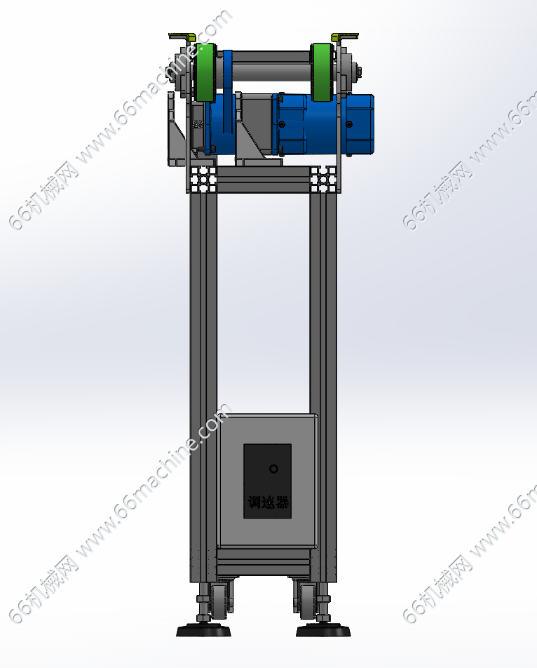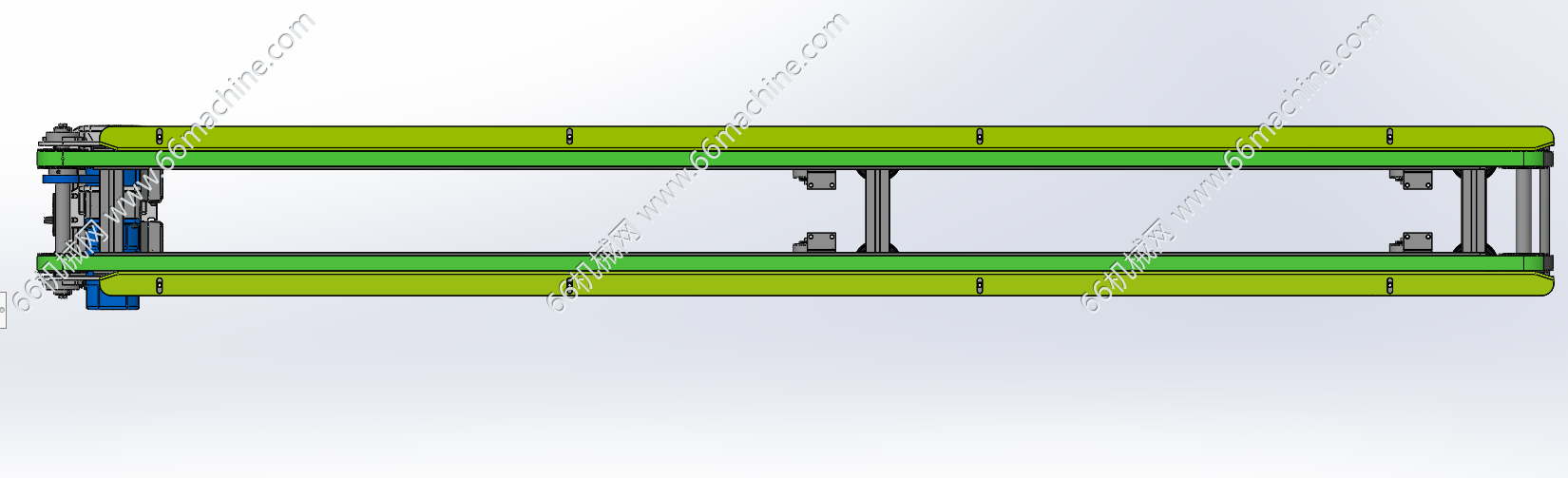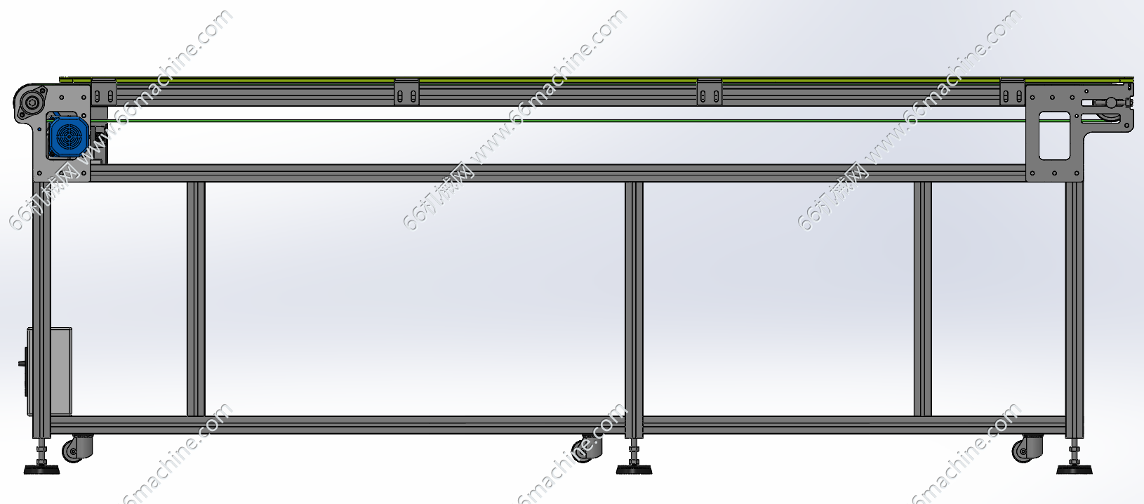本模型为双列皮带输送机,采用电机经过带传动驱动两列皮带做同步输送,适用于托盘(载具)、板件类产品的输送,输送机底部设有滚轮及定位脚,便于快速转移!