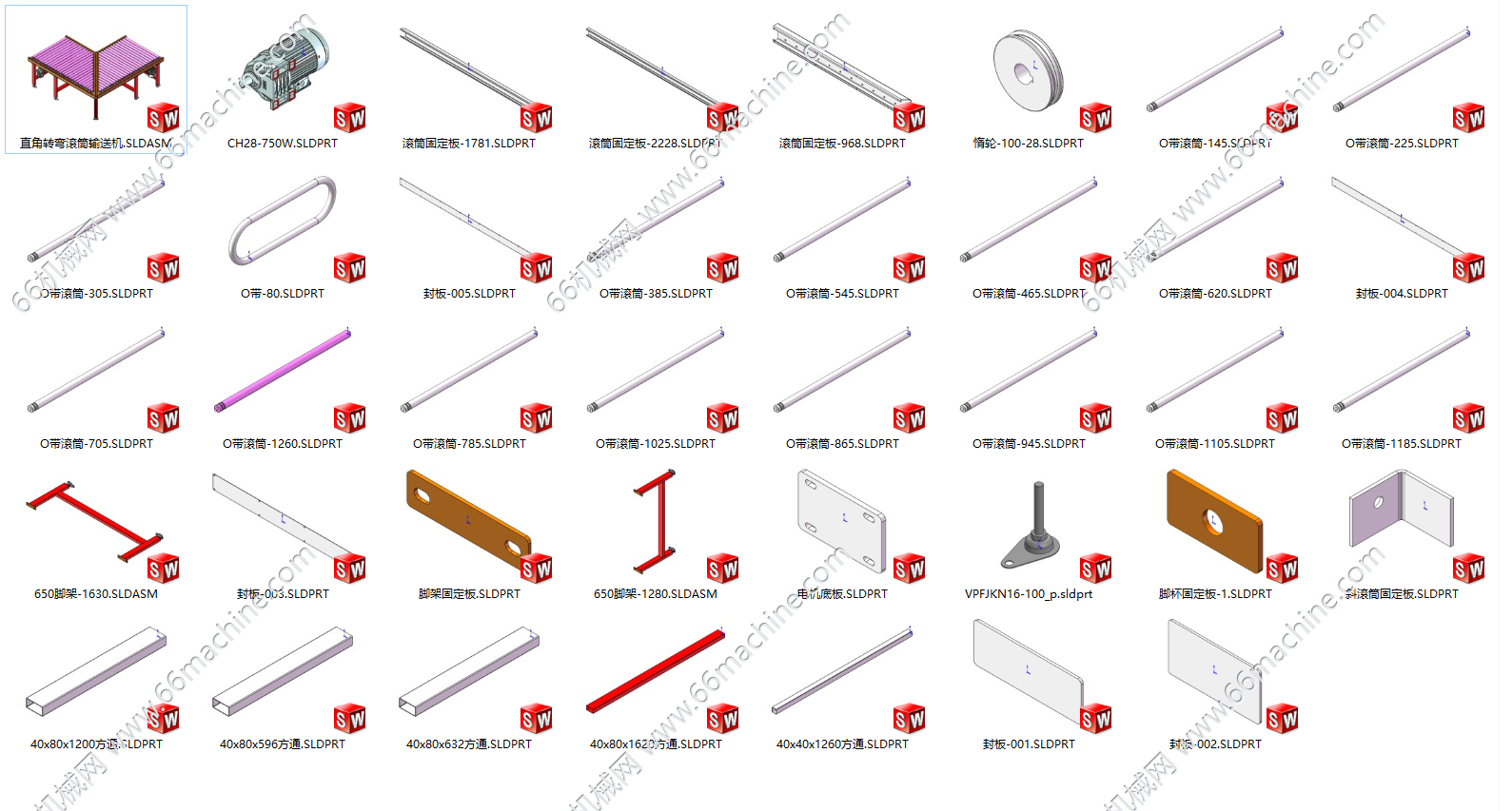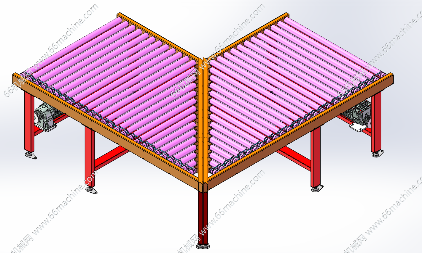 本模型为直角转弯滚筒输送机(90°转向滚筒线),调速电机驱动辊筒,辊筒之间用O带连接,是自动化物流、生产流水线中用于改变物料输送方向、实现产线90°转向的非标输送设备,广泛应用于电子制造、食品包装、仓储物流等场景。