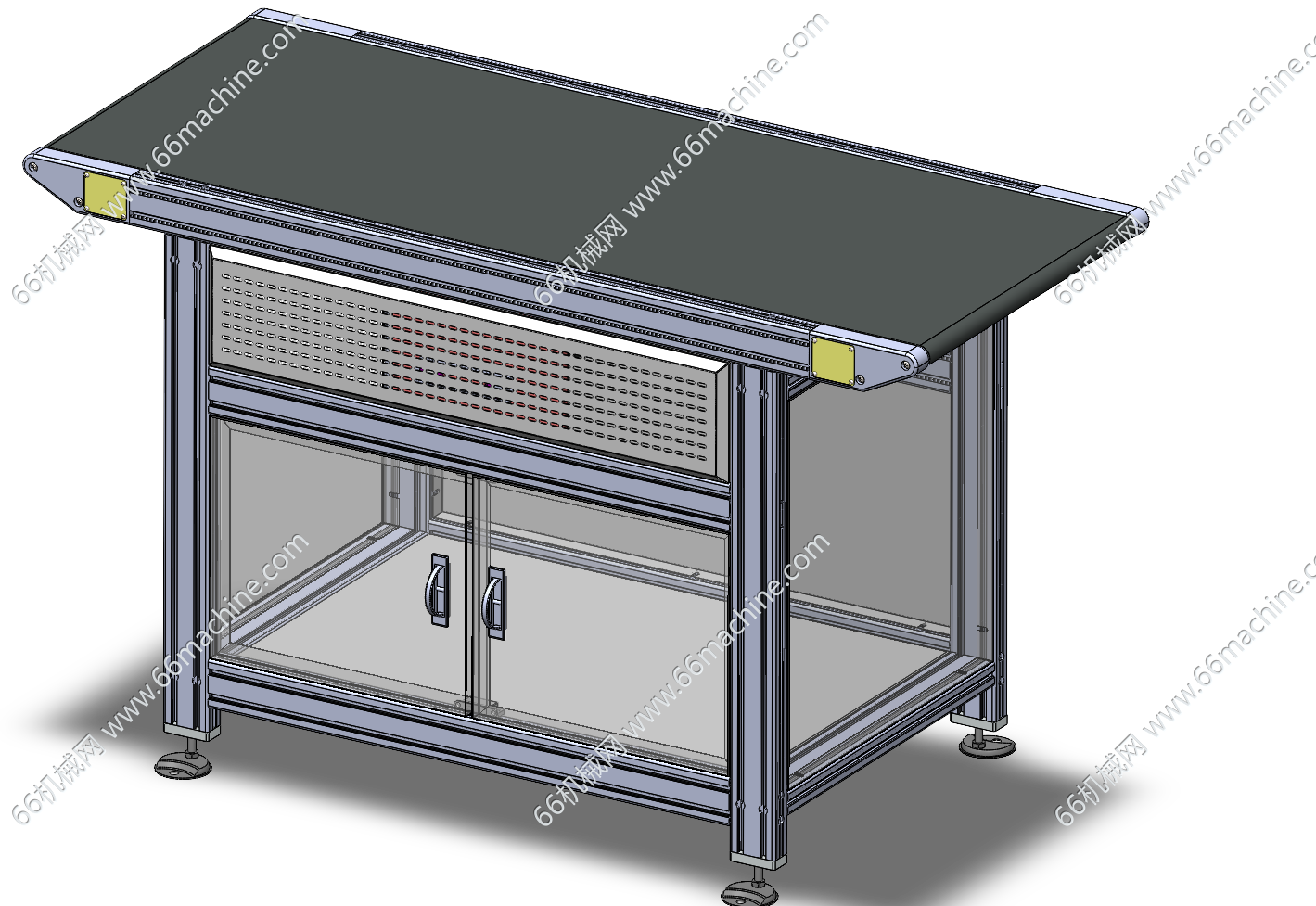 本模型为台式平皮带线(皮带输送机),不运行时可作为桌台使用,动力设置在中间,能实现可调速正反转,多组皮带线可快速组成长行程输送线,广泛用于各类电子厂,欢迎参考!