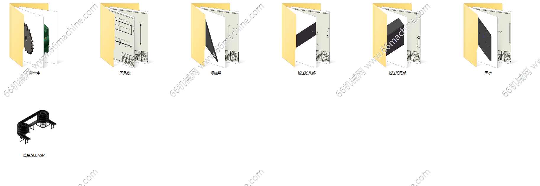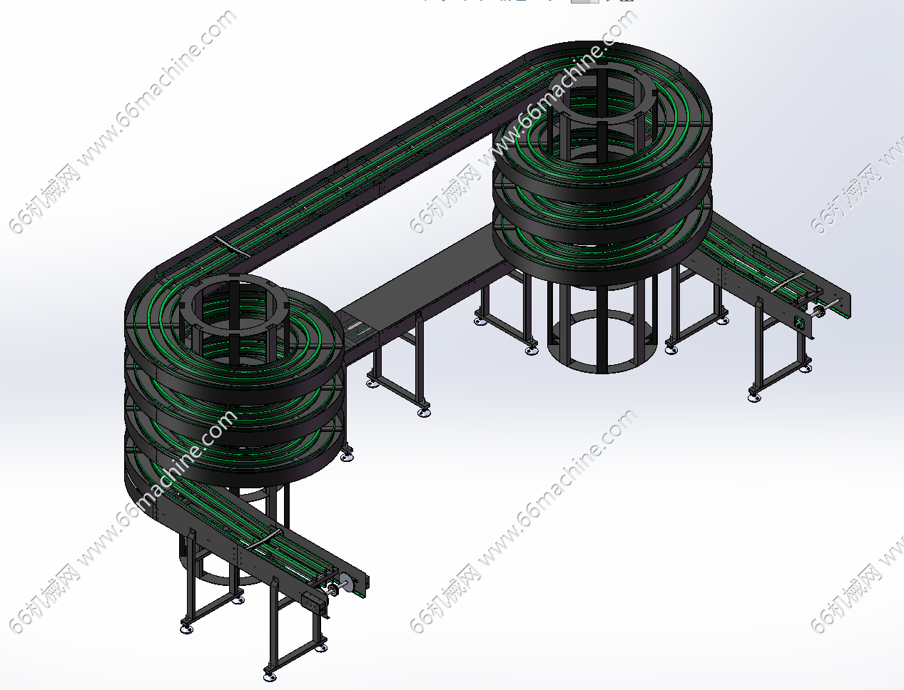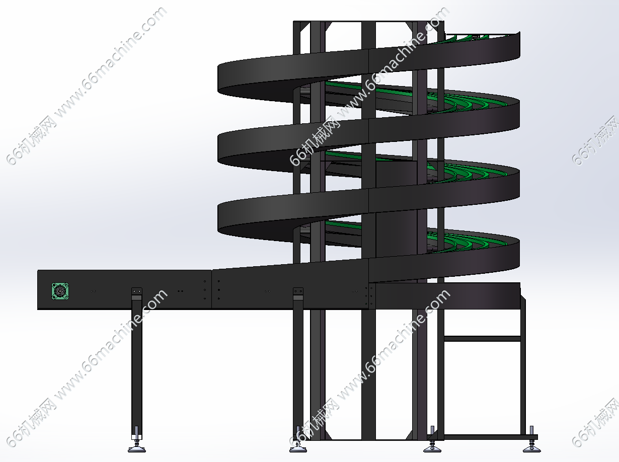 本设备为某企业一种比较新颖的双螺旋天桥式输送机,由两个螺旋塔、头部、尾部、天桥和回路组成。输送履带为无间隙转弯链板,链板由轴承、链板本体和链条组成,链板材质为聚甲醛塑料,链条由底链扣住链板主体而成,最高速度可达90米分。螺旋输送机适用于电子、食物、饮料及工业各种范畴。仅供专业技术人员参考学习之用!