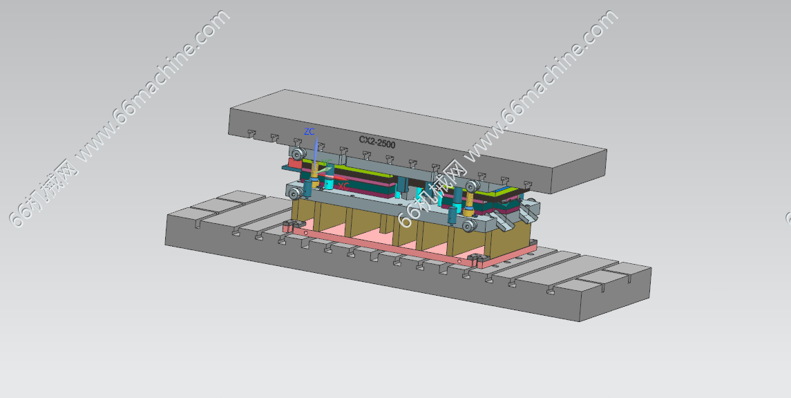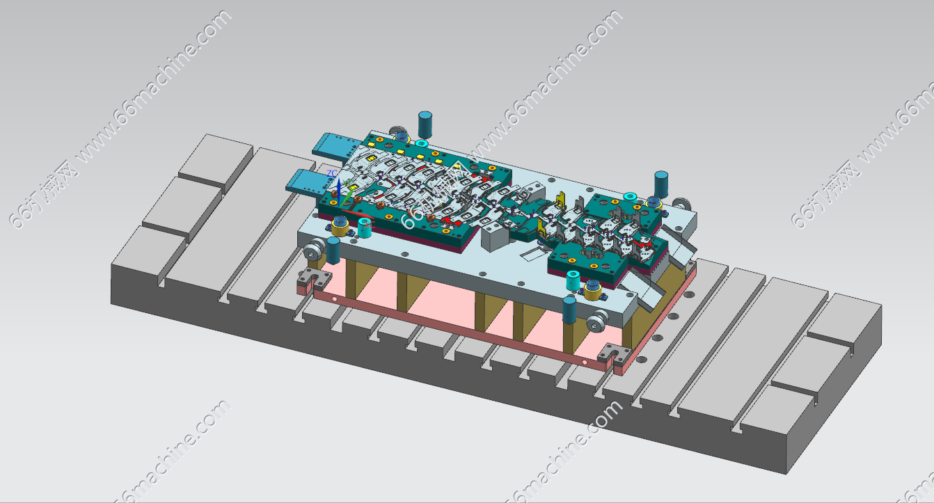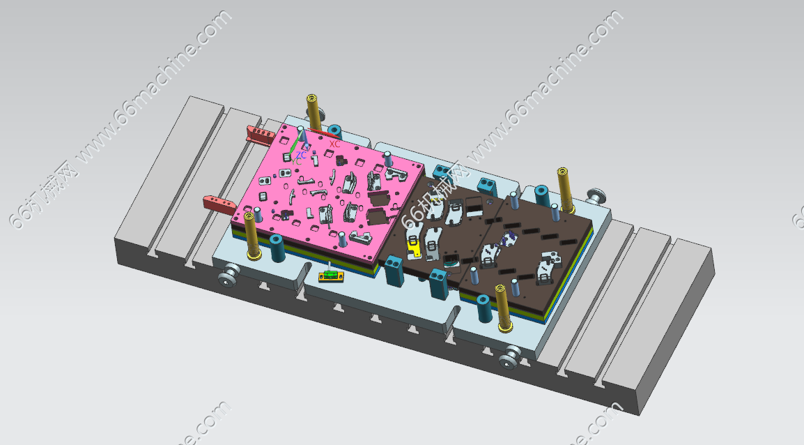 这套模具的核心任务是在一台冲床上,通过一次连续冲压,将一条金属料带(通常是冷轧钢板或镀锌板)加工成车门锁扣组件。它集成了多道工序,实现了从原材料到成品的高效、高精度自动化生产。 主要工序流程 送料与定位:料带从左侧进入模具,通过紫色定位销和黄色导向块实现精确定位,确保每一步冲压都在正确位置。 下料与冲孔:在初始工位,模具会冲出锁扣的基本轮廓和安装孔。 多次折弯成型:中部的灰色成型镶件会逐步对料带进行折弯、翻边等操作,形成锁扣的立体结构。 整形与分离:在右侧,模具会对成型的零件进行最终整形,然后通过红色的切断机构将成品从料带上分离下来。 应用价值 高效稳定:每分钟可生产数百件,远高于单工序模具,且产品一致性极佳。 降低成本:大幅减少了人工和设备投入,适合汽车行业对大批量、低成本零件的需求。 保证安全:车门锁扣是关键安全部件,连续模的高精度确保了其机械强度和可靠性。