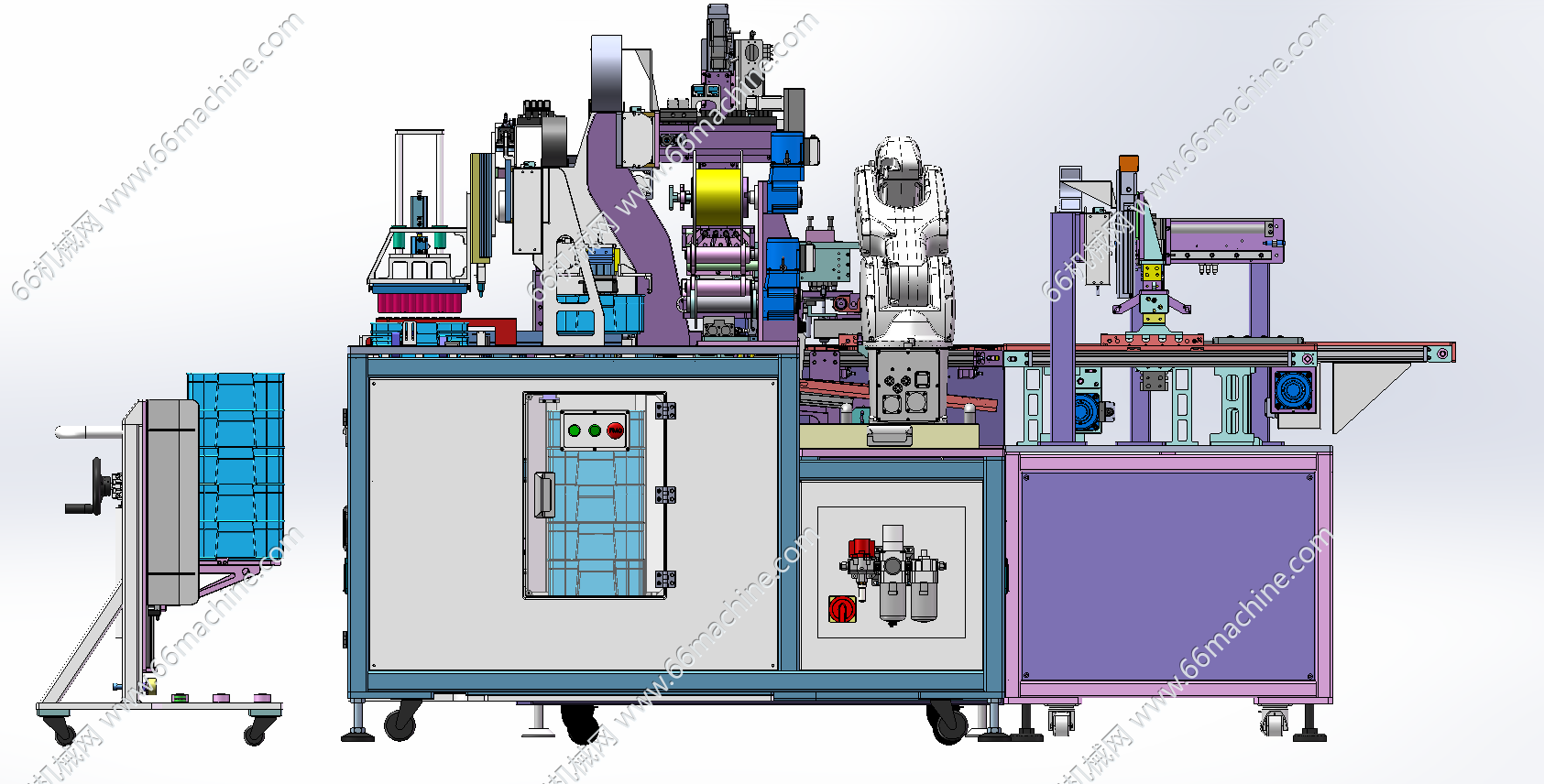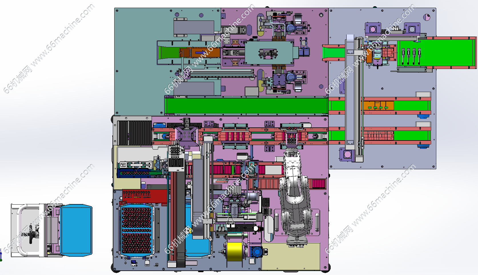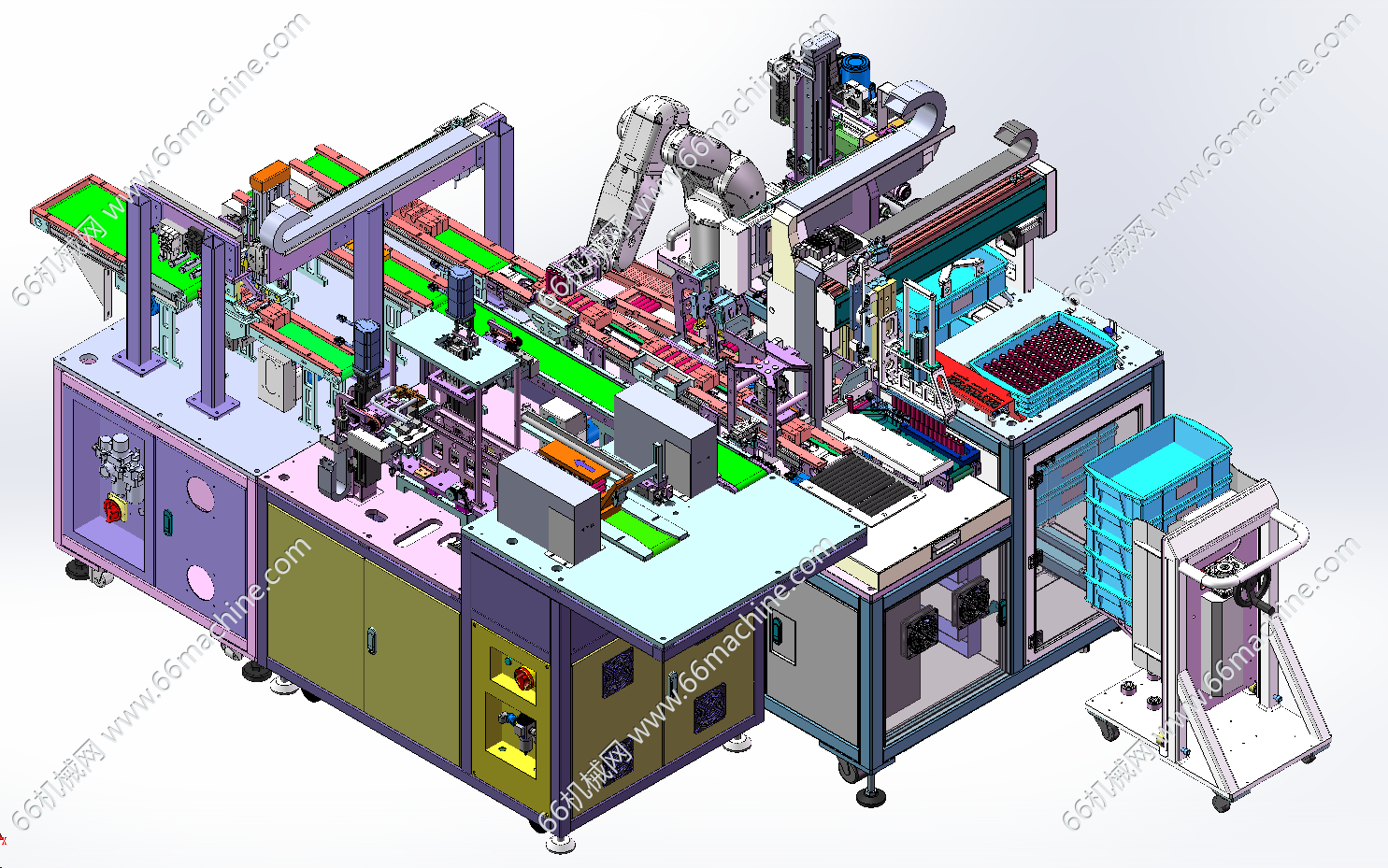 本模型为某企业圆柱电池上料、入治具、贴绝缘纸设备,主要由机架、机罩、电池吸取移栽模组、出贴绝缘纸模组、料盒推车、六轴机器人、输送线等组成,主要用于圆柱电池上料、入治具及贴绝缘纸作业,本设备结构比较复杂,仅供大家参考!