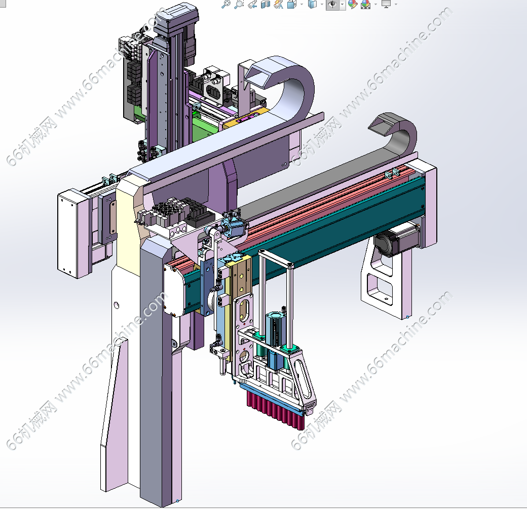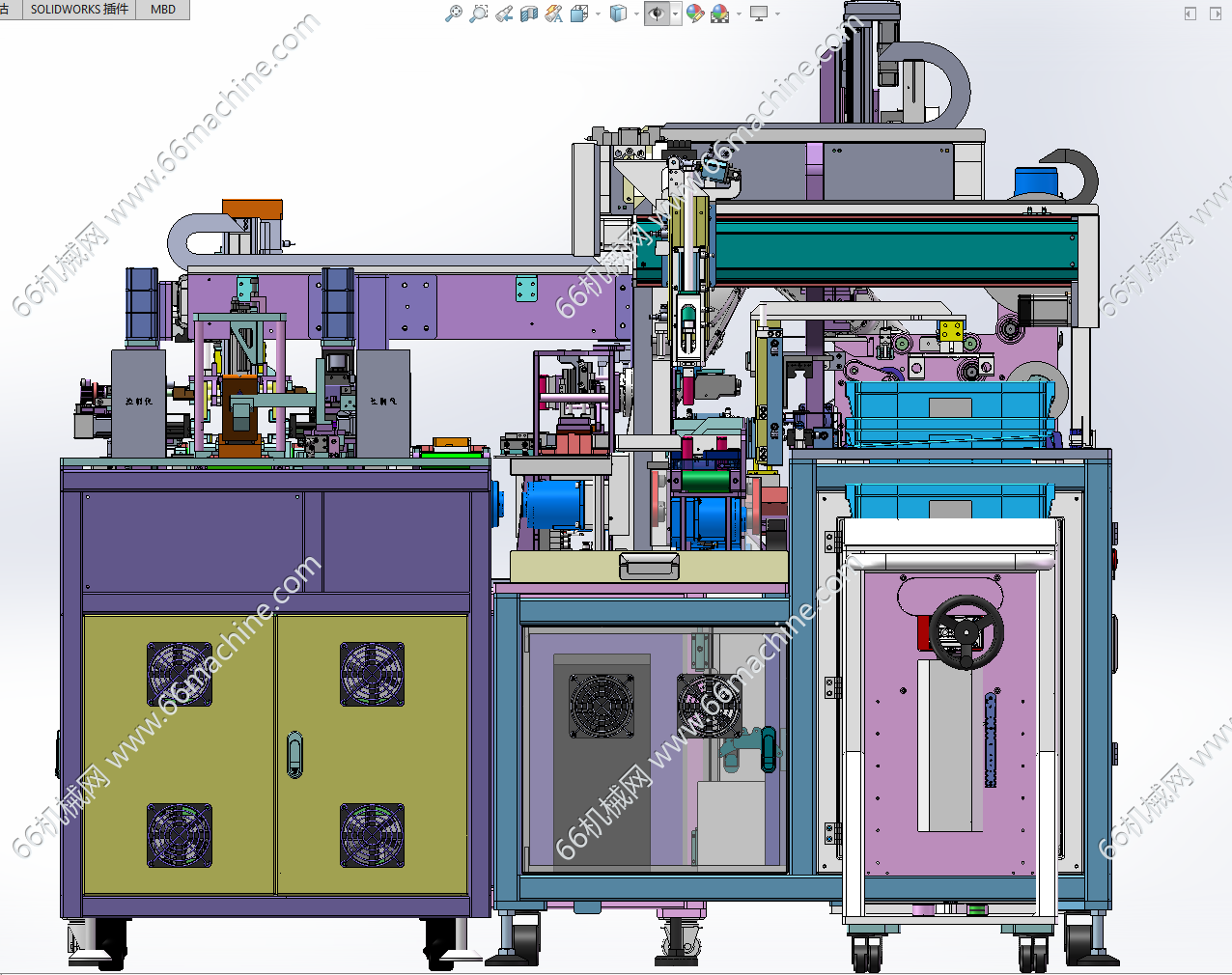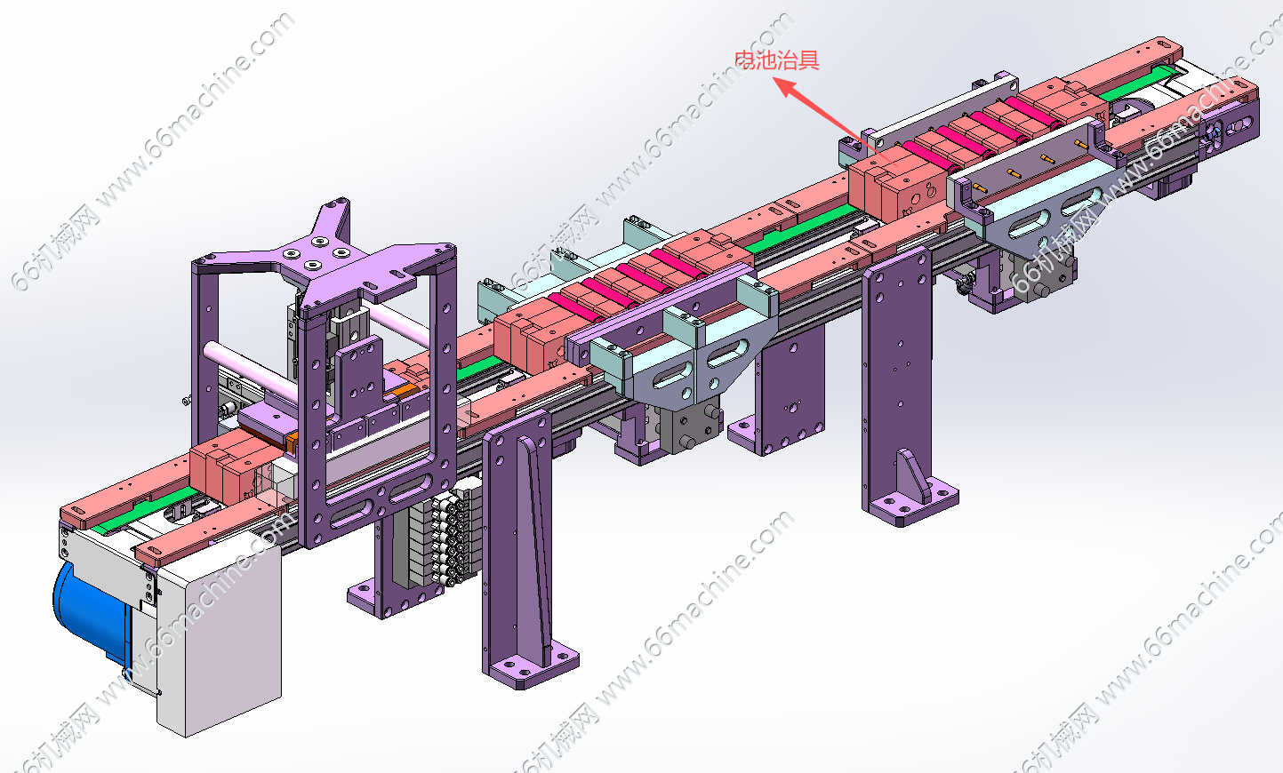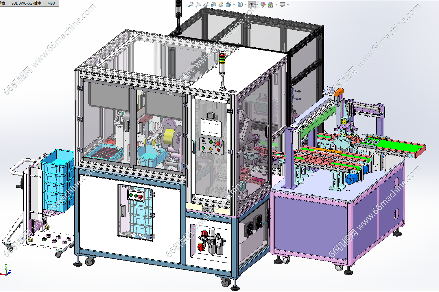 本模型为某企业圆柱电池上料、入治具、贴绝缘纸设备,主要由机架、机罩、电池吸取移栽模组、出贴绝缘纸模组、料盒推车、六轴机器人、输送线等组成,主要用于圆柱电池上料、入治具及贴绝缘纸作业,本设备结构比较复杂,仅供大家参考!