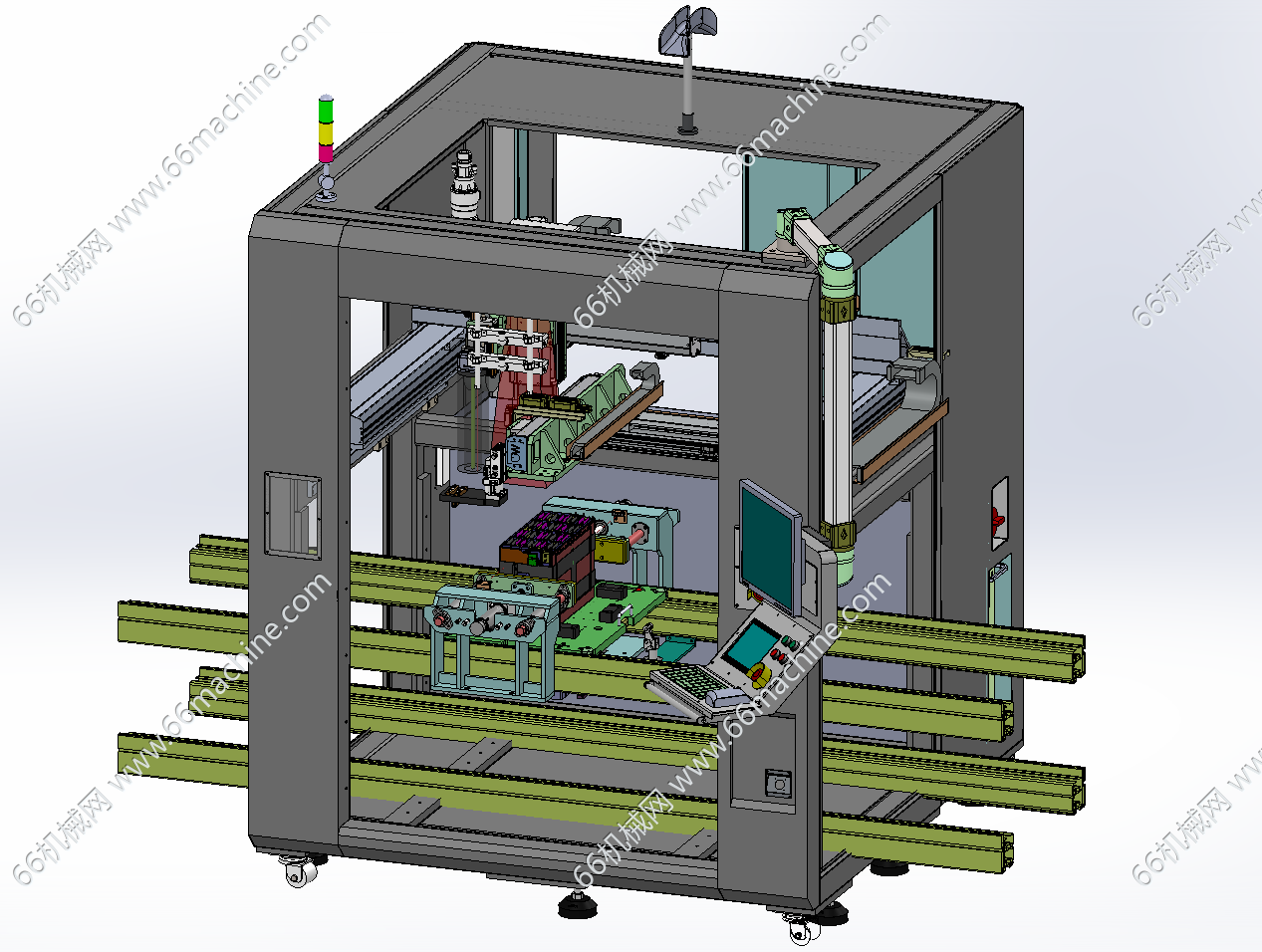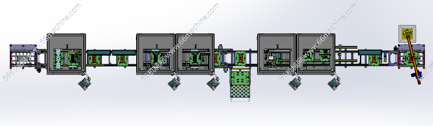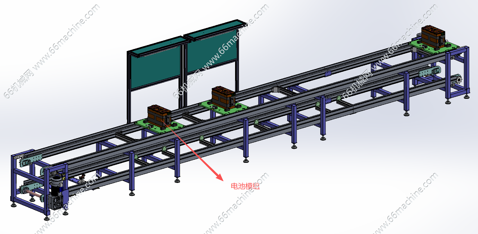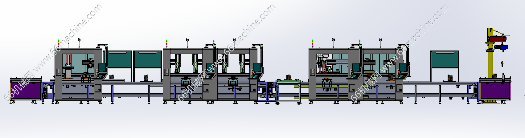 本模型为某企业电池模组点胶、折极耳、激光焊接及检测设备,主要由双层倍速链、点胶机、双台极耳折弯机、激光焊接机、导通性测试机、载具升降机、下料输送线等组成,用于电池模组的自动化点胶、折极耳、激光焊接及检测作业,仅供参考!