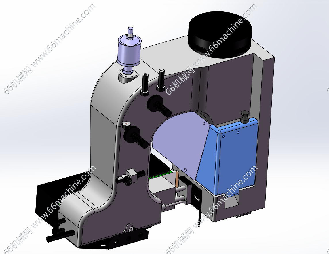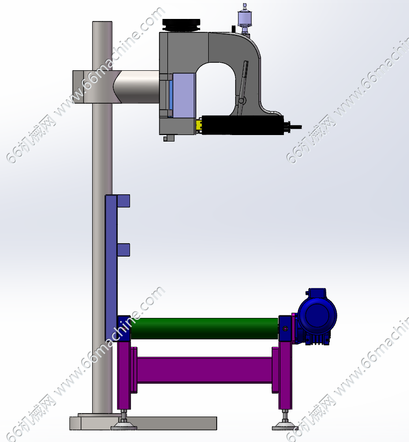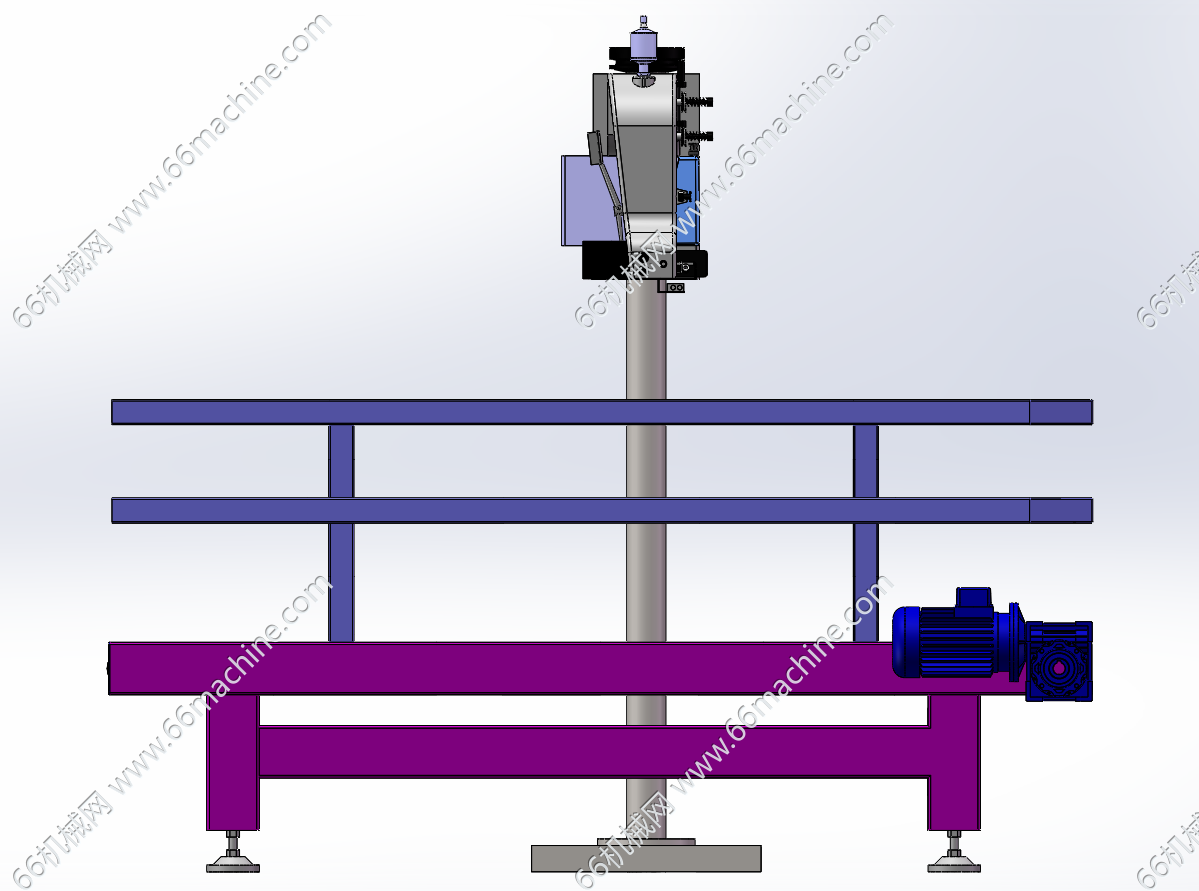 本模型为在线式自动缝包机,由缝纫机头、皮带输送线,高度调节立柱三大部件组成,可以调节上下高度,广泛应用于粮食、化工、饲料等行业包装袋的输送缝包。