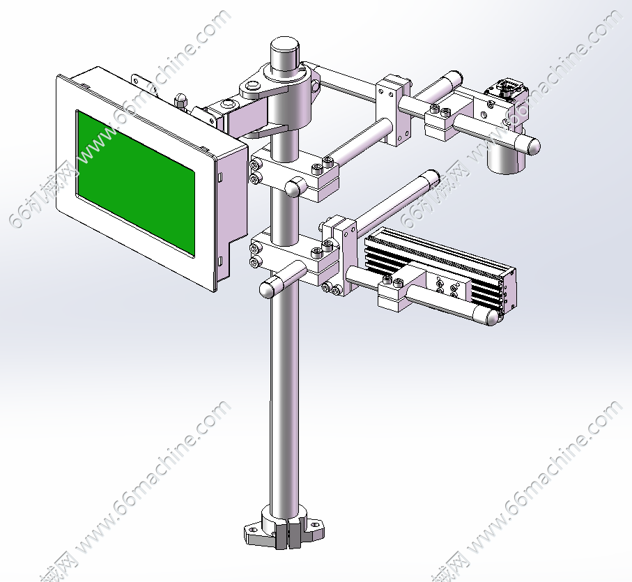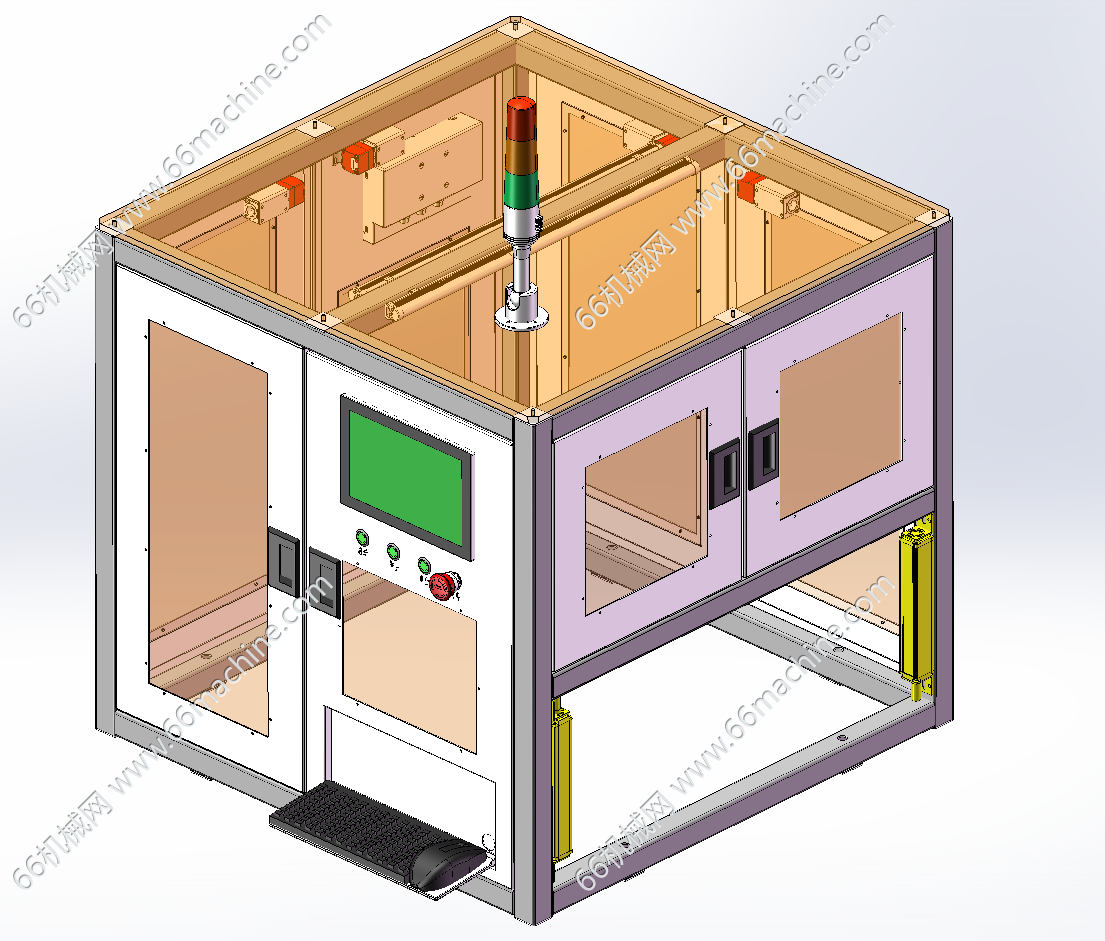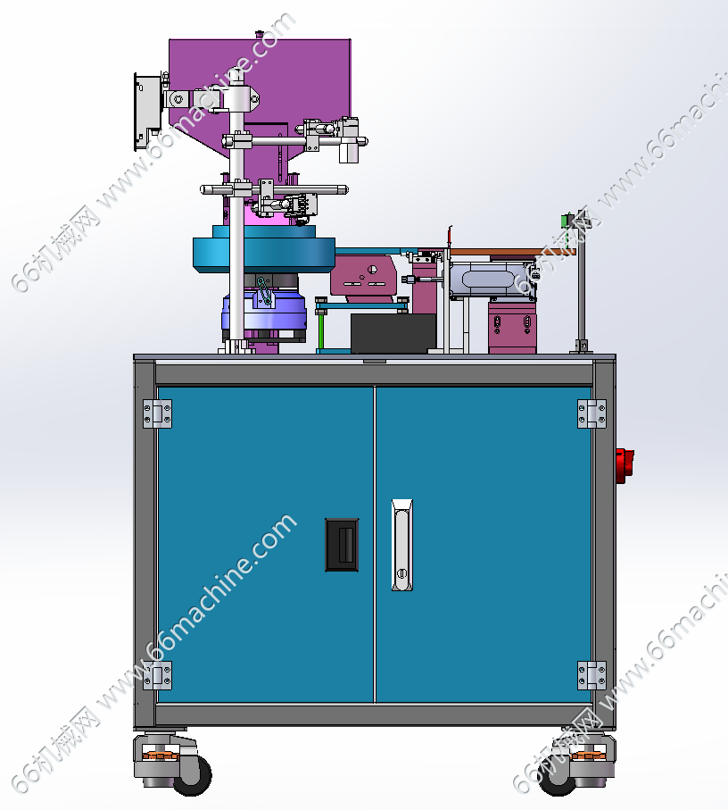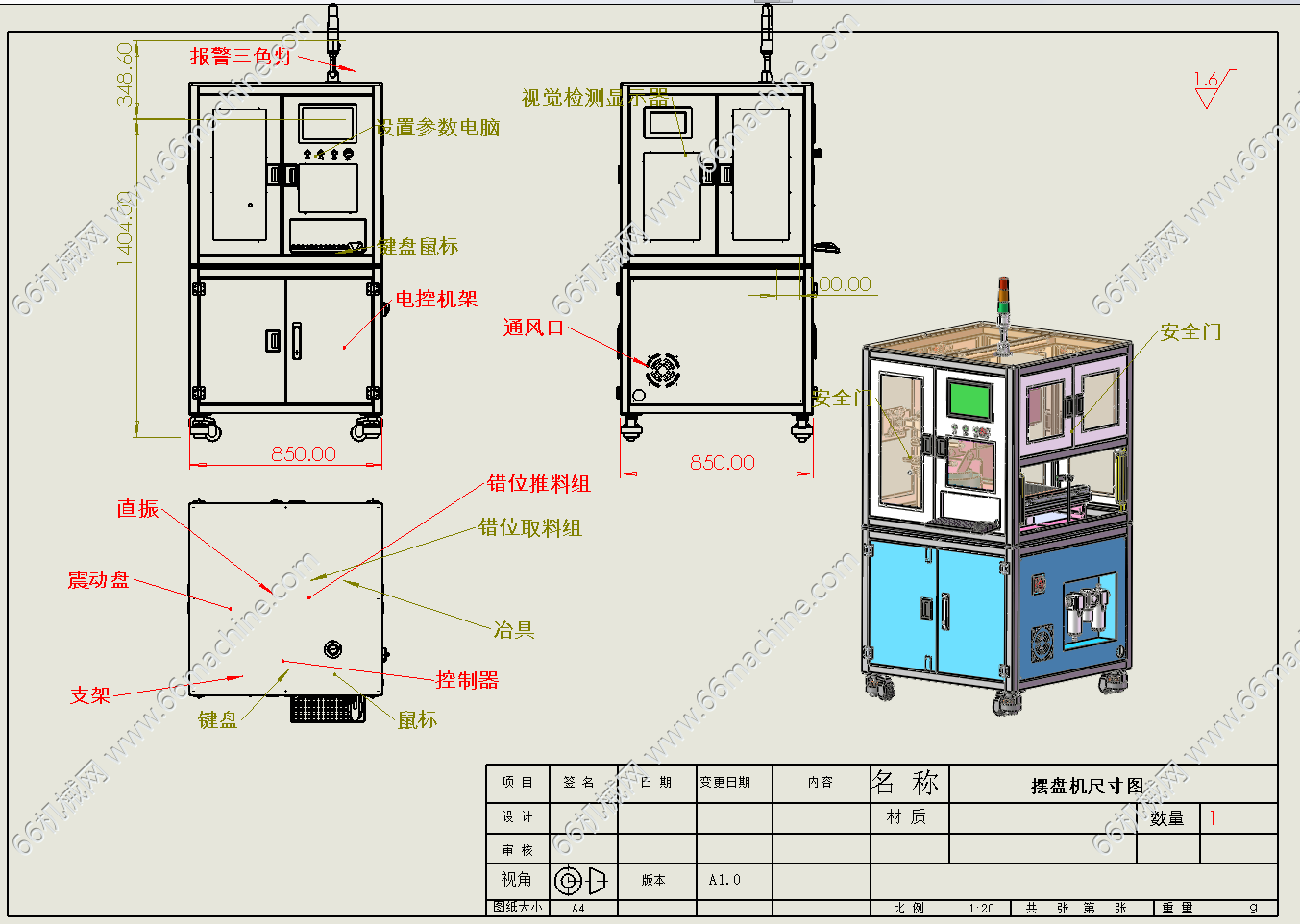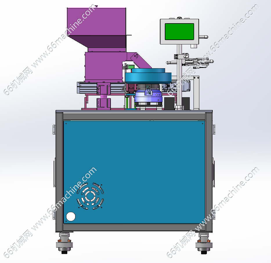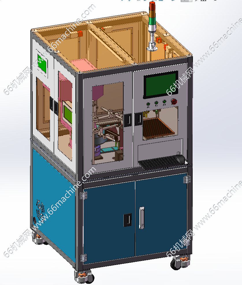 本模型为通用型自动摆盘机,主要由下机架、机罩、供料模组、振动盘模组、托盘横移模组、控制屏支架模组等组成,可自动化、整齐、高效地把产品摆进托盘,通用性强,广泛用于五金、电子、医药等行业。