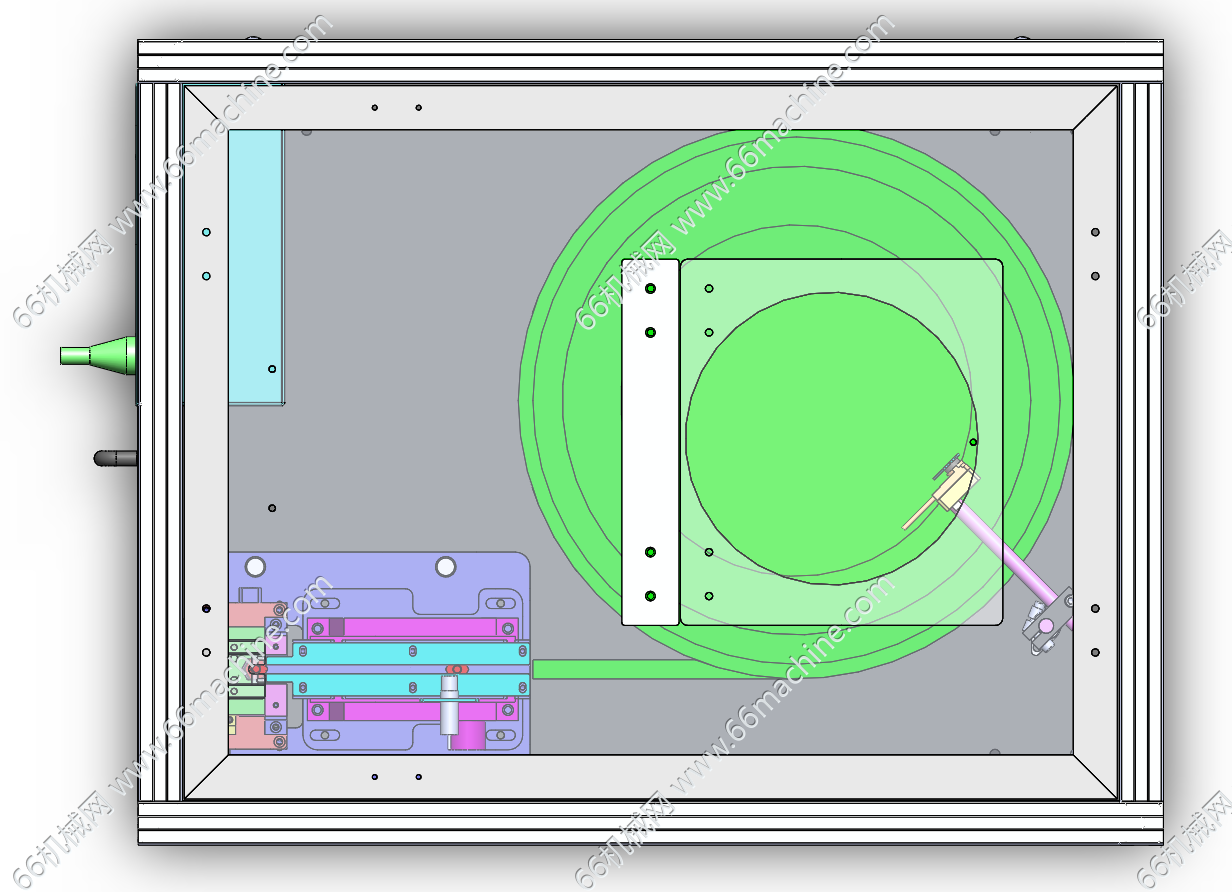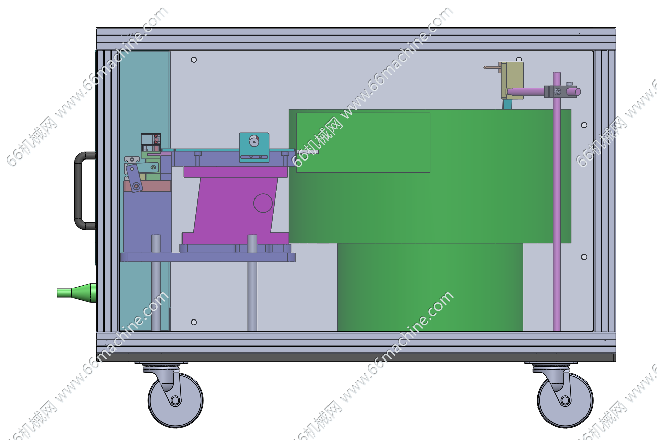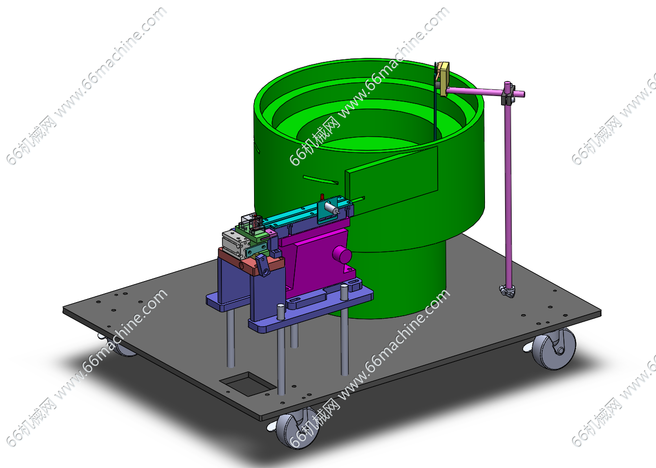本模型为振动盘自动上料机,内置振动盘与直振送料机构,可实现小型零件的自动定向排序与连续送料,底部配置万向脚轮便于工位移动,侧面设检修门与出料口,适配电子、五金等行业非标自动化生产线的柔性送料需求。