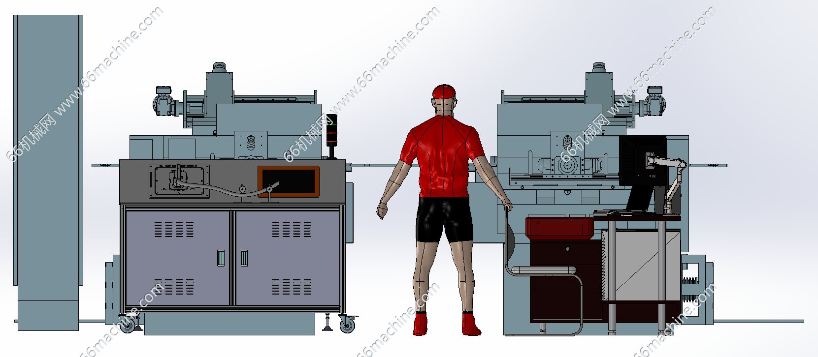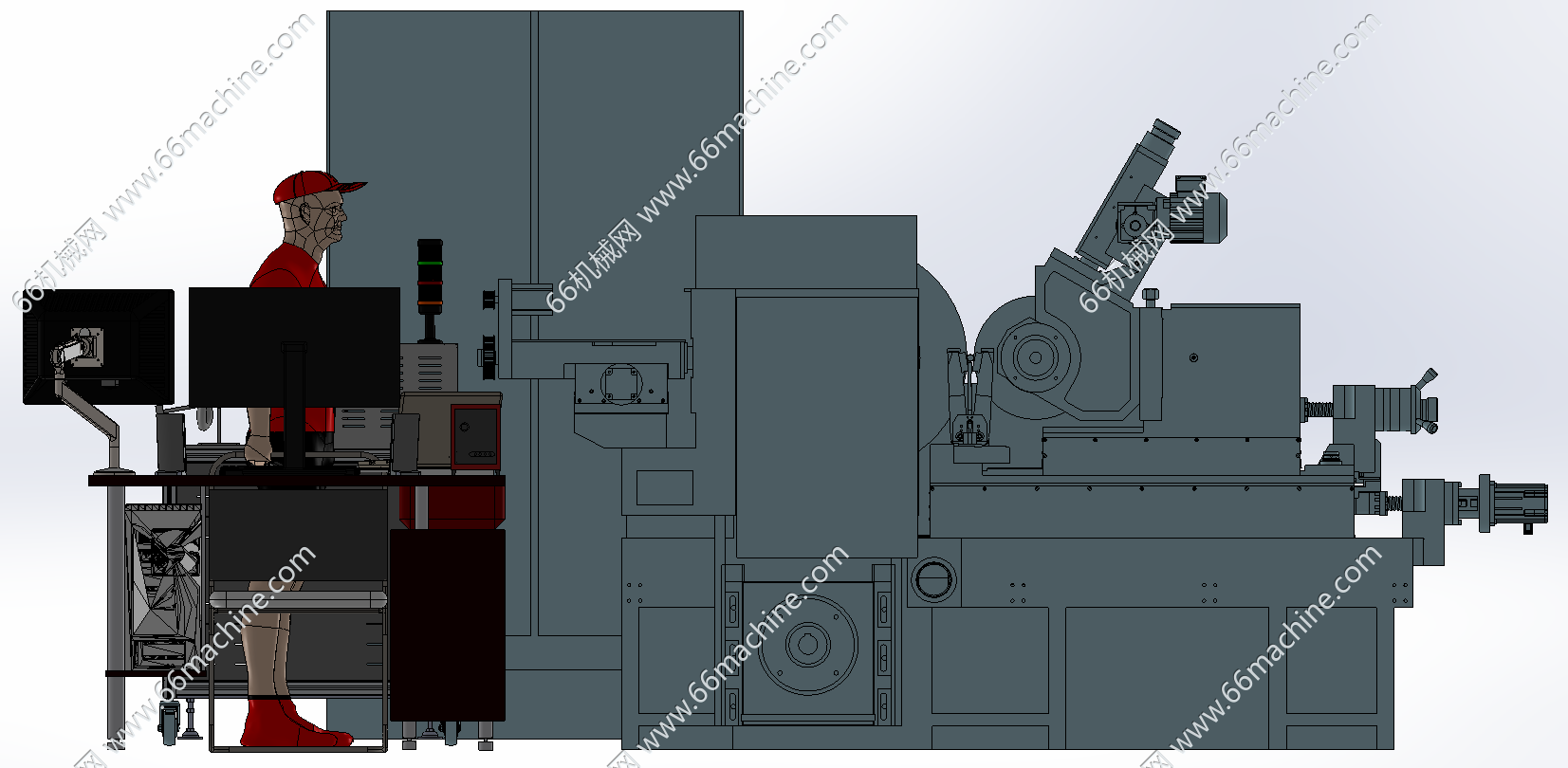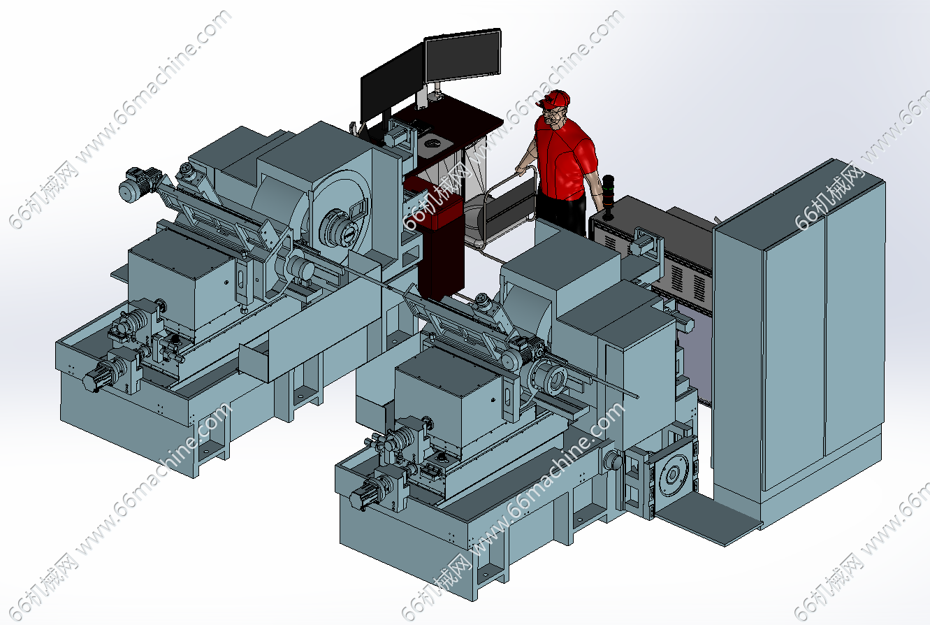 本模型为轴柱类零件磨圆加工生产线(磨圆机),两台大型数控磨圆机对轴柱类零件进行外圆打磨,旁边的控制柜用于设备的程序控制与参数调节,工作人员通过操作工位可实时监控加工过程、调整加工参数,确保轴柱类零件的加工精度。