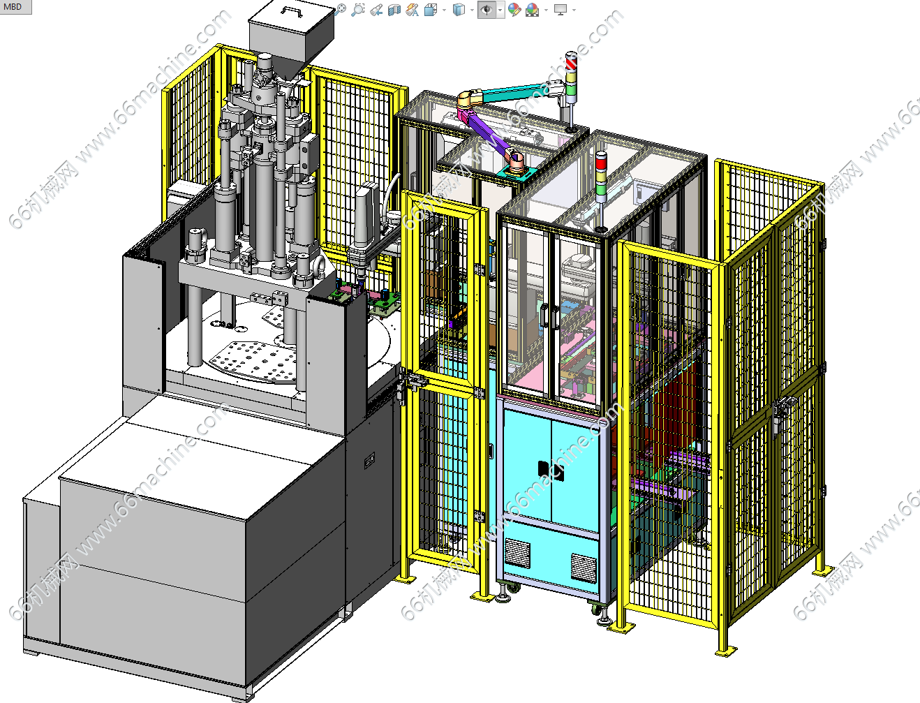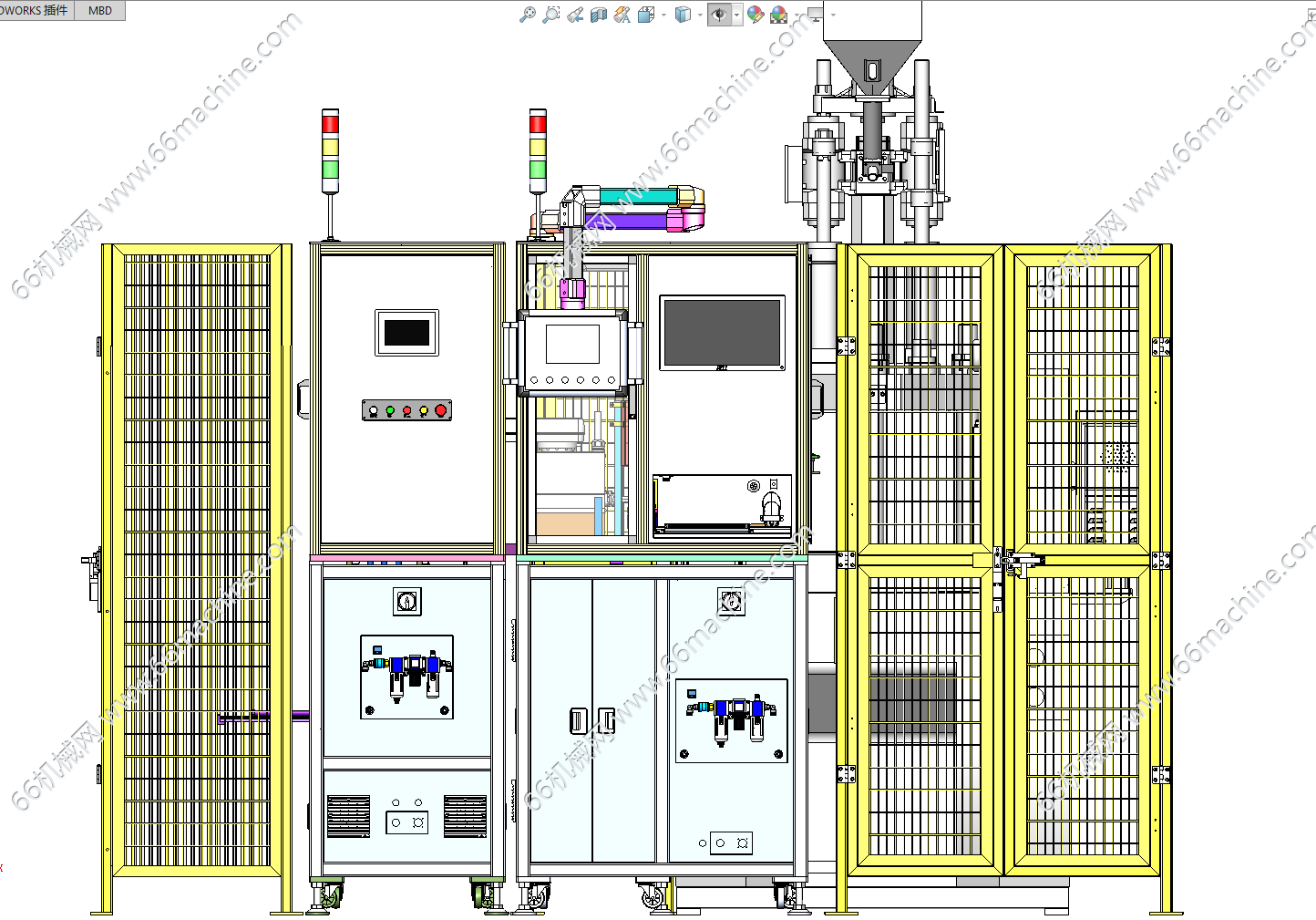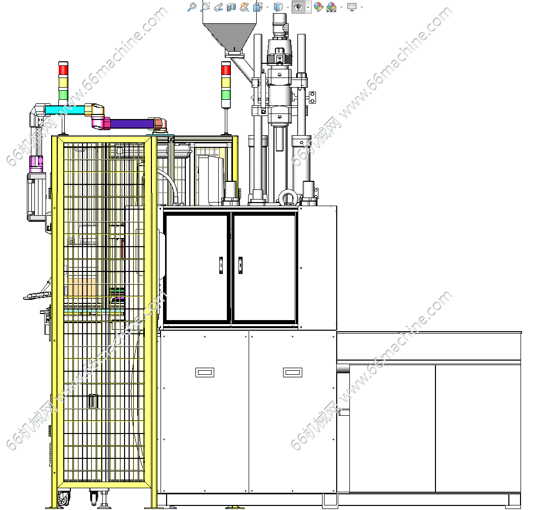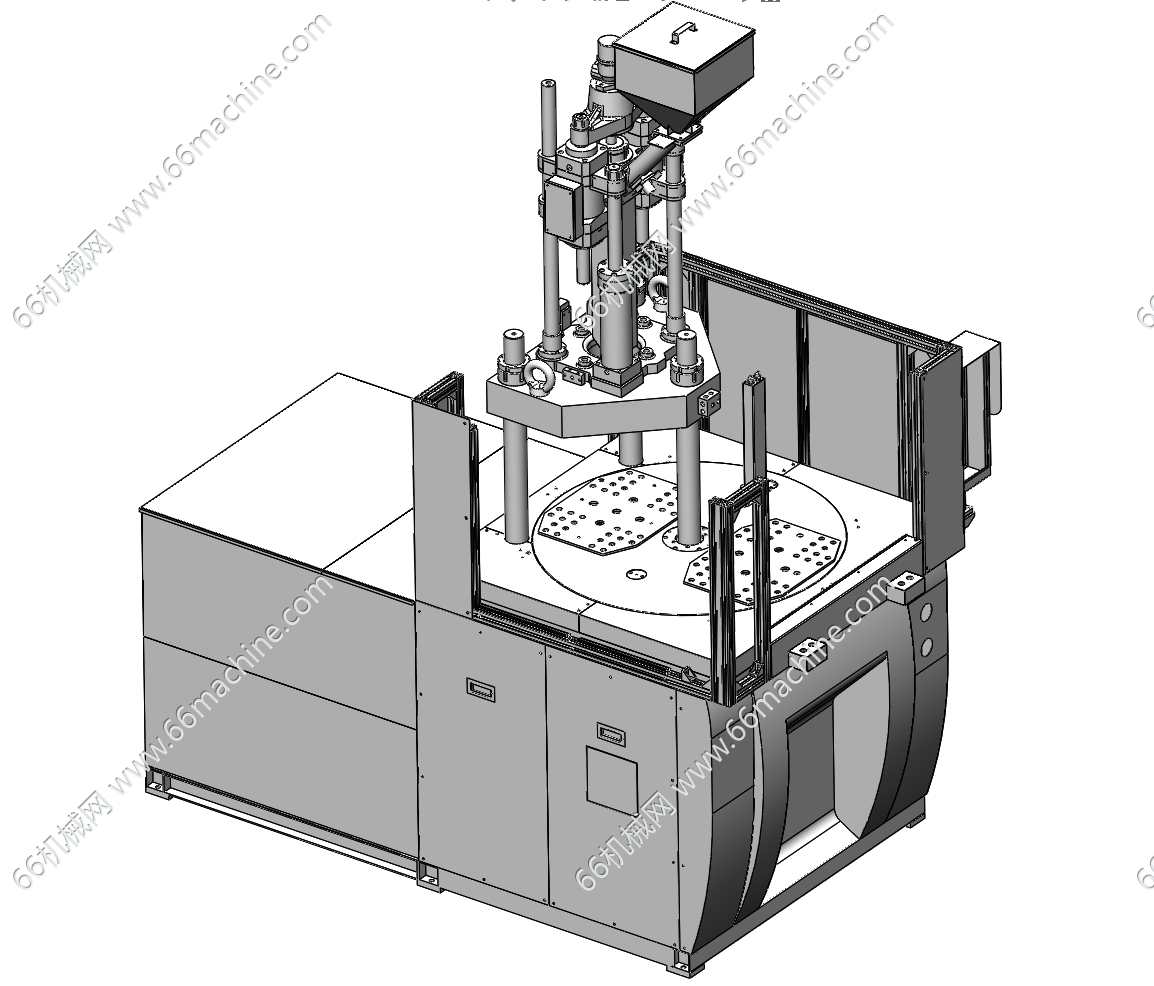 本模型为片状塑件成型及收料机,主要由立式注塑机、双机械手搬运机、双工位储料机及安全防护栏组成,用于将注塑成型后的片状塑件借助机械手自动搬运并放入储料仓。