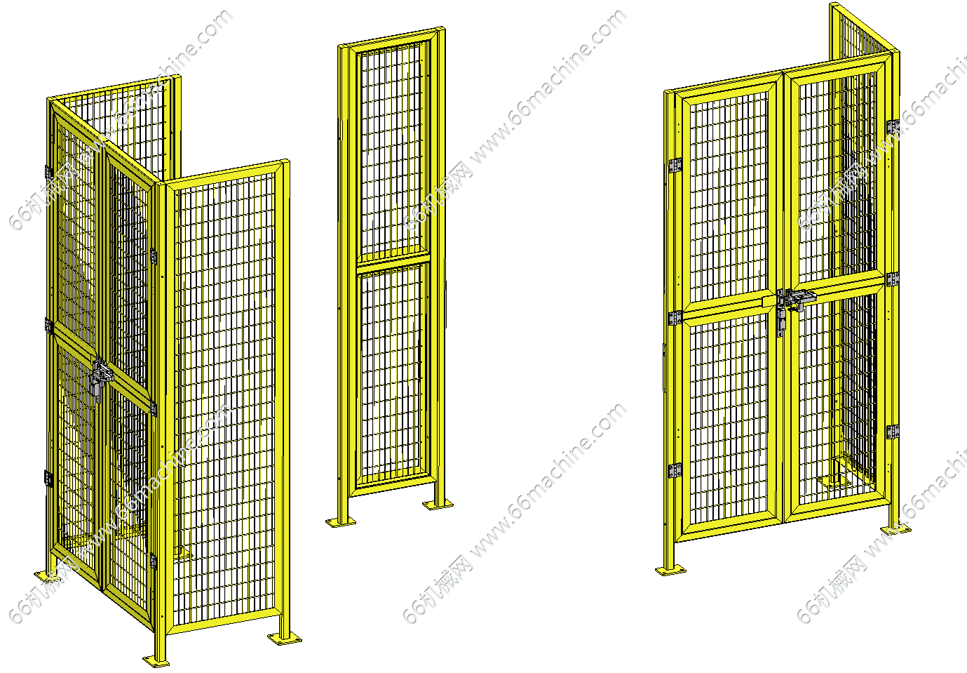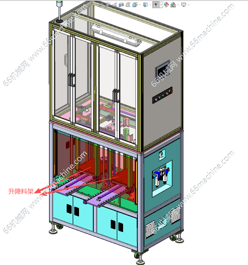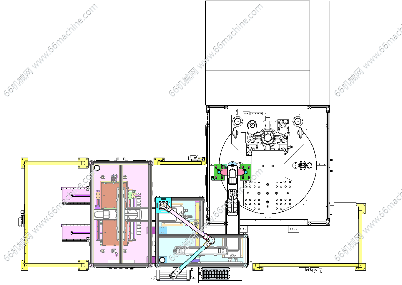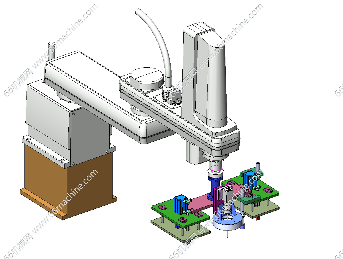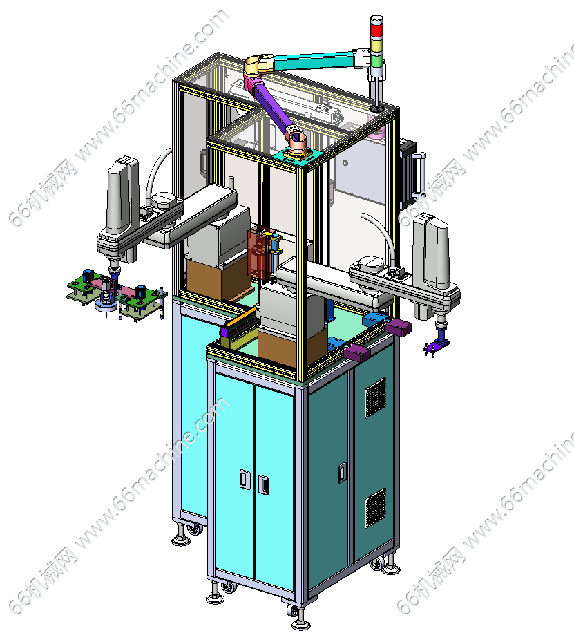 本模型为片状塑件成型及收料机,主要由立式注塑机、双机械手搬运机、双工位储料机及安全防护栏组成,用于将注塑成型后的片状塑件借助机械手自动搬运并放入储料仓。