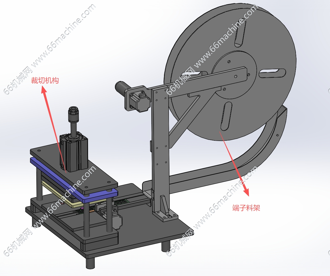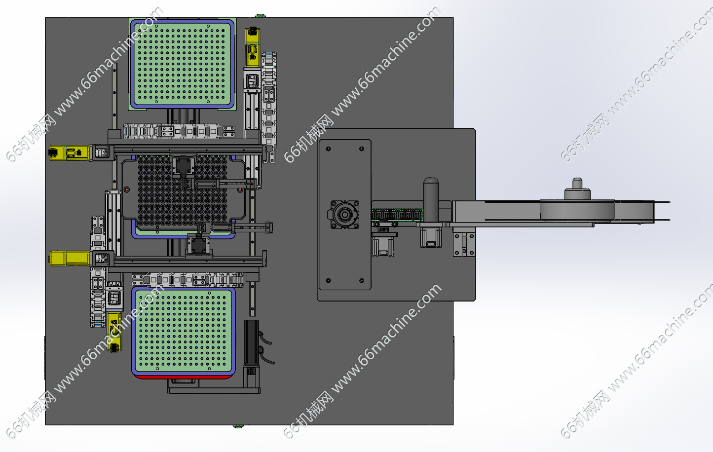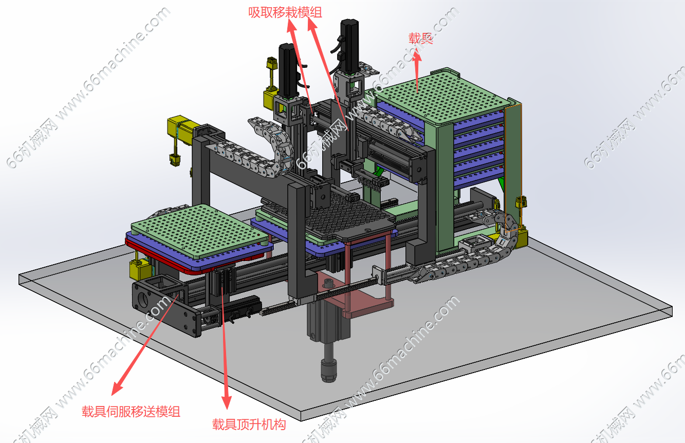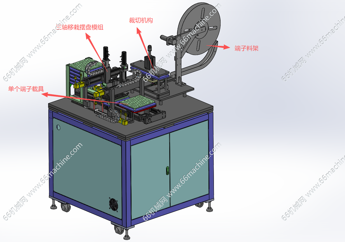 本模型为某企业端子裁切摆盘机,主要由下机架、机罩、三轴移栽摆盘模组、端子料架及裁切机构等组成,用于端子的自动裁切成PCS并摆盘(放入载具内)作业,欢迎下载参考!