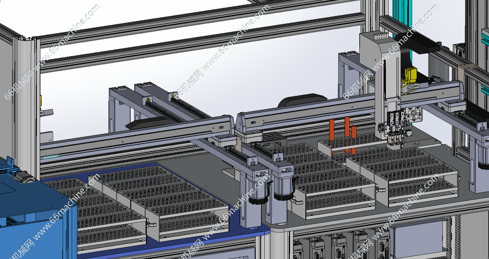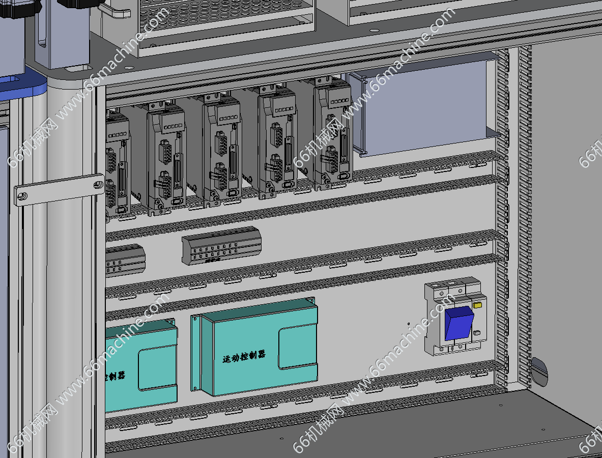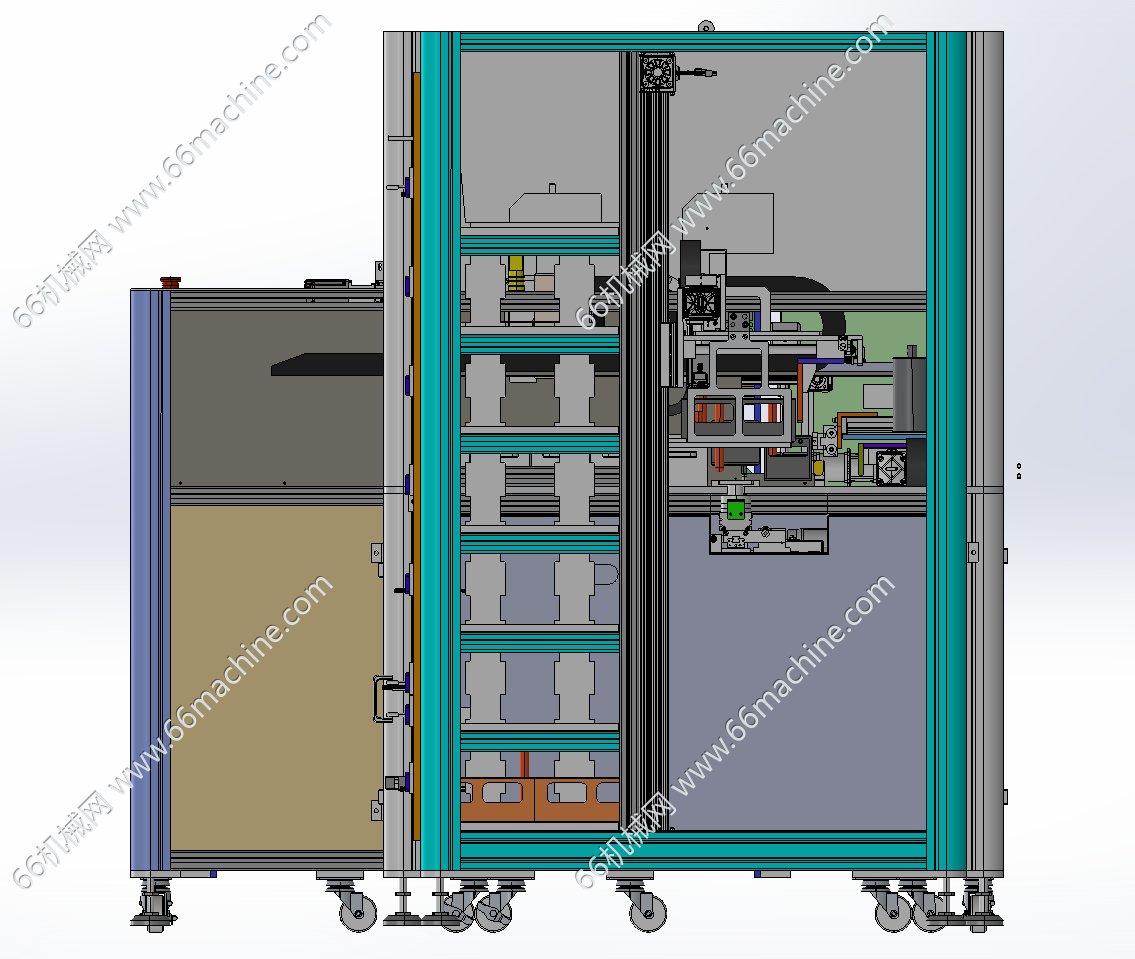 本设备为医疗试管挑样机,主要介绍如下: 1.待机:机械手处于安全位置,与各个模块都不冲突;气缸、传送带、打签机、贴标机、相机、升降机,待机; 2.准备工作:(空试管架摆放好,入料管推车载10个试管架推到指定位置锁死,空的收料架推车推到指定位置锁死,达到定位精度要求)各部分有传感器上报状态,表明是否可用; 3.扫描馏分架:(手动访问总控程序,提交仪器编号)主程序发送馏分架(入料架)个数,及动作指令,机械手移动,启动安装在Z轴上的视觉识别,扫描各馏分架上贴的二维码,上传数据到主程序; 4.核对:(主程序将馏分架编号与挑样表核对,无误后)将挑样表发送给平台2的主机,下达挑样指令; 5.推出空架:空架子气缸动作,推出底部一排7个空试管架,到传送带上,气缸返回,上层架子从斜面滑下;传送带运动固定长度,将空架运送到挑样位置,由视觉对各位点定位;(此时空架气缸运行,推出新一批空试管架) 6.挑样&贴签:机械手根据挑样表数据(包含目标试管的源位置与目标位置数据),按顺序挑样,机械手运动到目标试管上方,下降,抓起试管,上升约18cm,移动到目标位置上方,放下;每个入料管架及收料管架的四角和中心定位要准确; 6.1 每一类样品的第1管,打标签,机械手移动到指定位置(贴标机),旋转,贴标签(打标签的时间为挑管同时,打好标签等试管过来贴); 6.2 当目标试管(非贴签试管),两管挨在一起,则两个夹爪同时抓取,一并转移到目标位置,同时放下;若不挨在一起,则只有一个夹爪工作,每次转移一个试管; 6.3 试管分为两种型号,12.2*15cm,18*15cm,夹爪需要兼容两种规格; 7.传送:每挑完一个样品,传送带前进一定的距离(根据实际使用了几个试管架,目标架移动到挑样位置),视觉定位,进行新一类样品的抓取和转移;每当可升降传送带上达到10个试管架,根据系统程序的数据,升降机运行到指定层,摆料机把10个试管架逐个分别推入指定位置,升降机回到正常高度(此过程中固定高度的传送带暂不输送样品,或添加保护装置); 8.空架气缸:当一垛空管架用完时,传感器发送信号,气缸的行程要相应调整; 9.收料架:当收料架某层码放满了,后边还有样品要往该层放时,发出警报提醒更换,更换后重置该层数据,继续中断的工作; 10.填试管架功能:空架子换成16*6孔的试管架,入料管推车换成空试管吐出装置,传送带将空架子移动到适当位置,停止,视觉识别定位,机械手将吐出的试管一根一根拿起来,视觉判断是否有破损,有则丢到废管箱,没有则填到试管架上;满架则移动传送带,由升降机和气缸转移到储存架上。初期试管架不允许平推,需要手动搬上搬下试管架。x-t格式,可用多种3D软件(PROE\UG\solidworks等)打开,仅供专业技术人员参考学习之用!