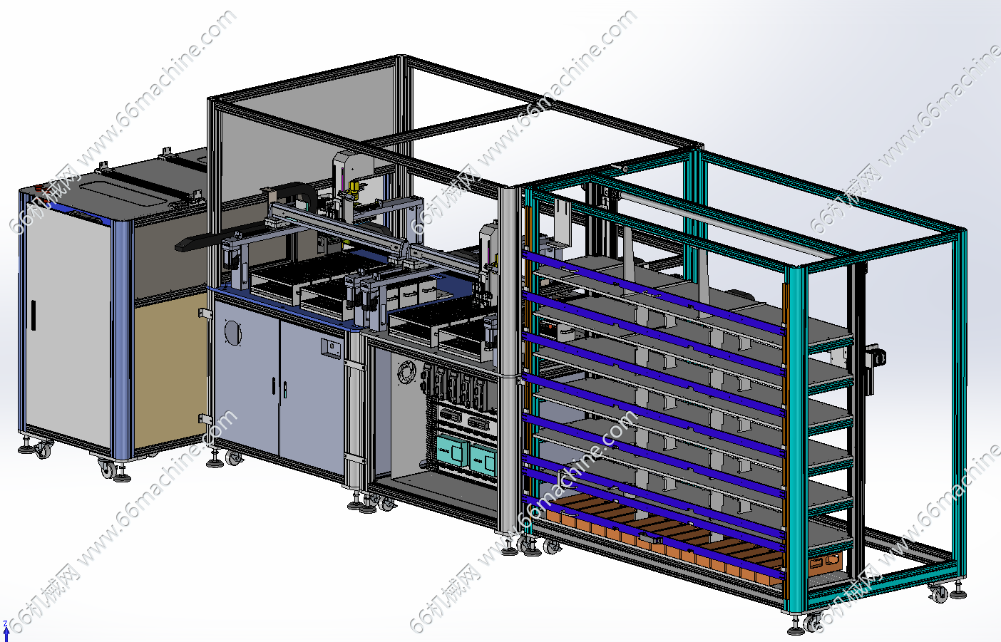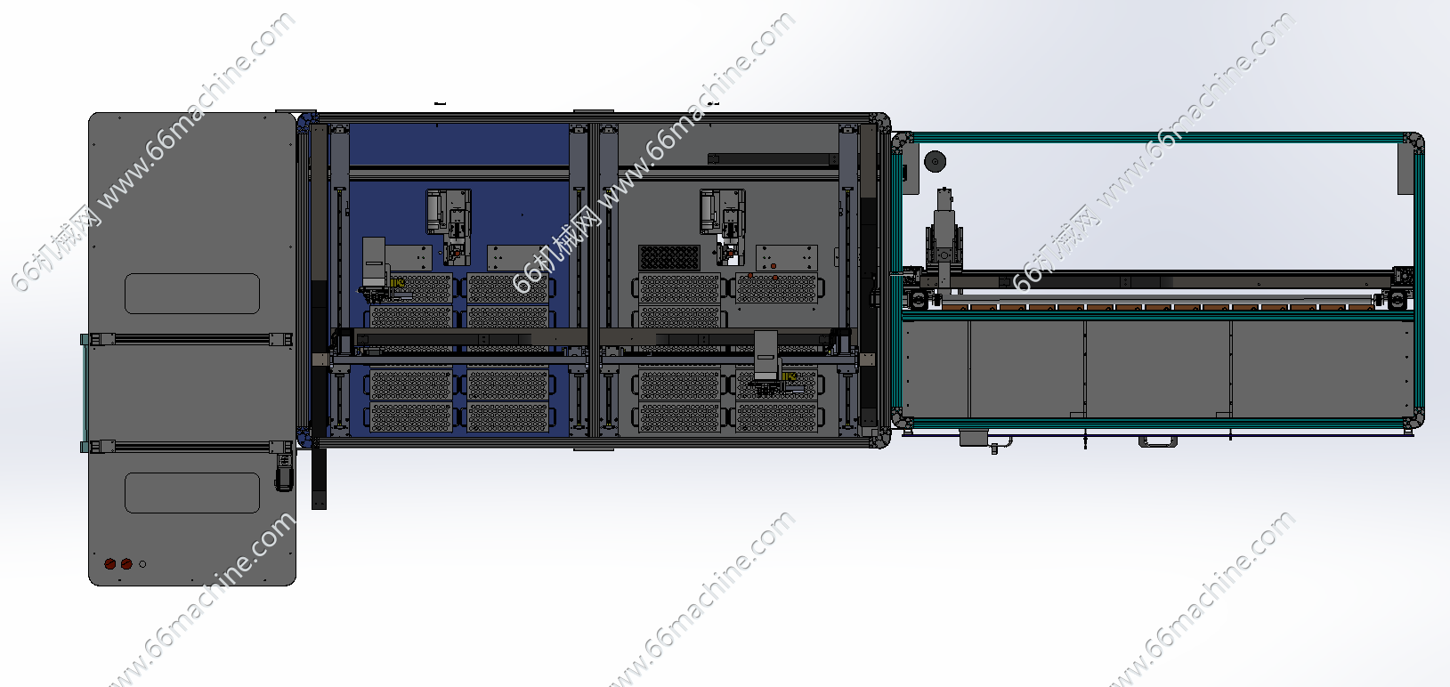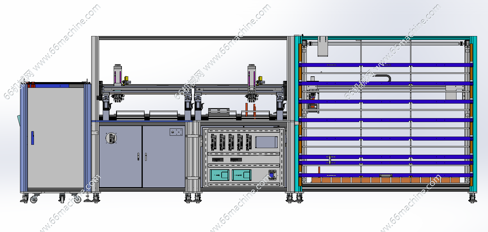 本设备为医疗试管挑样机,主要介绍如下: 1.待机:机械手处于安全位置,与各个模块都不冲突;气缸、传送带、打签机、贴标机、相机、升降机,待机; 2.准备工作:(空试管架摆放好,入料管推车载10个试管架推到指定位置锁死,空的收料架推车推到指定位置锁死,达到定位精度要求)各部分有传感器上报状态,表明是否可用; 3.扫描馏分架:(手动访问总控程序,提交仪器编号)主程序发送馏分架(入料架)个数,及动作指令,机械手移动,启动安装在Z轴上的视觉识别,扫描各馏分架上贴的二维码,上传数据到主程序; 4.核对:(主程序将馏分架编号与挑样表核对,无误后)将挑样表发送给平台2的主机,下达挑样指令; 5.推出空架:空架子气缸动作,推出底部一排7个空试管架,到传送带上,气缸返回,上层架子从斜面滑下;传送带运动固定长度,将空架运送到挑样位置,由视觉对各位点定位;(此时空架气缸运行,推出新一批空试管架) 6.挑样&贴签:机械手根据挑样表数据(包含目标试管的源位置与目标位置数据),按顺序挑样,机械手运动到目标试管上方,下降,抓起试管,上升约18cm,移动到目标位置上方,放下;每个入料管架及收料管架的四角和中心定位要准确; 6.1 每一类样品的第1管,打标签,机械手移动到指定位置(贴标机),旋转,贴标签(打标签的时间为挑管同时,打好标签等试管过来贴); 6.2 当目标试管(非贴签试管),两管挨在一起,则两个夹爪同时抓取,一并转移到目标位置,同时放下;若不挨在一起,则只有一个夹爪工作,每次转移一个试管; 6.3 试管分为两种型号,12.2*15cm,18*15cm,夹爪需要兼容两种规格; 7.传送:每挑完一个样品,传送带前进一定的距离(根据实际使用了几个试管架,目标架移动到挑样位置),视觉定位,进行新一类样品的抓取和转移;每当可升降传送带上达到10个试管架,根据系统程序的数据,升降机运行到指定层,摆料机把10个试管架逐个分别推入指定位置,升降机回到正常高度(此过程中固定高度的传送带暂不输送样品,或添加保护装置); 8.空架气缸:当一垛空管架用完时,传感器发送信号,气缸的行程要相应调整; 9.收料架:当收料架某层码放满了,后边还有样品要往该层放时,发出警报提醒更换,更换后重置该层数据,继续中断的工作; 10.填试管架功能:空架子换成16*6孔的试管架,入料管推车换成空试管吐出装置,传送带将空架子移动到适当位置,停止,视觉识别定位,机械手将吐出的试管一根一根拿起来,视觉判断是否有破损,有则丢到废管箱,没有则填到试管架上;满架则移动传送带,由升降机和气缸转移到储存架上。初期试管架不允许平推,需要手动搬上搬下试管架。x-t格式,可用多种3D软件(PROE\UG\solidworks等)打开,仅供专业技术人员参考学习之用!
