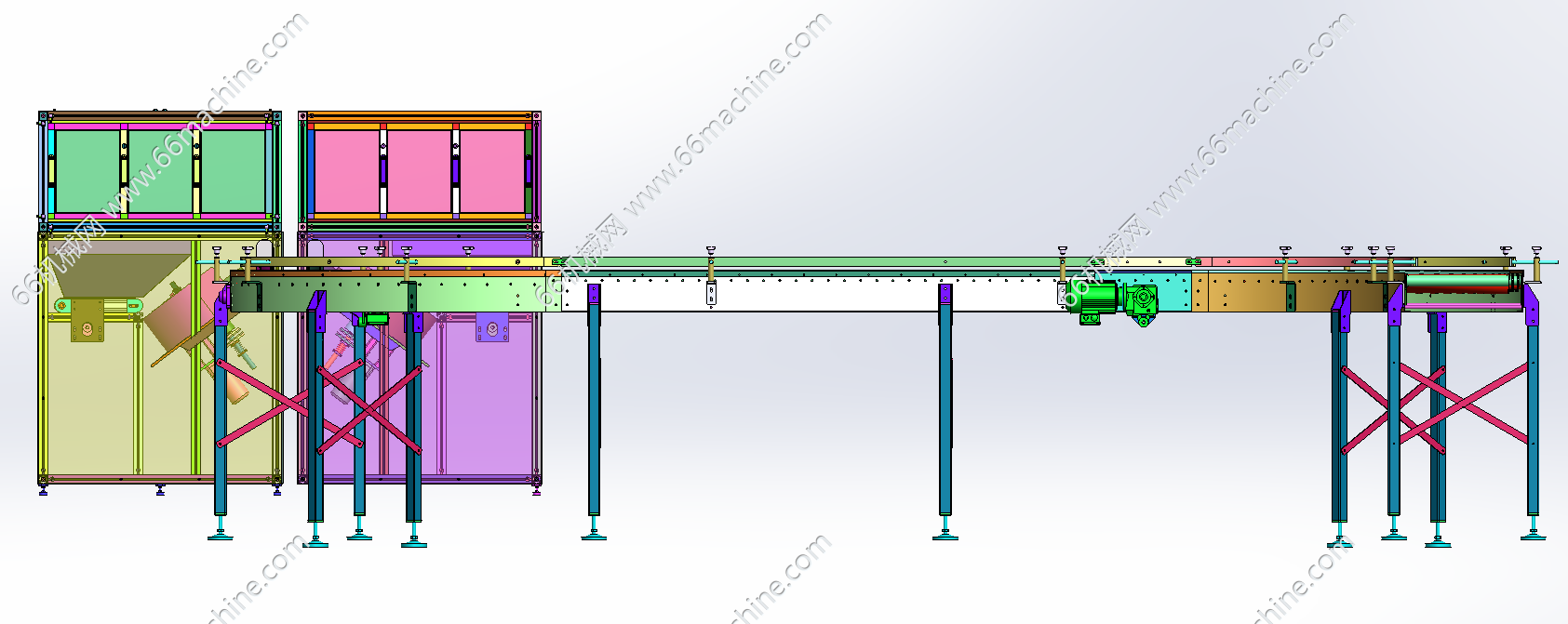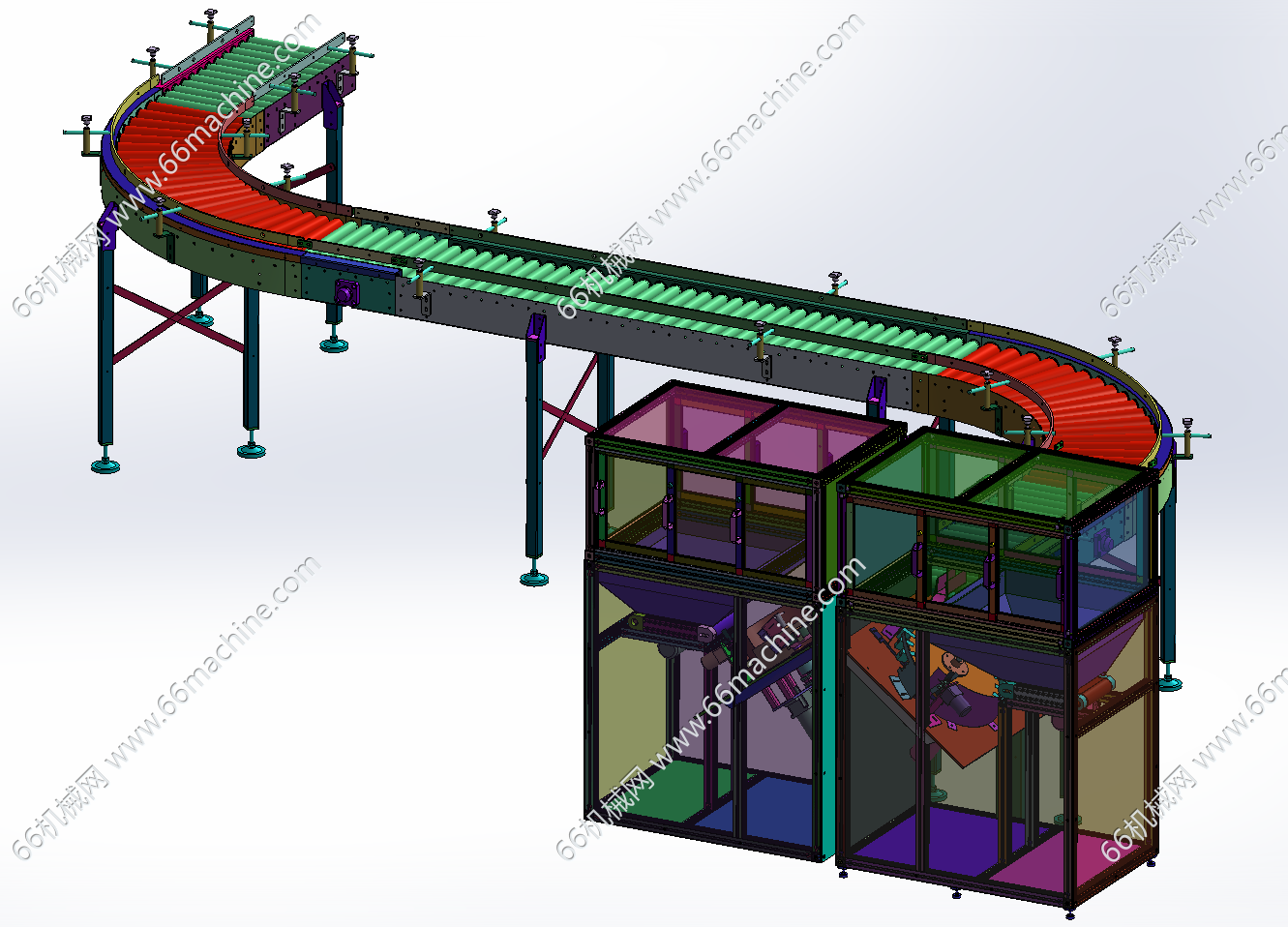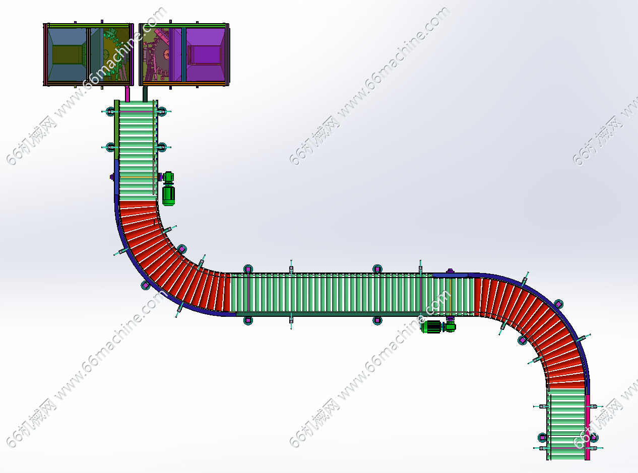 本模型为饮料瓶、药瓶等瓶类整理机(理瓶机),主要由双理瓶机及S型滚筒输送线组成,用于将不规整的瓶放入设备中,设备自动将瓶进行统一方向整理并由滚筒线流出。