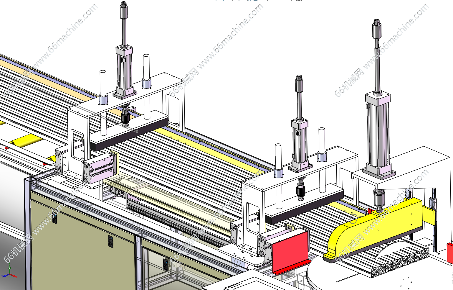【企业模型,,可做参照,使用时可自行编辑,仅供专业技术人员参考学习之用!】 本模型为铝型材自动切割机,属于直切斜切一体机,适合切长料,需要人工上料,然后辅助定位机构定位,送料机构加紧,按客户设定需求送料,最后切割完成后依次掉落到下料输送皮带线。本模型包含所有零部件,建模精巧,绝对精品,可供大家探讨学习!