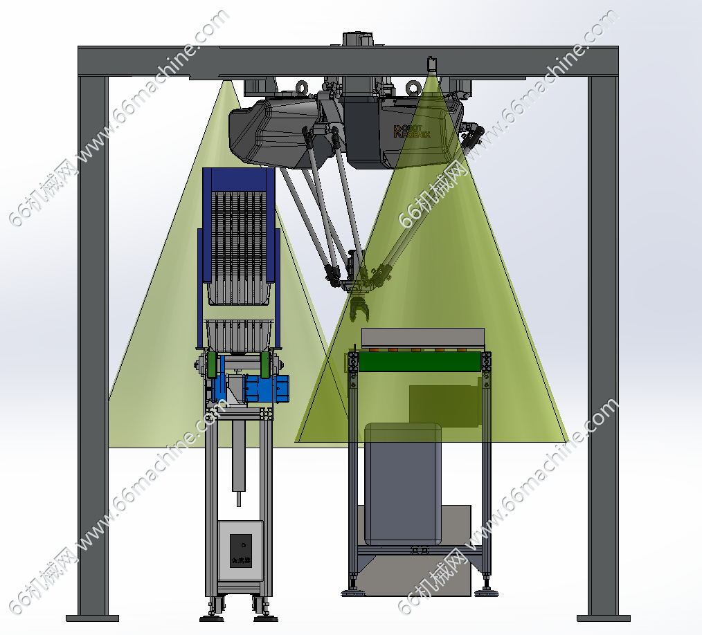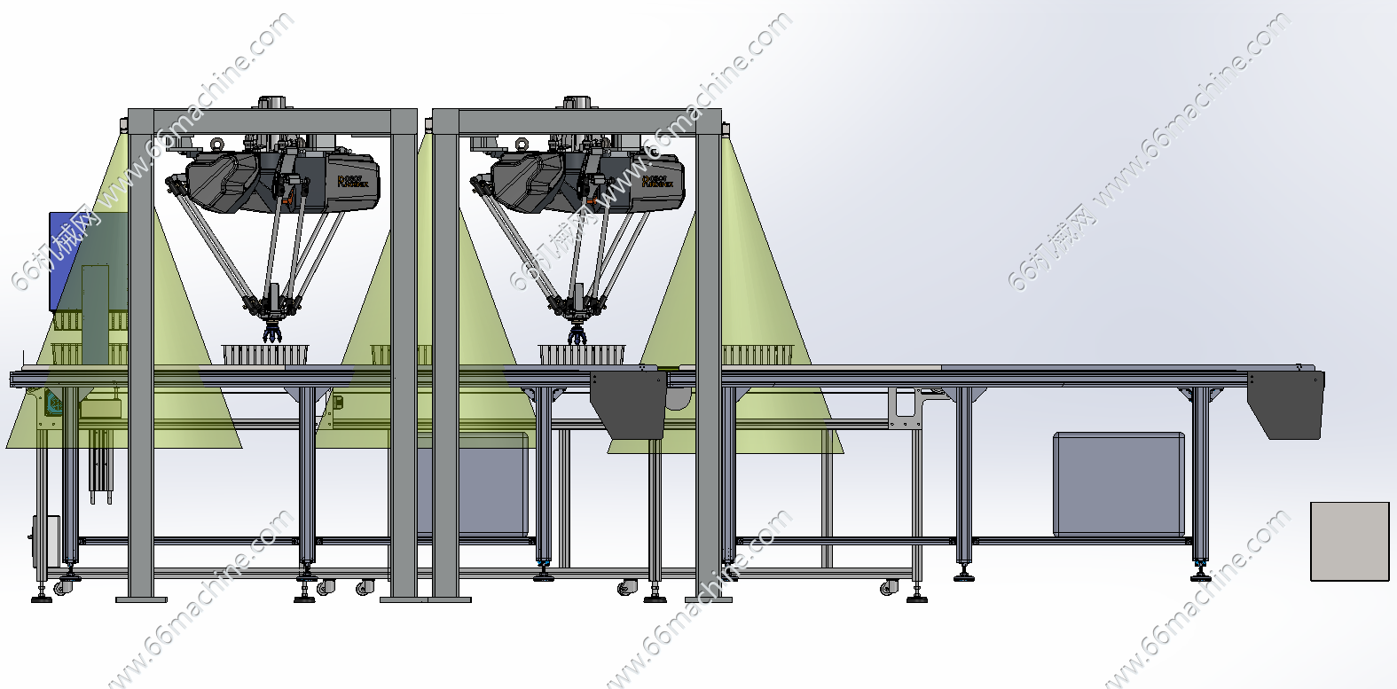 本模型为基于蜘蛛机械手的分拣机,主要由零件输送皮带线、料盒双列同步带输送线、两组下料蜘蛛机械手及视觉模组等组成,通过视觉相机对位置进行确认,通过蜘蛛机械手进行快速分拣装盒,该设备通用性强,仅供大家参考!