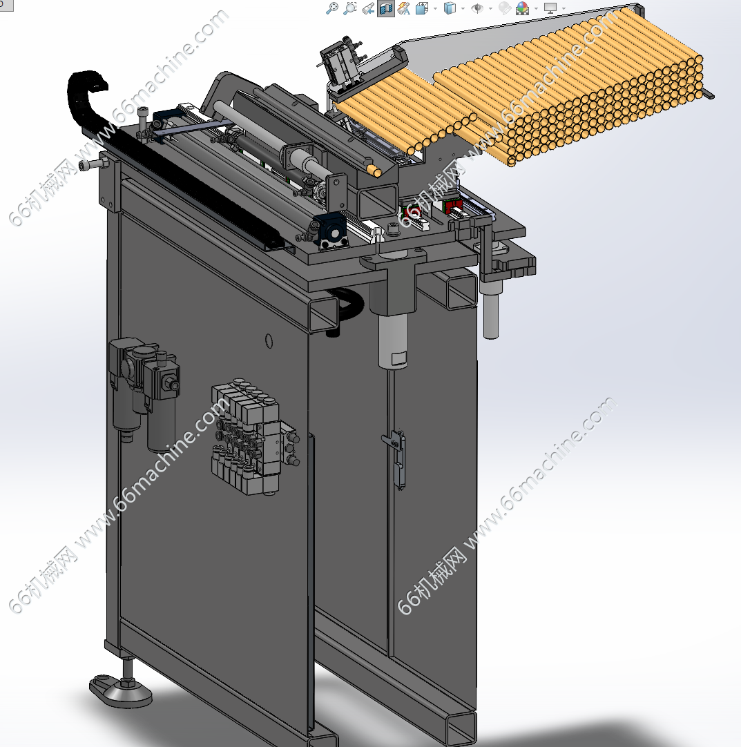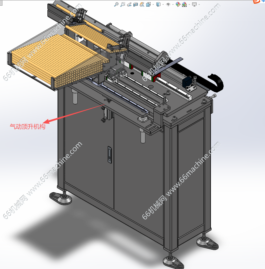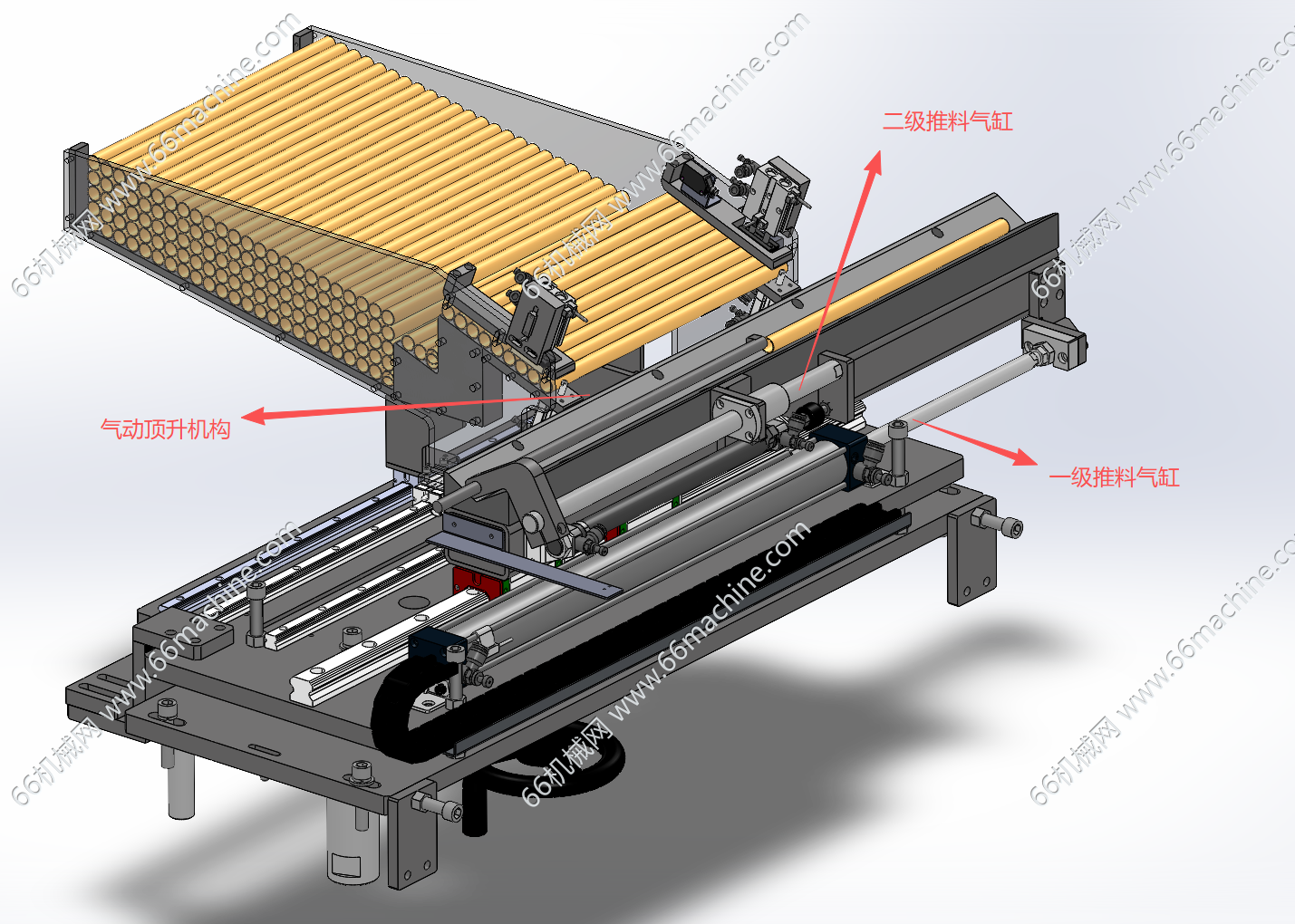 本模型为某企业管柱件自动上料机,采用气动顶升机构将料仓内的管柱件顶升上料,二级气动横移机构进行推出料,适用于各种管柱件产品的自动上料,欢迎下载参考!