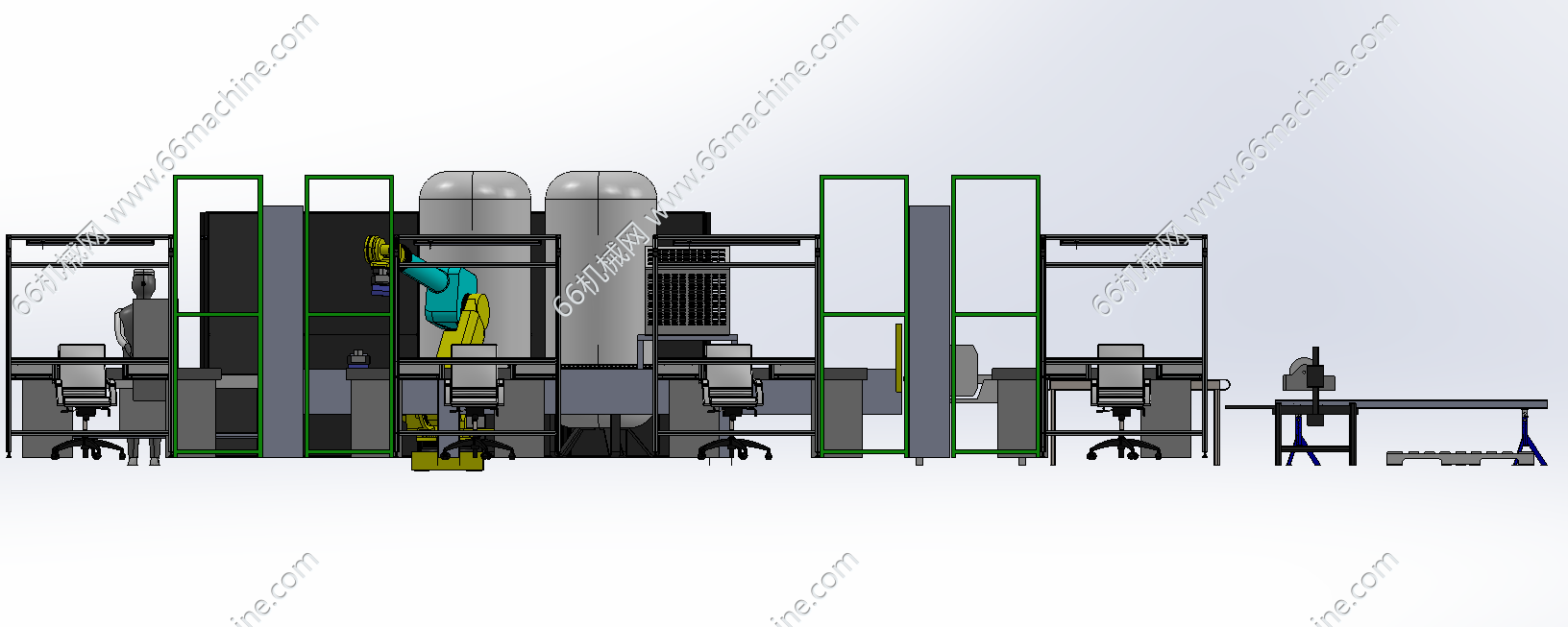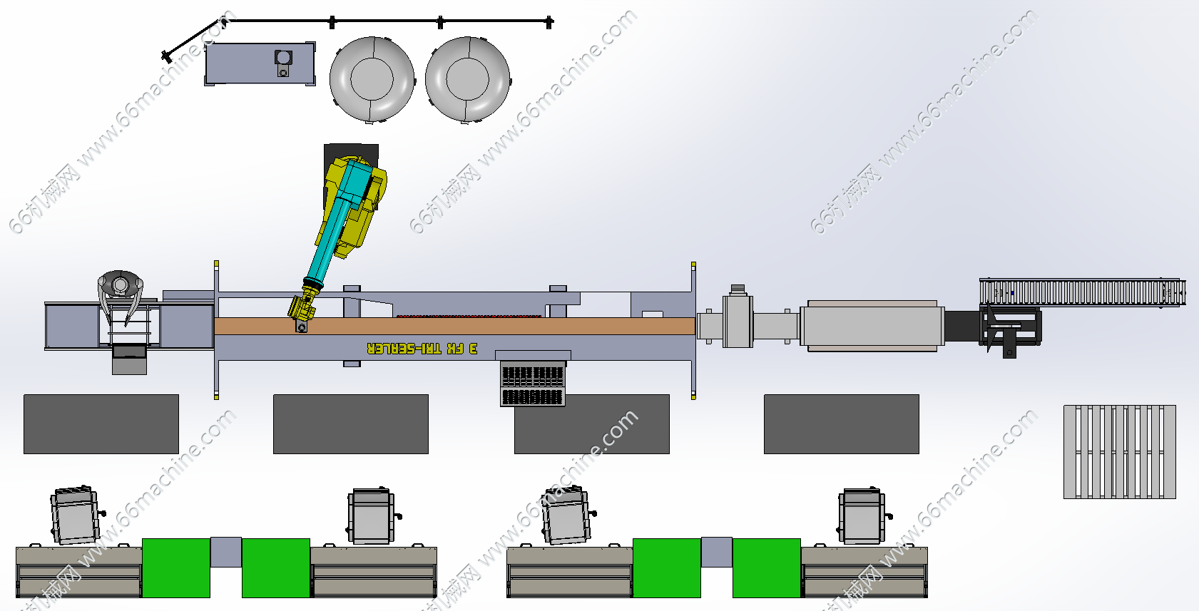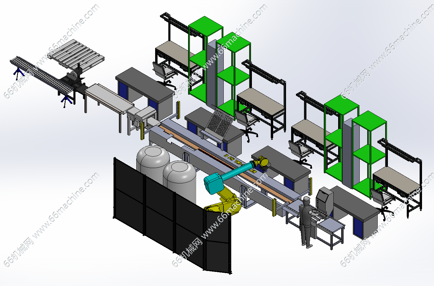 本模型为基于机器人的胶合板自动化配送系统,原料精准配料后,由输送线运至加工工位,配套的物料架用于暂存半成品,实现原料从存储、配料到初步加工的自动化流转,提升配料精度与生产效率。