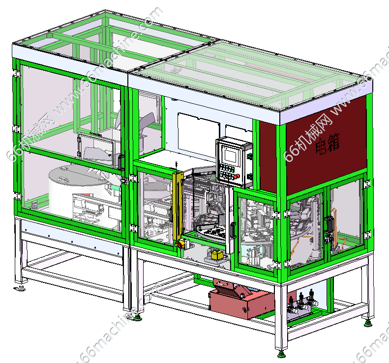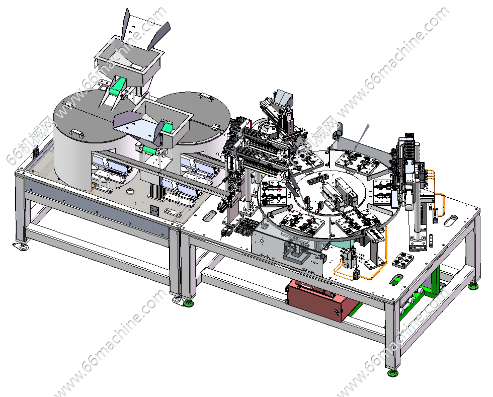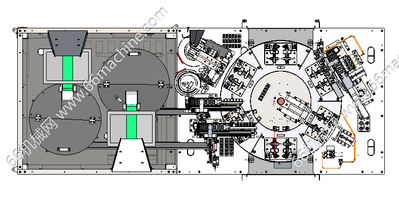 设备采用全自动转盘进行小电机齿轮箱装配,设备生产稳定可靠,结构紧凑合理。电机采用人工上下料,上下壳盖、垫片、密封圈等均采用振动料盘进行自动上料,设备包含如下工艺:电机上料及检测、上下壳盖自动上料、垫片自动上料装配、密封圈自动上料装配、数量检测及涂油、电机装配、螺杆涂油等。